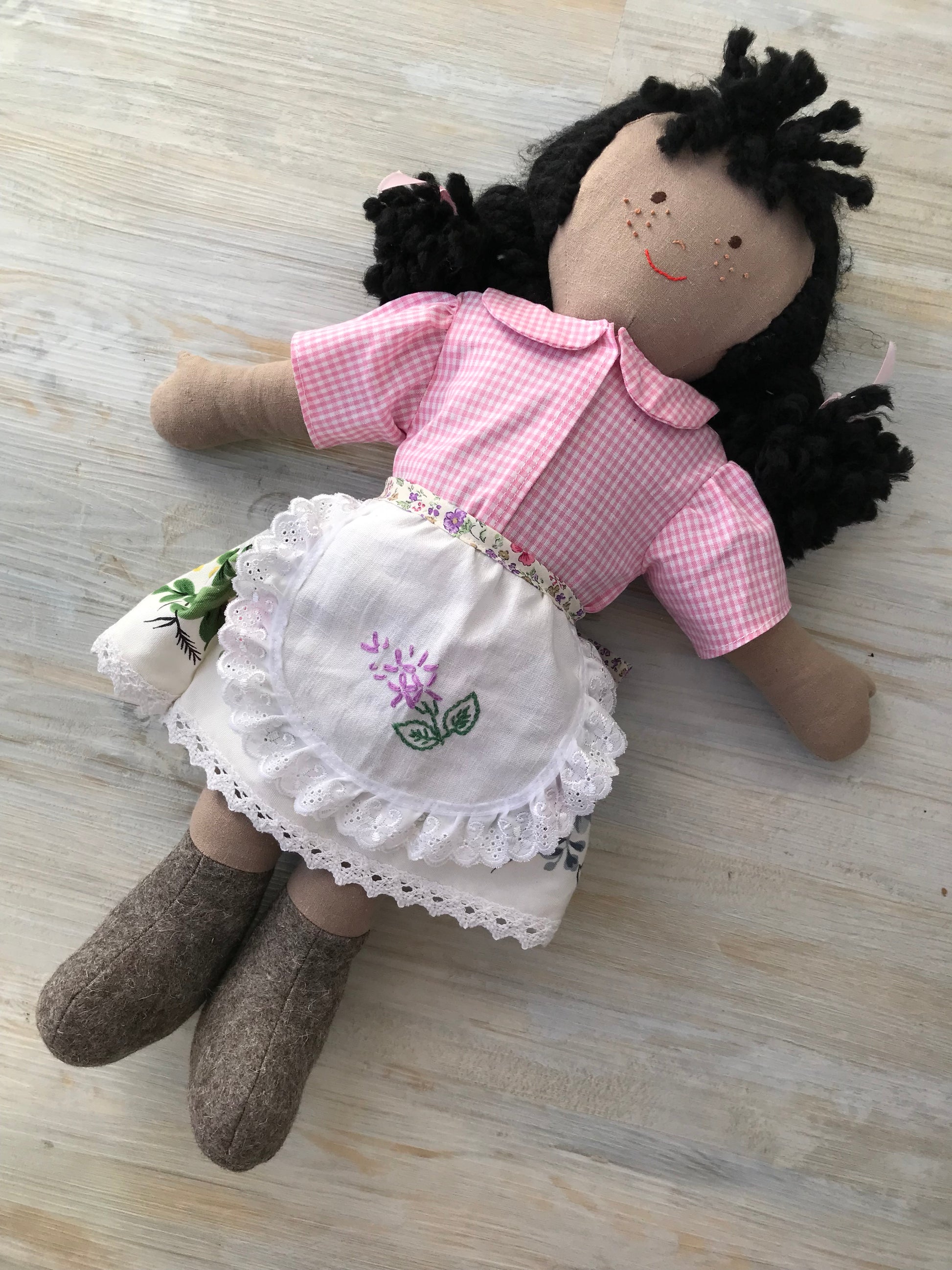 A perfect little apron for one of The Jemima Company’s rag dolls or your very own doll or toy. It makes the perfect addition to an outfit and will complement some imaginative play in the kitchen or workshop - it’s very important for a rag doll to cover up before a messy job! This apron is made from a beautiful, hand-embroidered table cloth, with floral ribbon ties and a lace trim. It can be hand-or machine-washed. Have a look at our photographs to see the measurements to see if it will fit your own doll or toy.