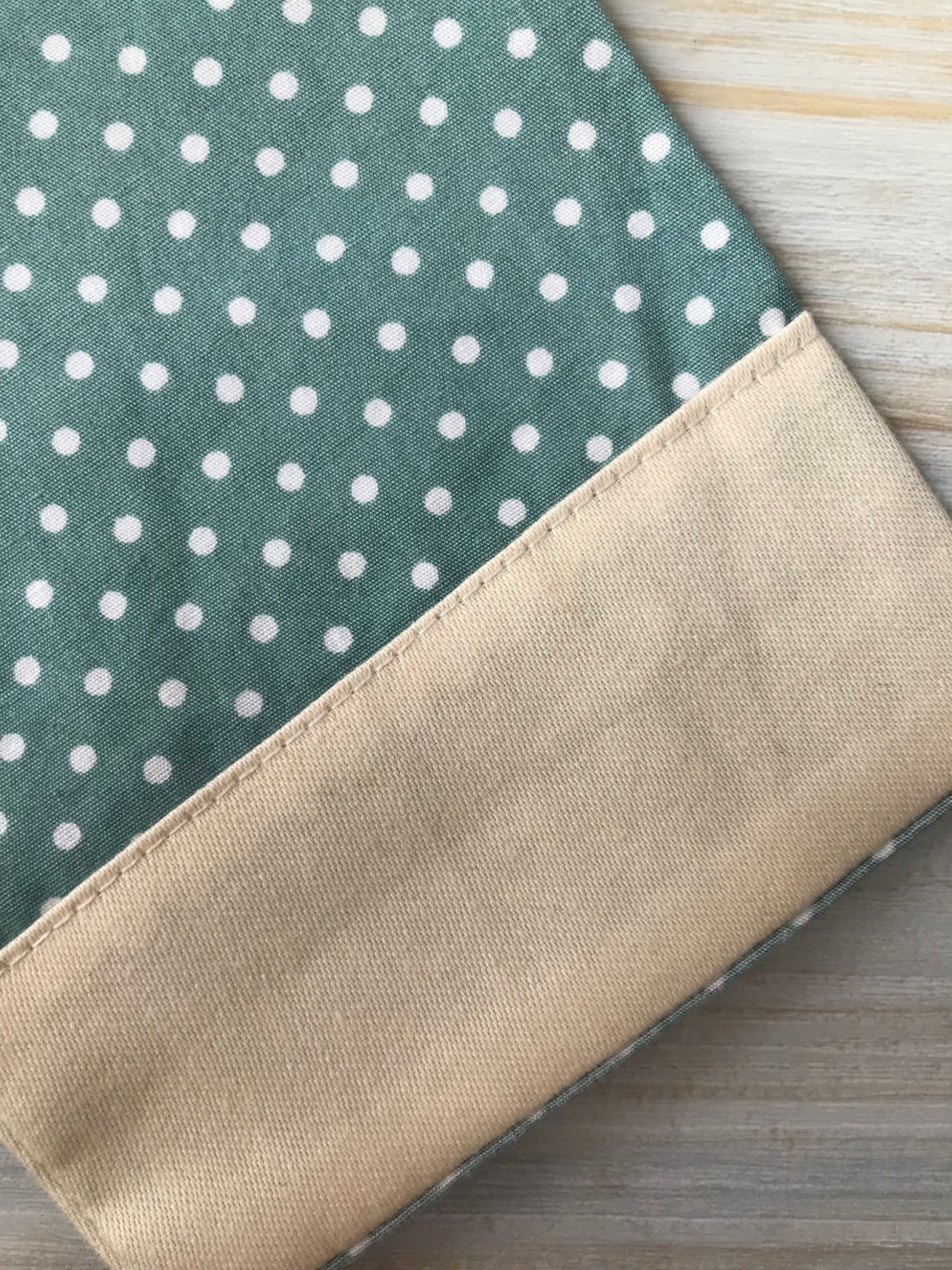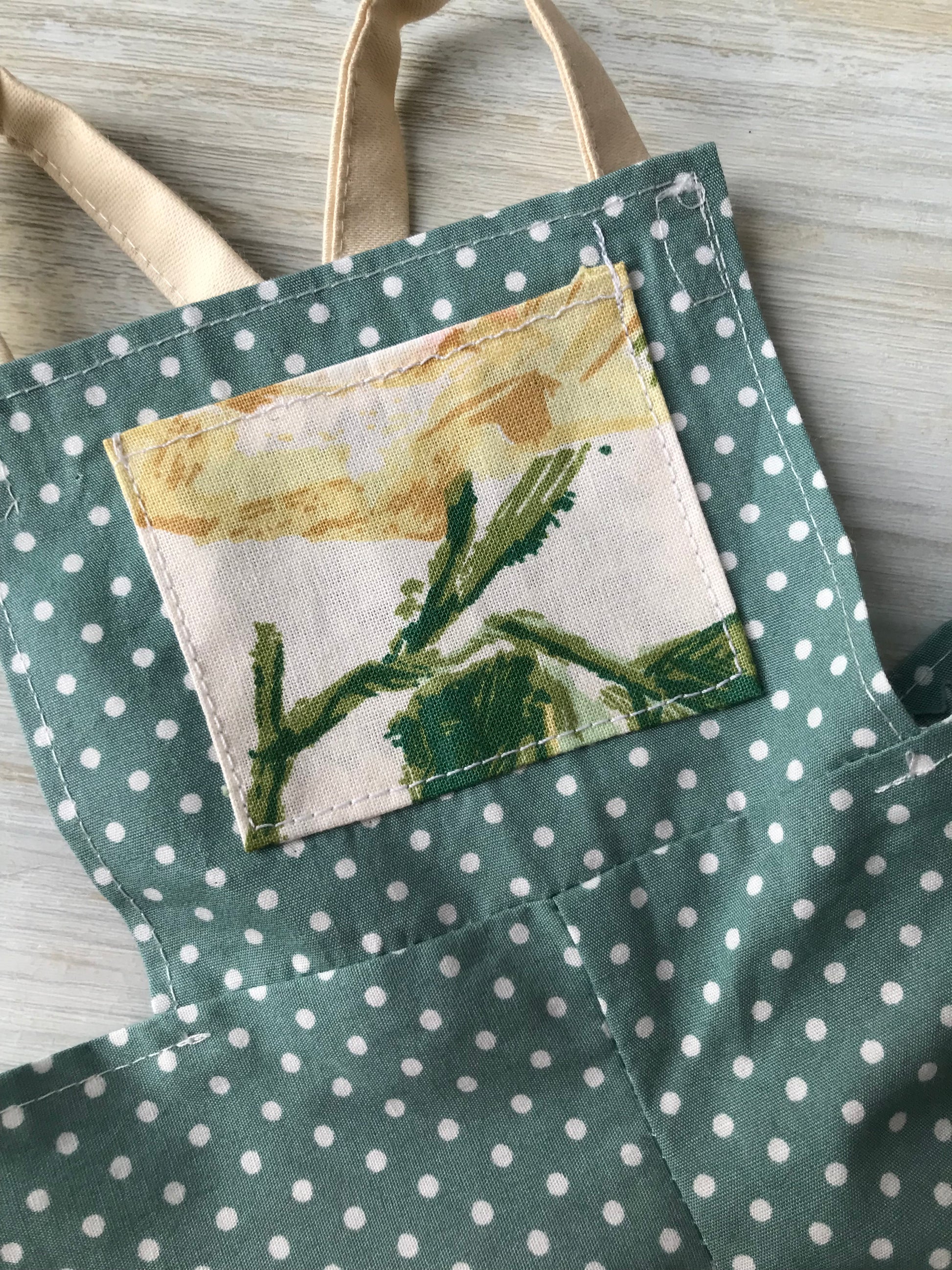 The dungarees are made from a beautiful polka-dot and green cotton fabric with a patterned pocket. The turn-ups and straps are made from beige cotton fabric. There is velcro on the straps and bib.