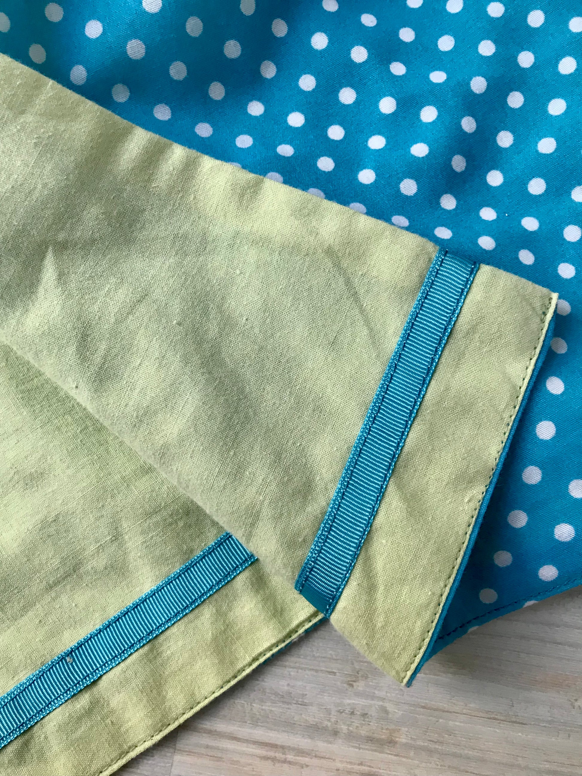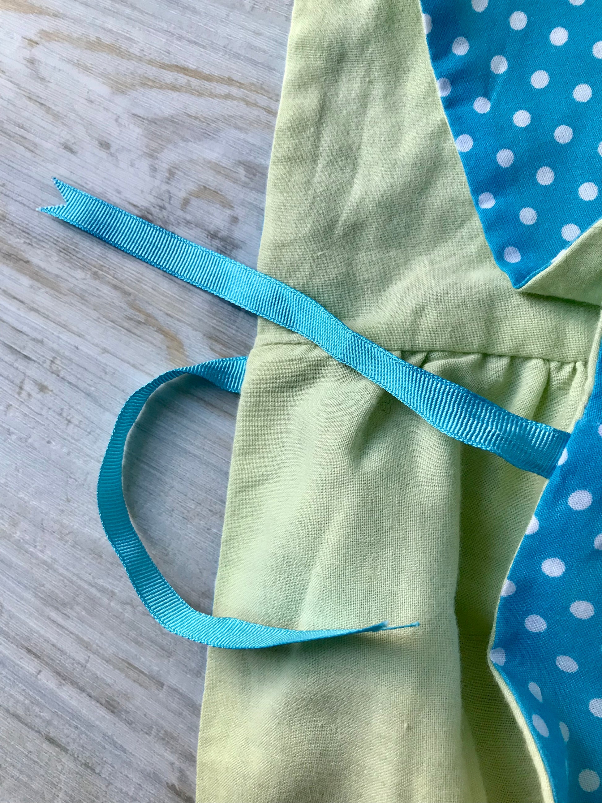 This cloak is reversible and has a turquoise and white polka dot fabric on one side and a pale green fabric with turquoise grosgrain ribbon trim on the other. The cloak is tied with grosgrain ribbon ties and has a useful hood to protect your doll from the elements.