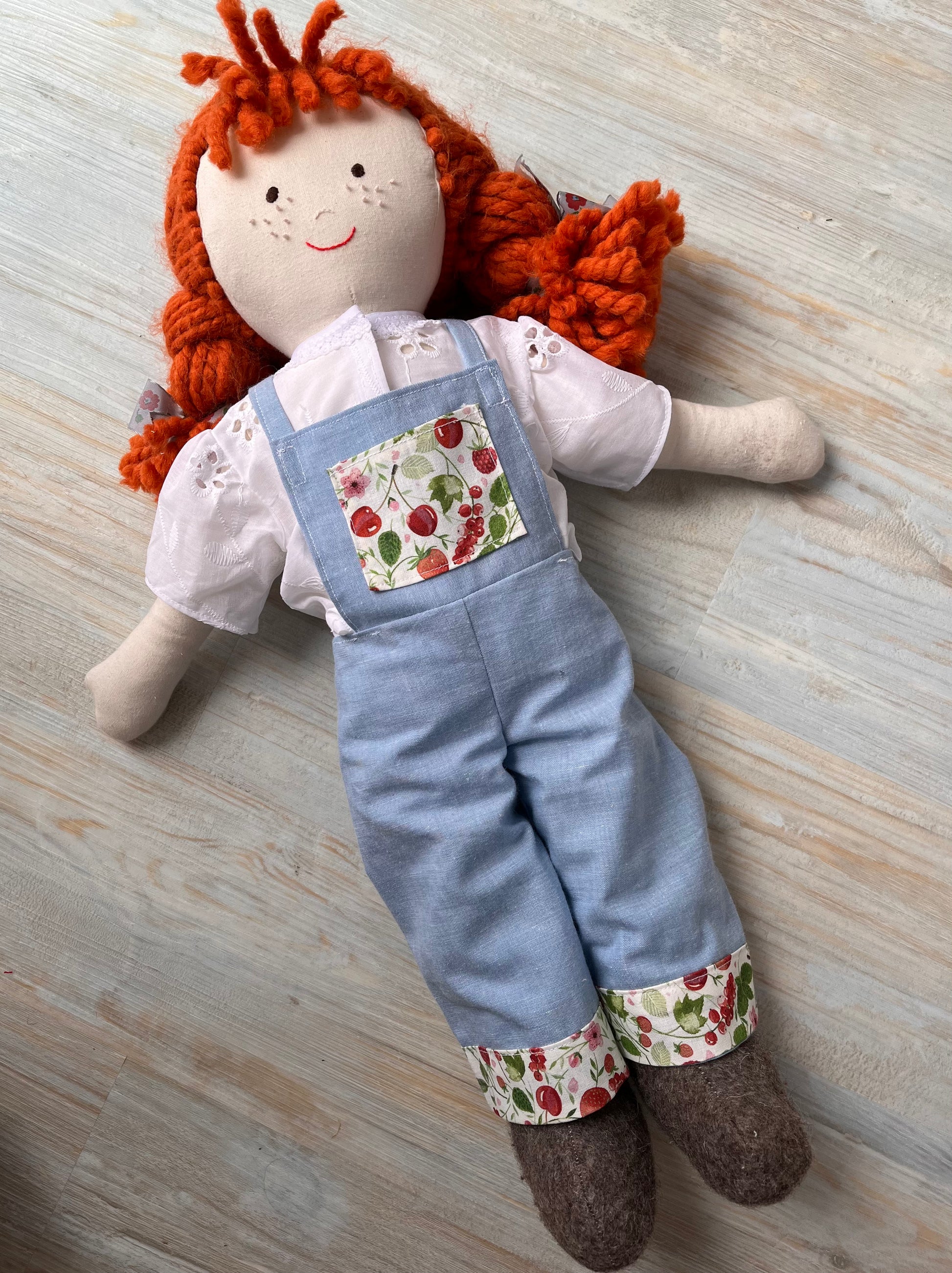 A beautiful set of dolls dungarees and blouse, made to fit The Jemima Company dolls but which may well fit your own doll or toy. Have a look at our photographs to see the full measurements.