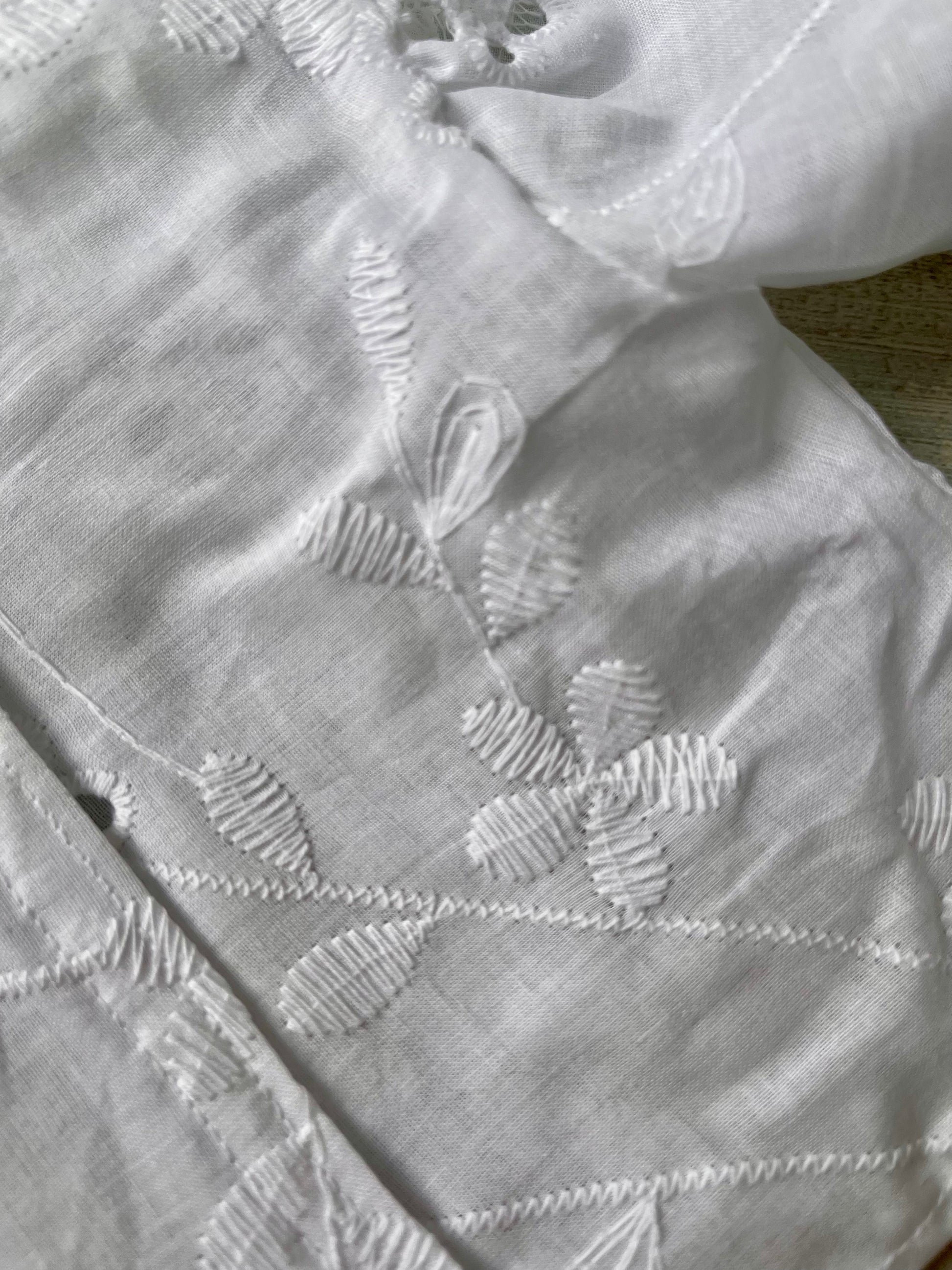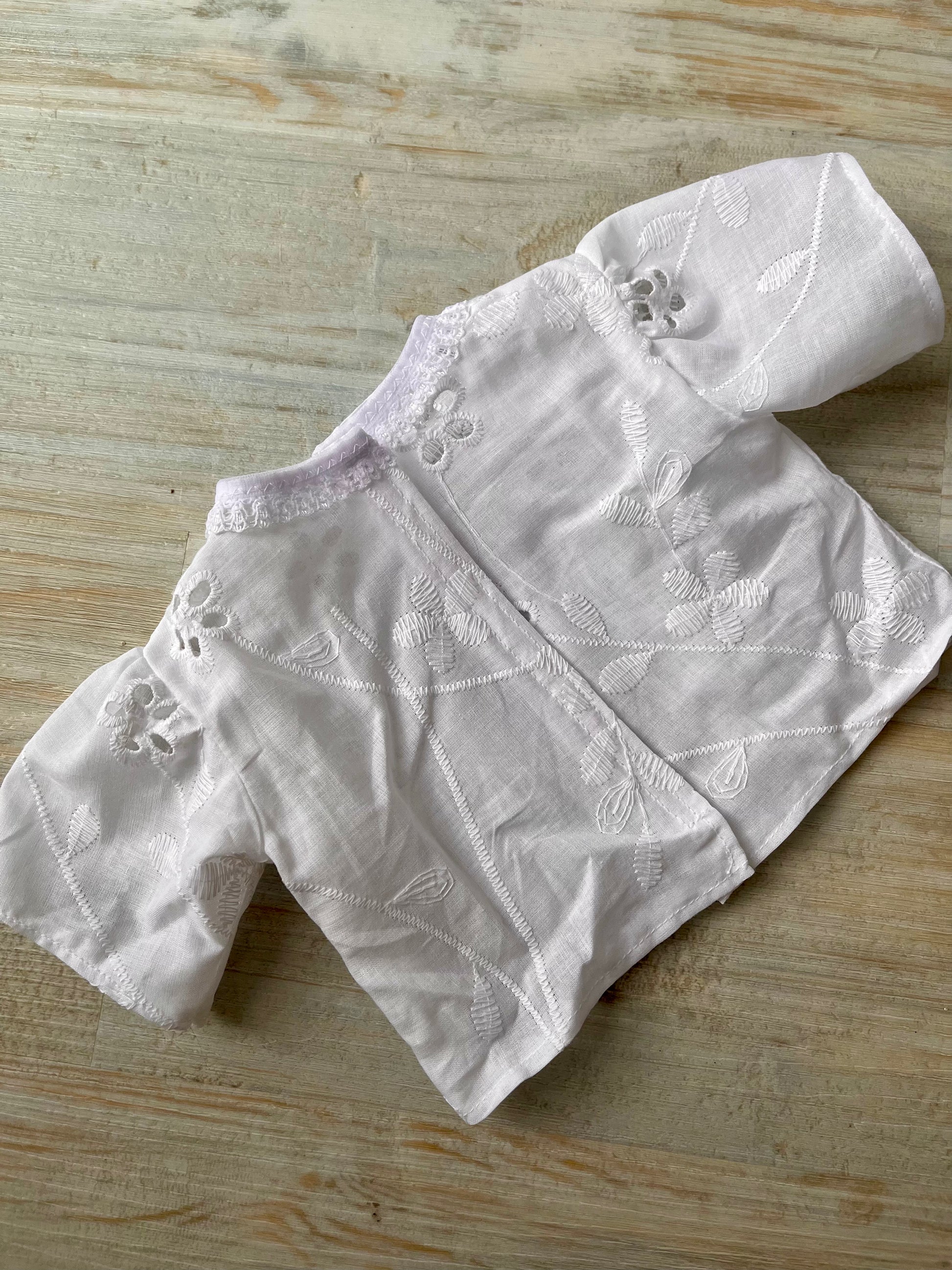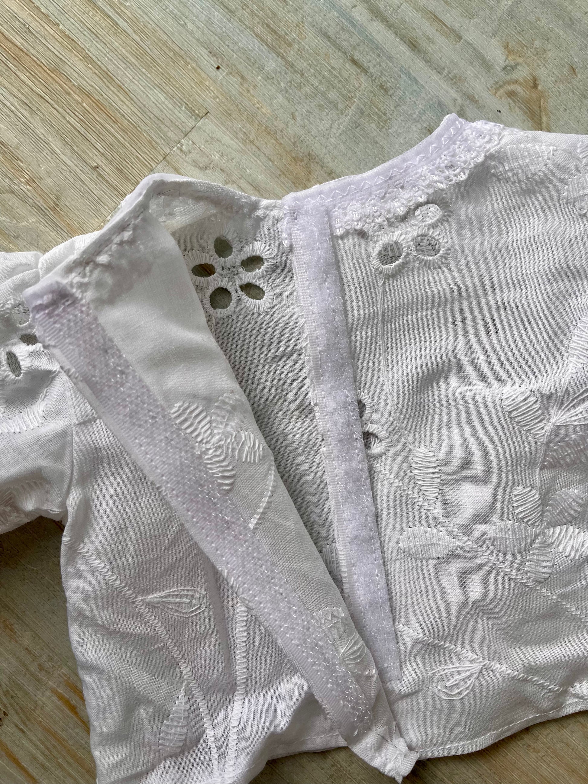 The blouse is made from a beautiful Broderie Anglaise cotton fabric, has short sleeves and a lace trim collar. The blouse has a velcro opening down the front.