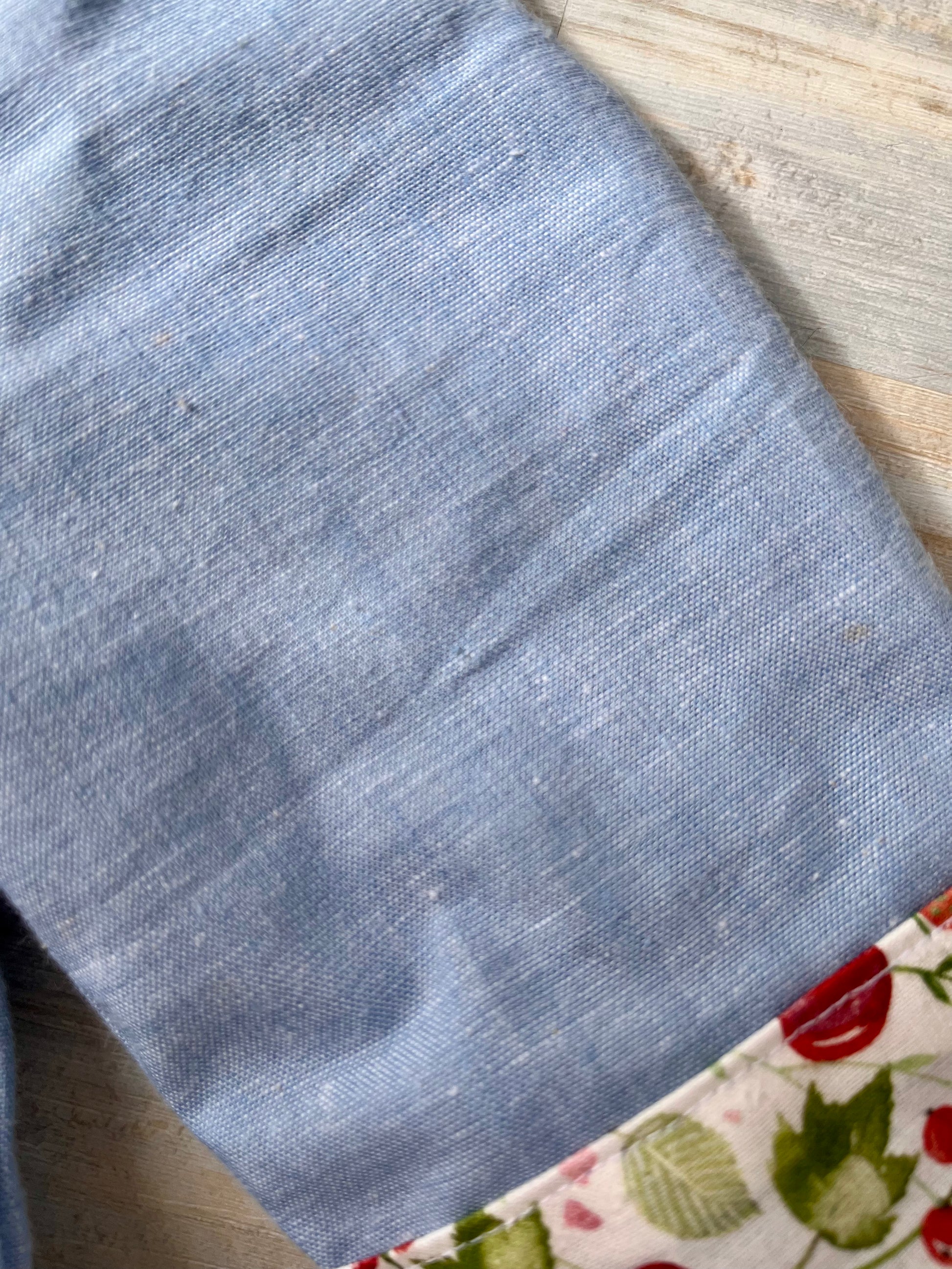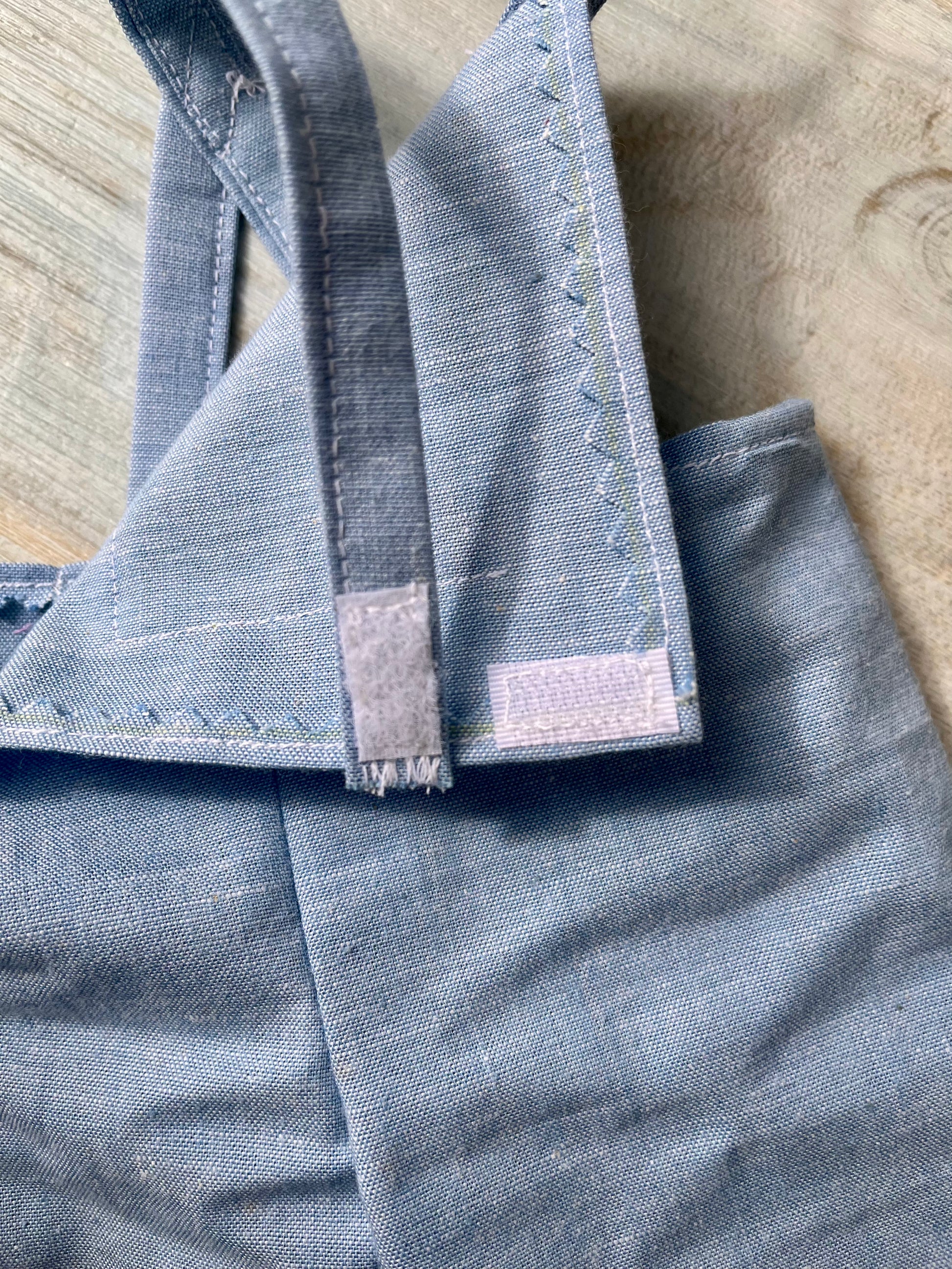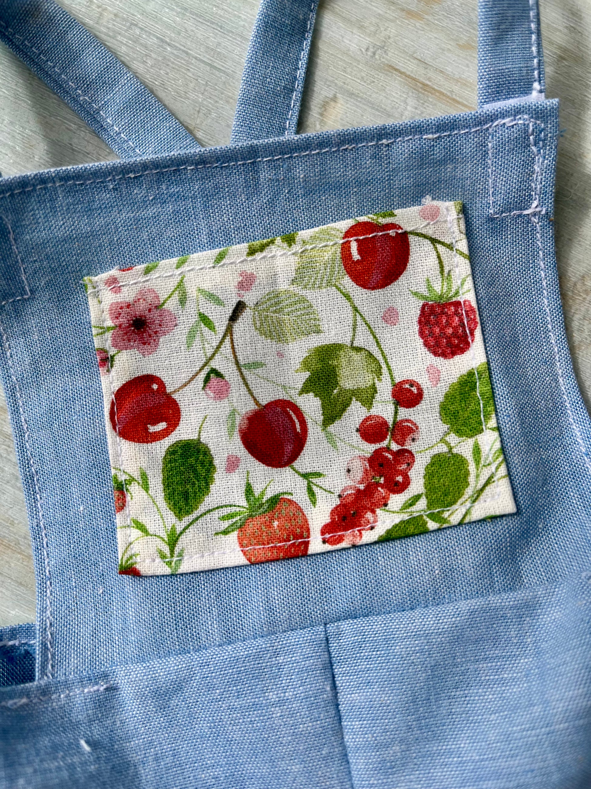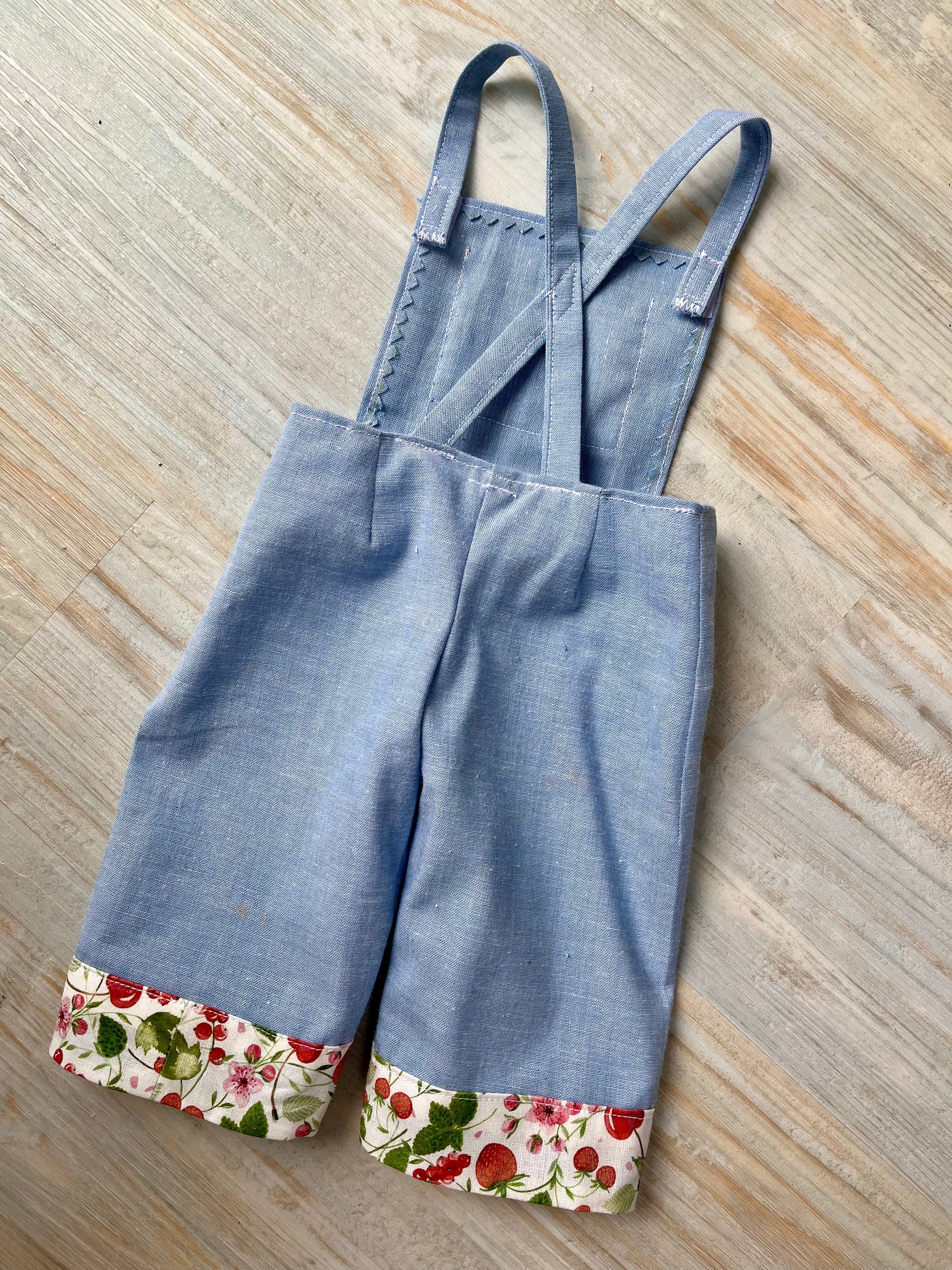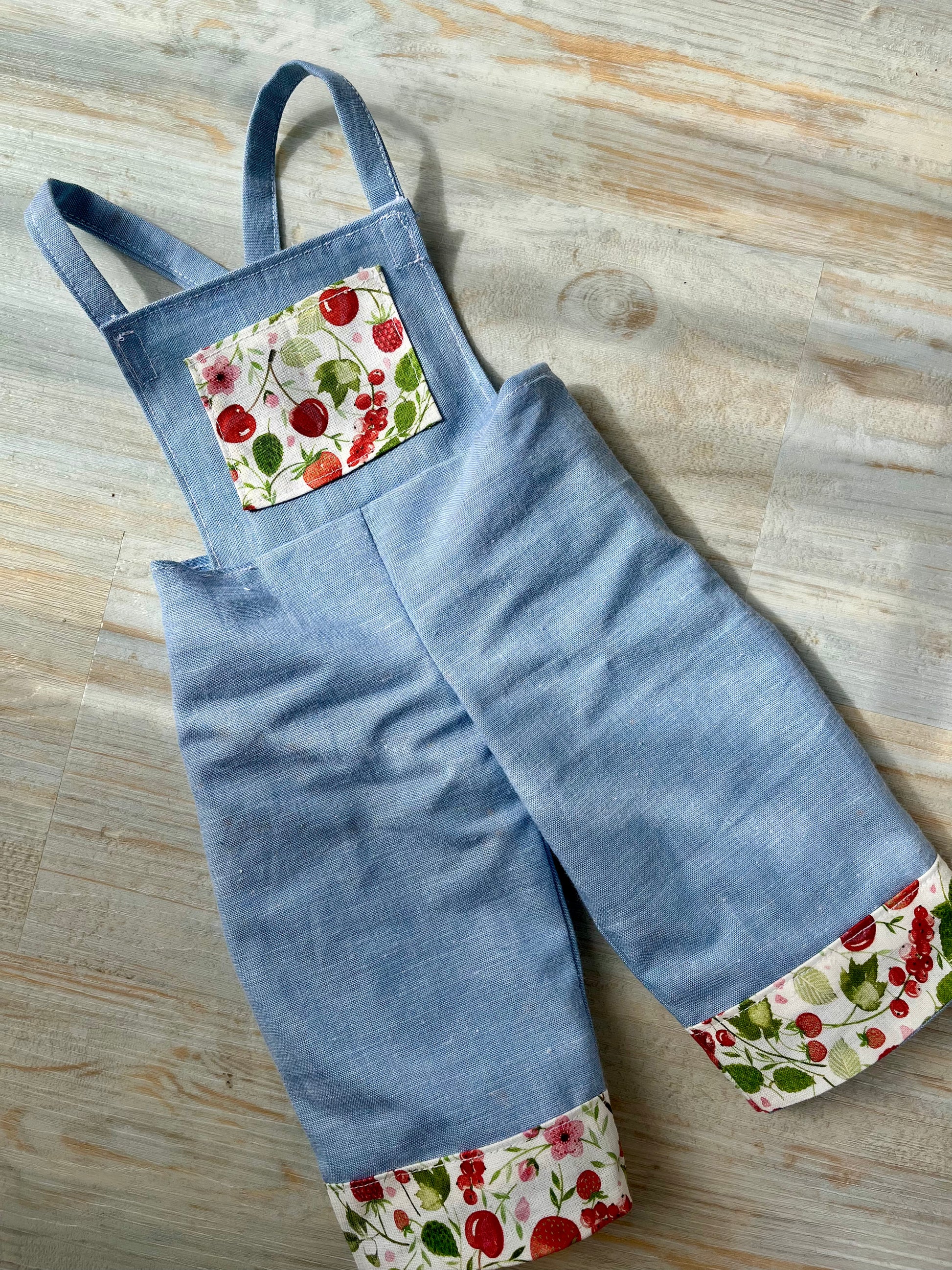 The dungarees are made from a lovely light blue cotton Chambray fabric with a summer fruits print pocket and turn-ups. There is velcro on the straps and bib.