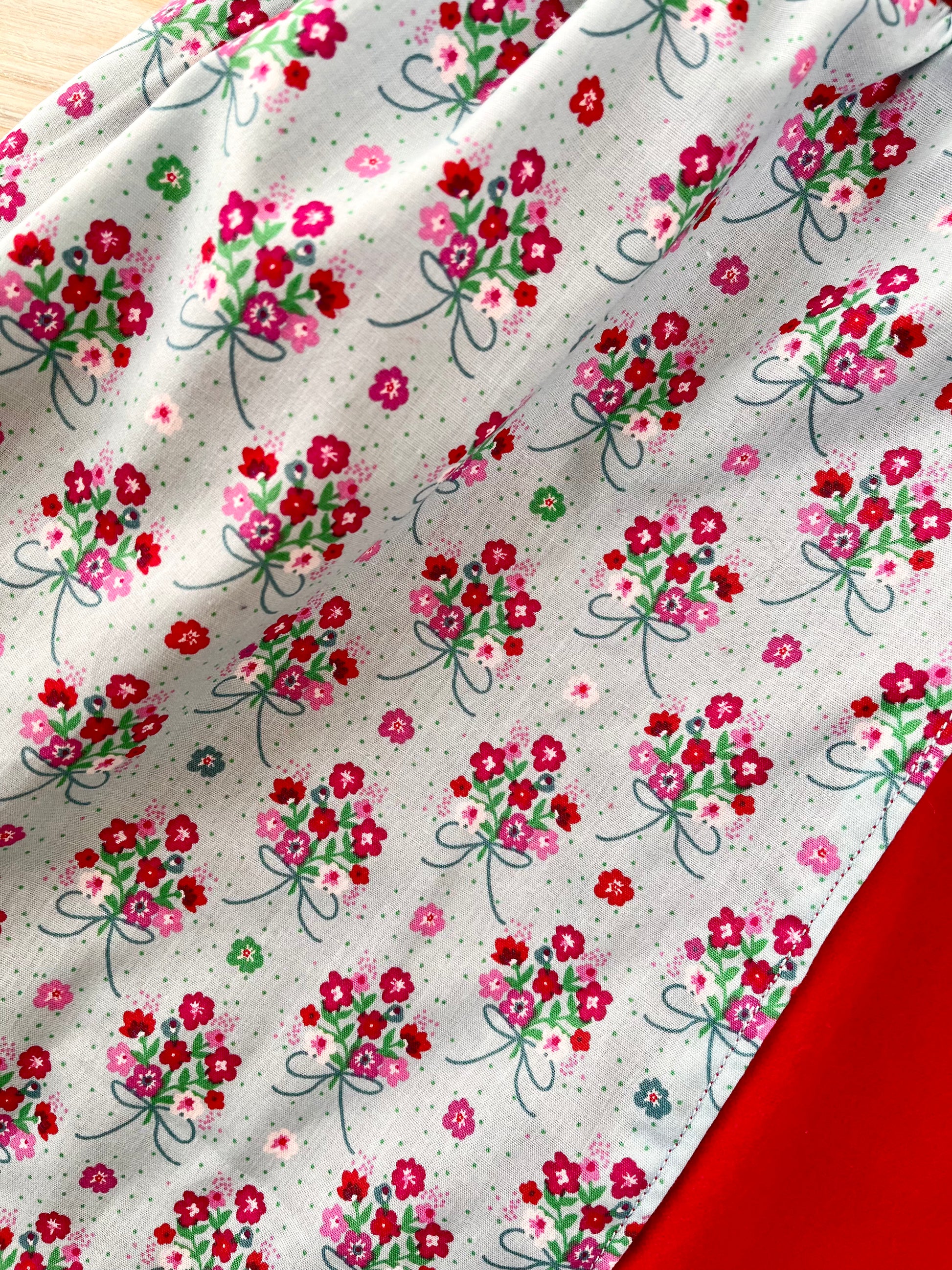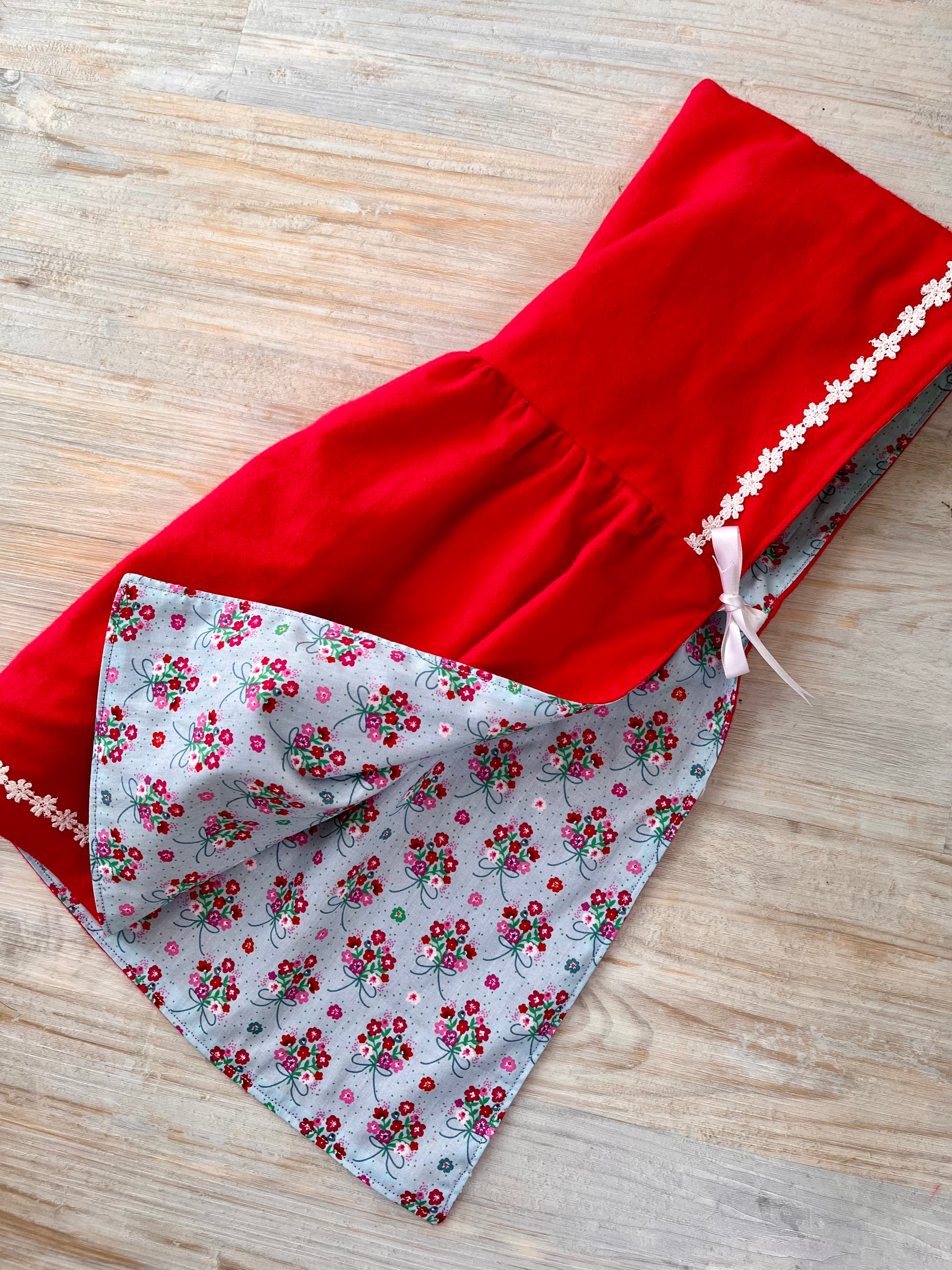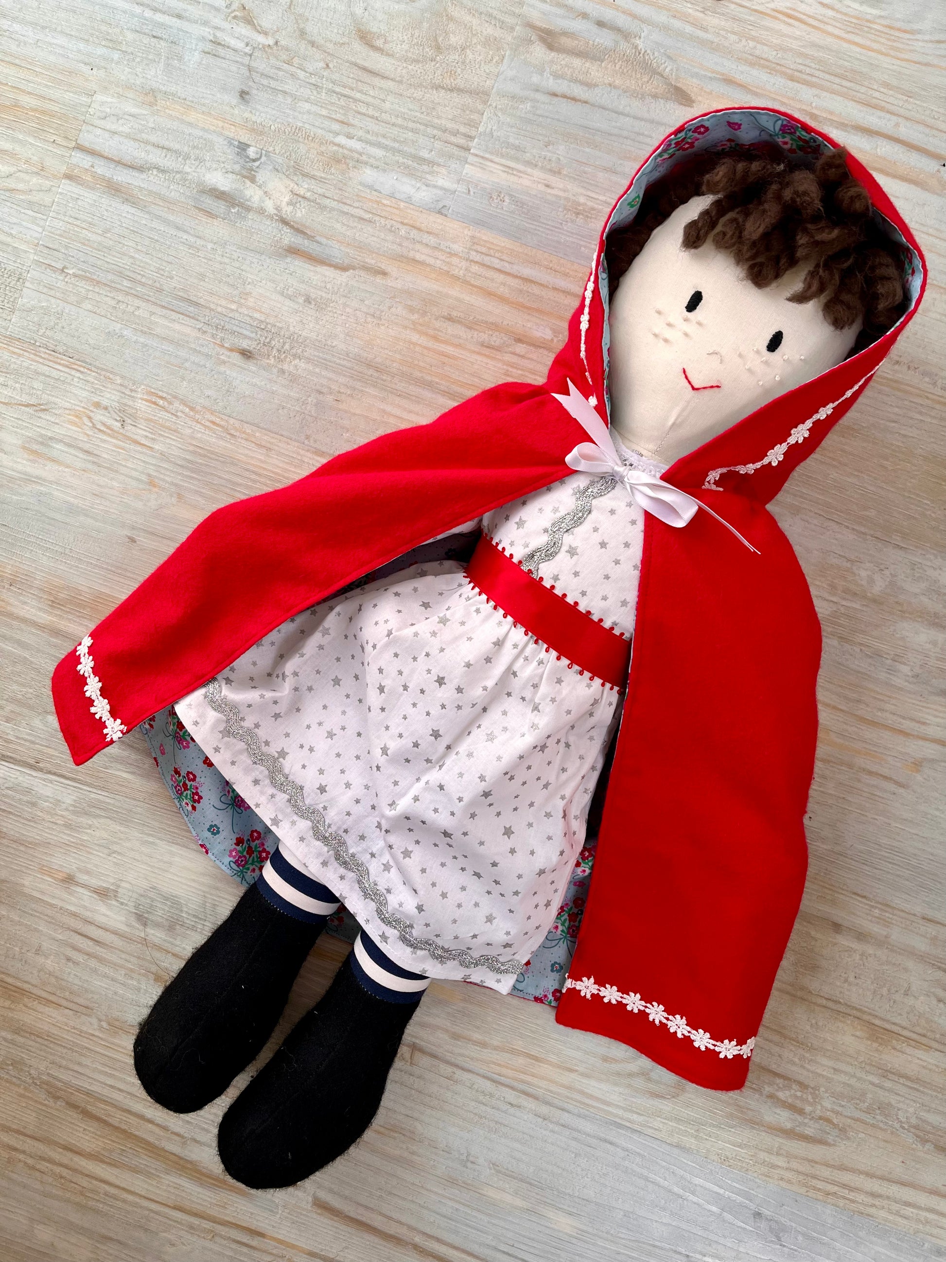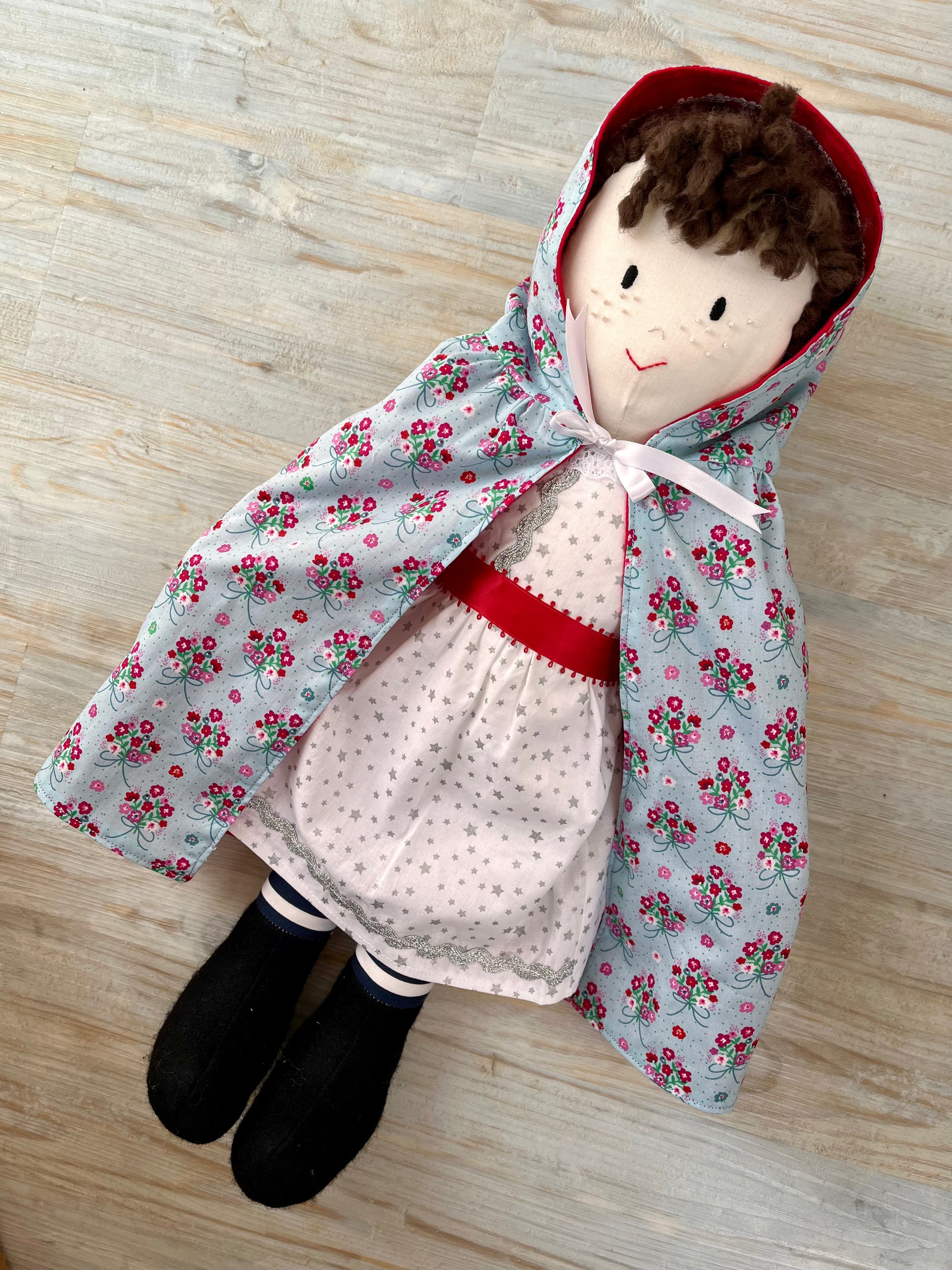 This very special cloak is reversible and has a lovely bright red brushed cotton one side, with a daisy trim around the hood and hem. The other side has a pretty pale blue cotton print with bunches of pink and red flowers. The cloak has satin ribbon ties and a useful hood to protect your doll from the elements. A wonderfully fairy tale cloak any doll or toy would be delighted to own.