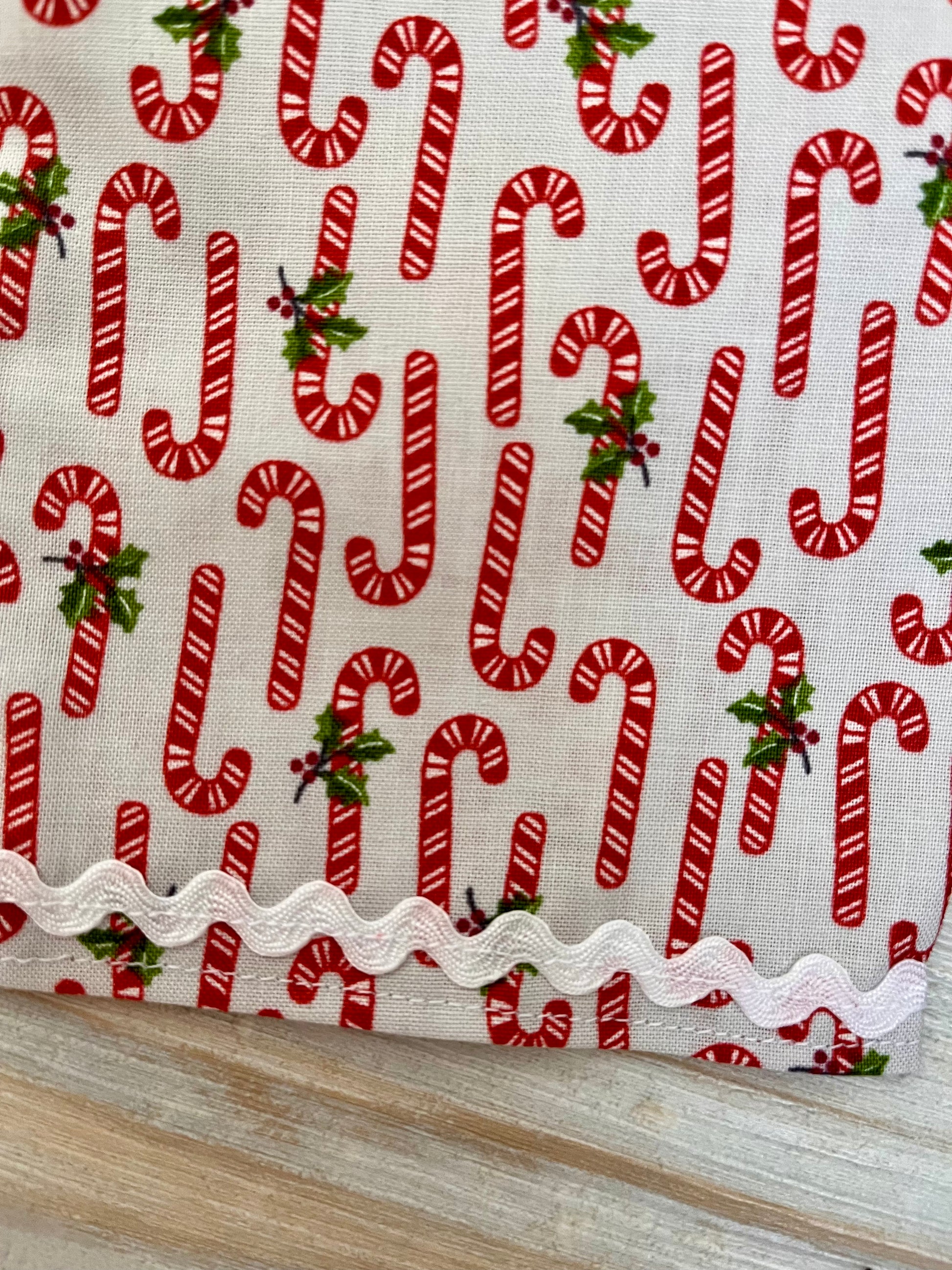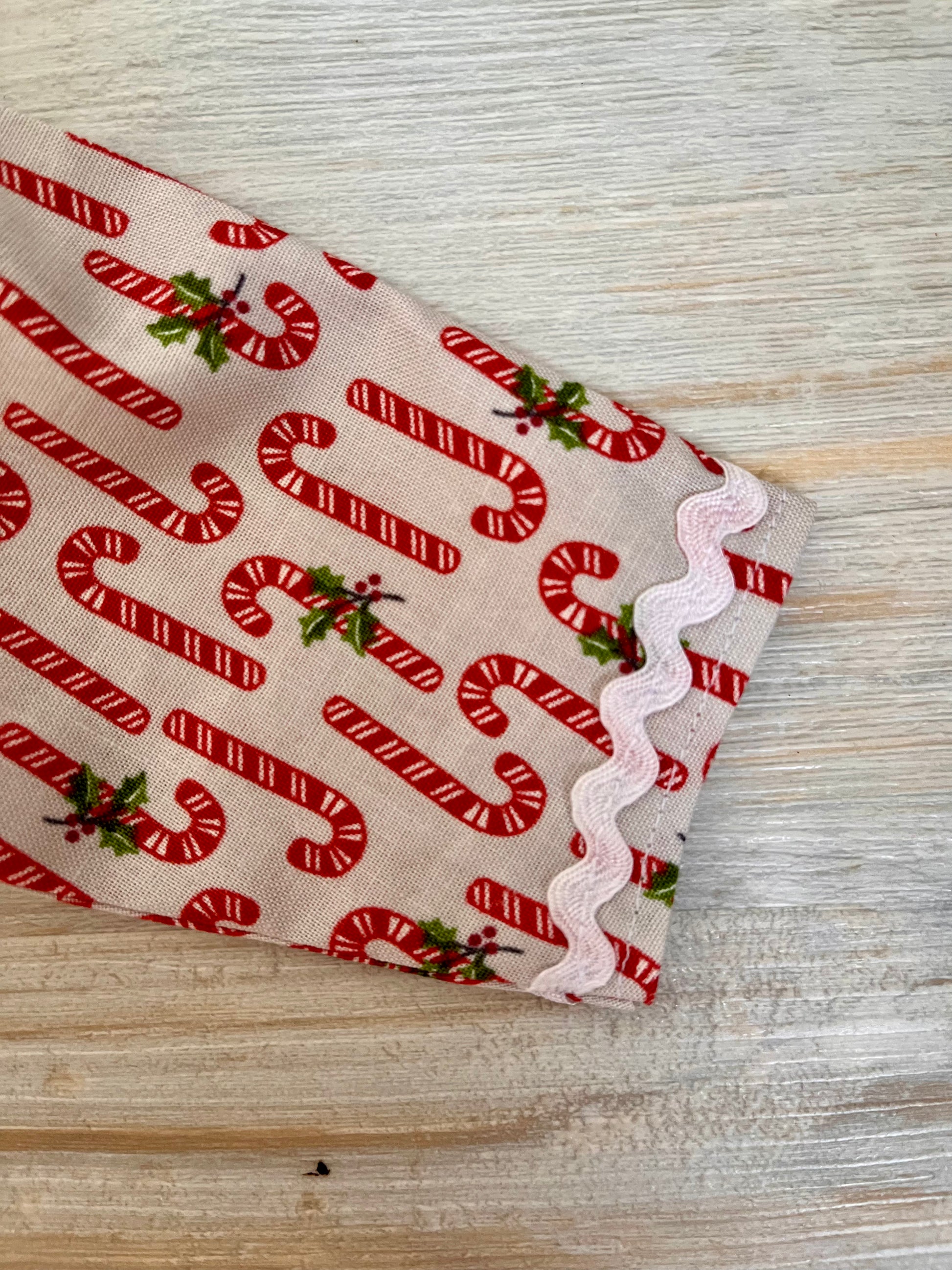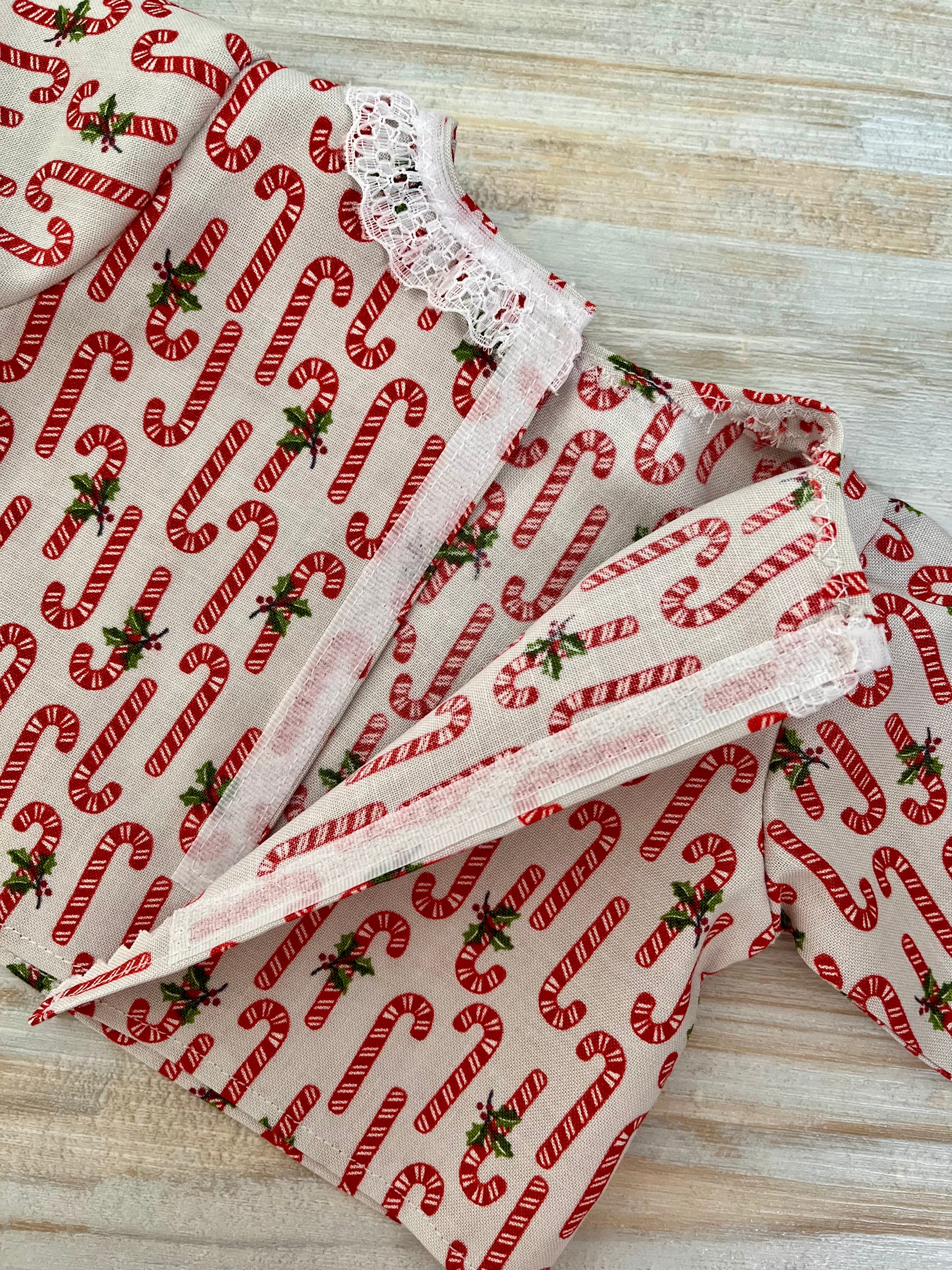 Made from a quilting cotton, these pyjamas have a light grey background and are covered in lovely red and white candy canes. The top has a lace collar, velcro opening down the front, and a ric-rac trim around the cuffs; the trousers have an elasticated waist and a ric-rac trim around the hems.