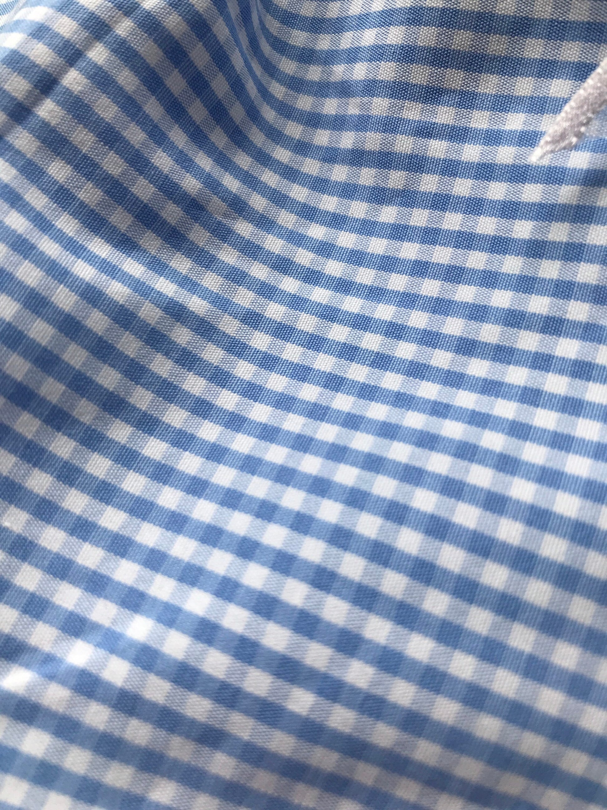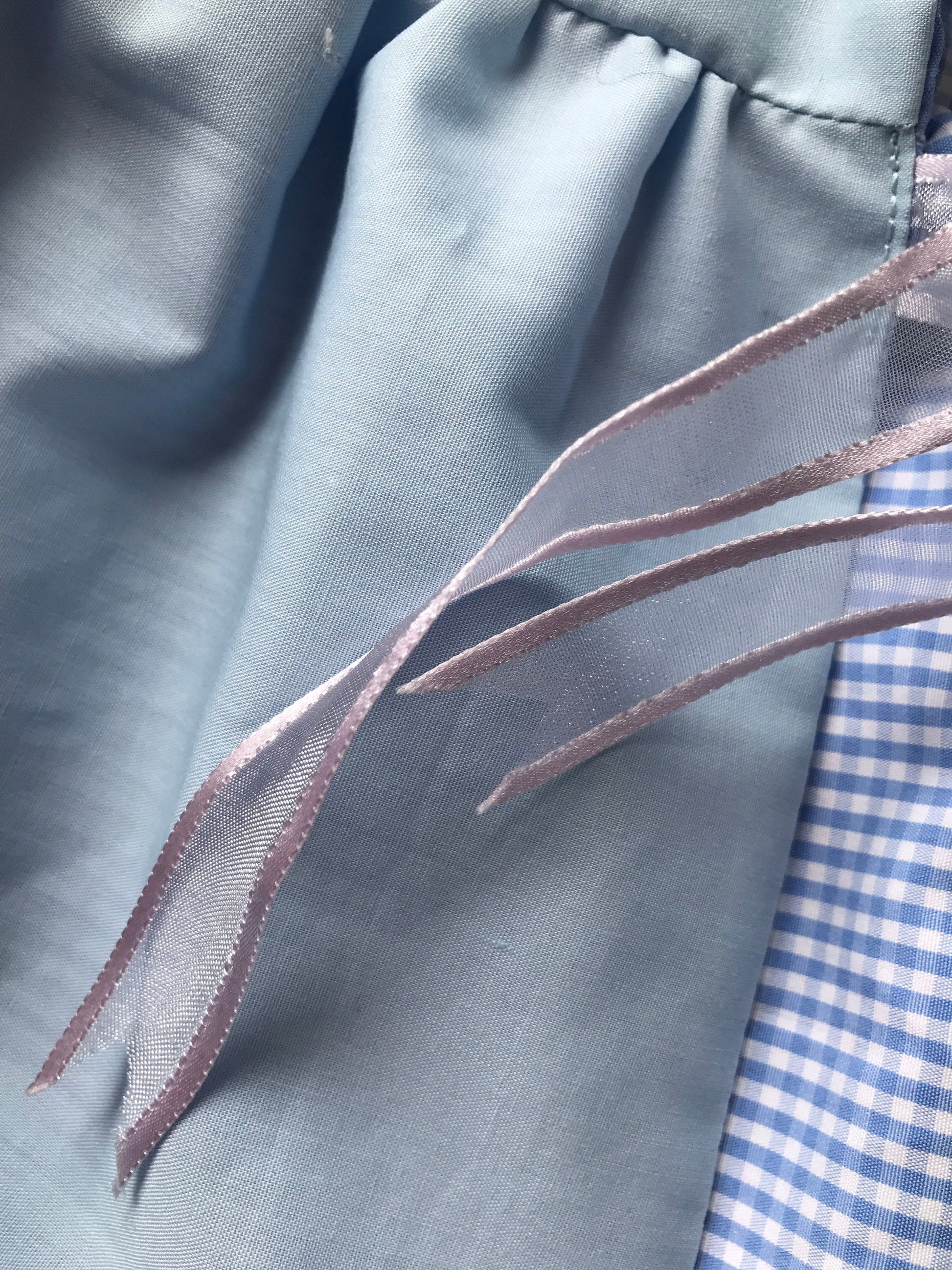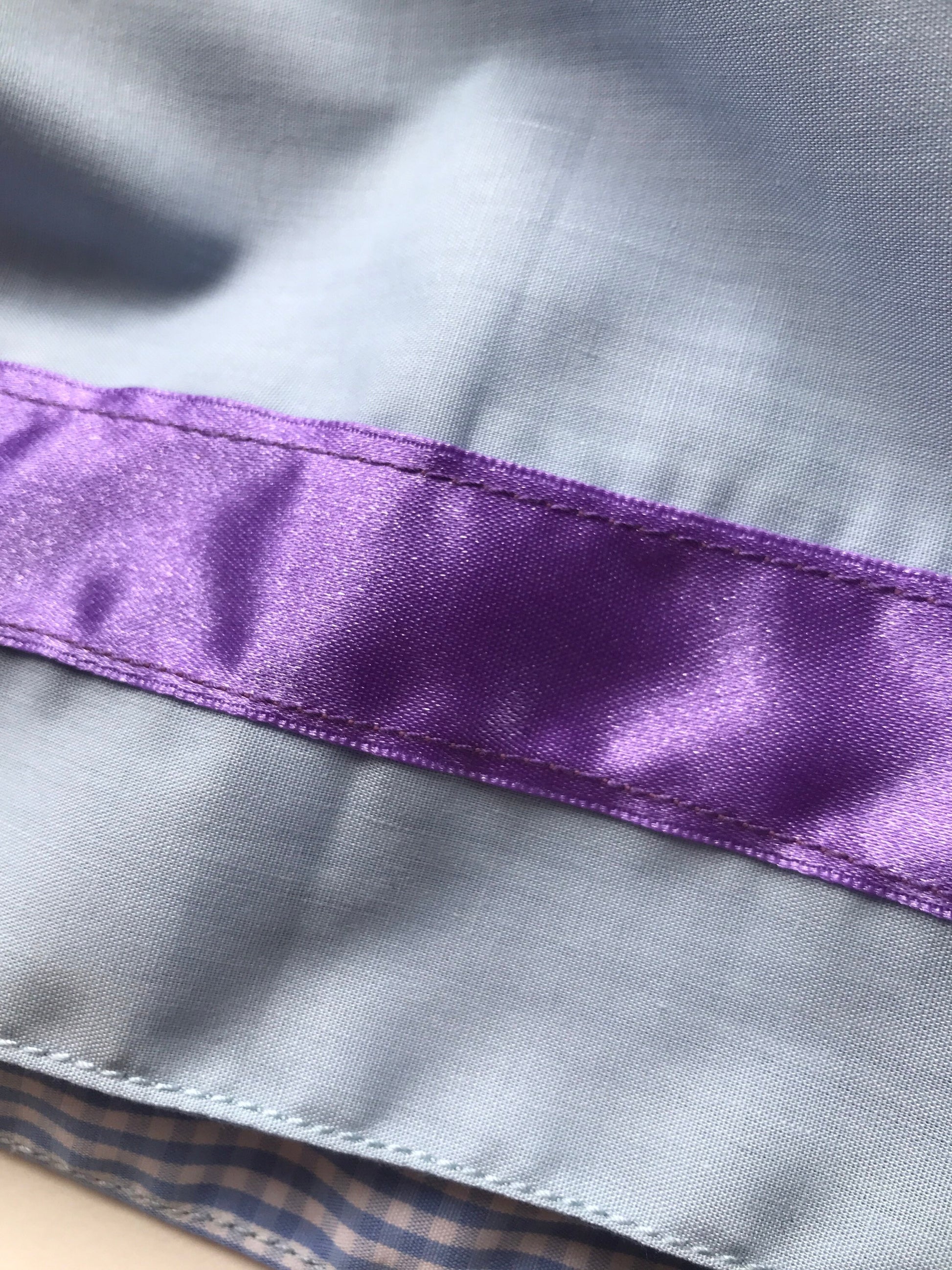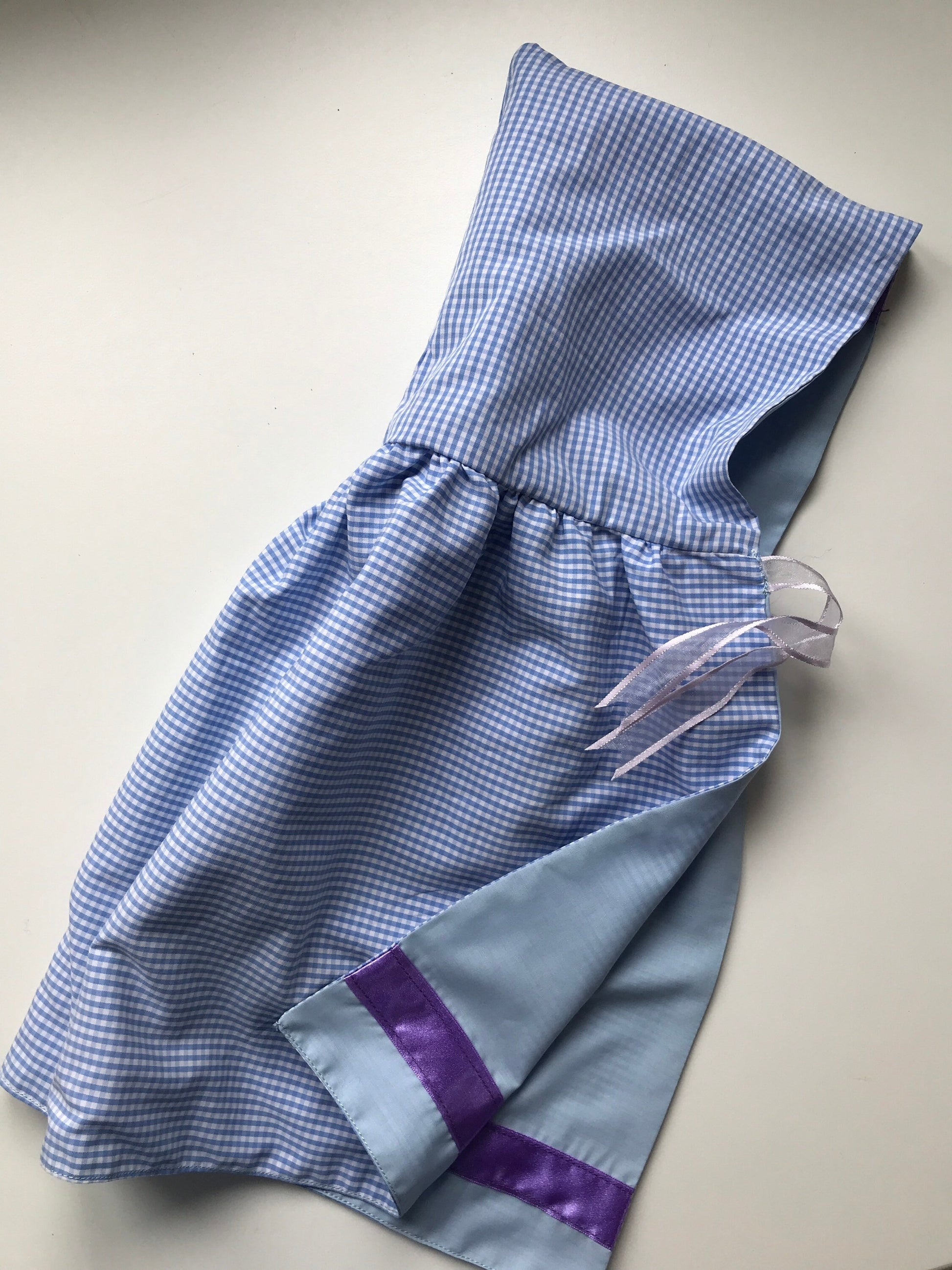 This cloak is reversible and has a lovely fresh gingham fabric on one side and a pale blue fabric with purple satin ribbon trim on the other. The cloak is tied its lilac organza ribbon and has a useful hood to protect your doll from the elements.