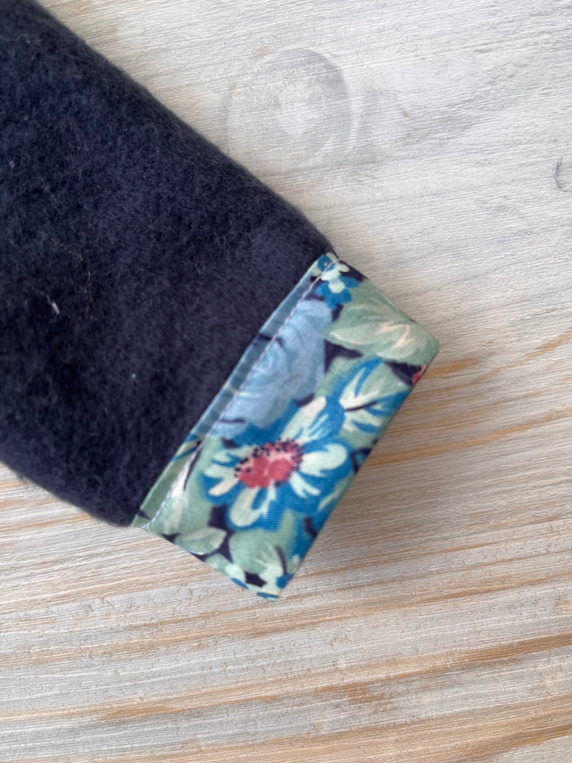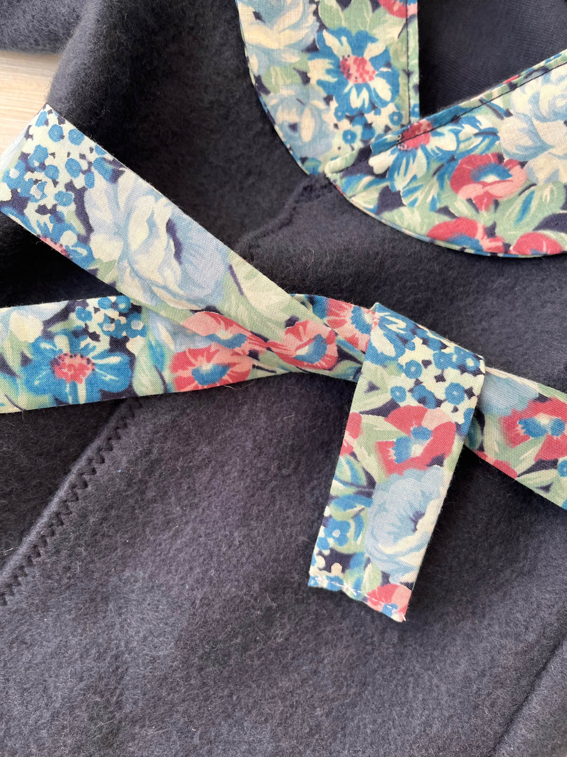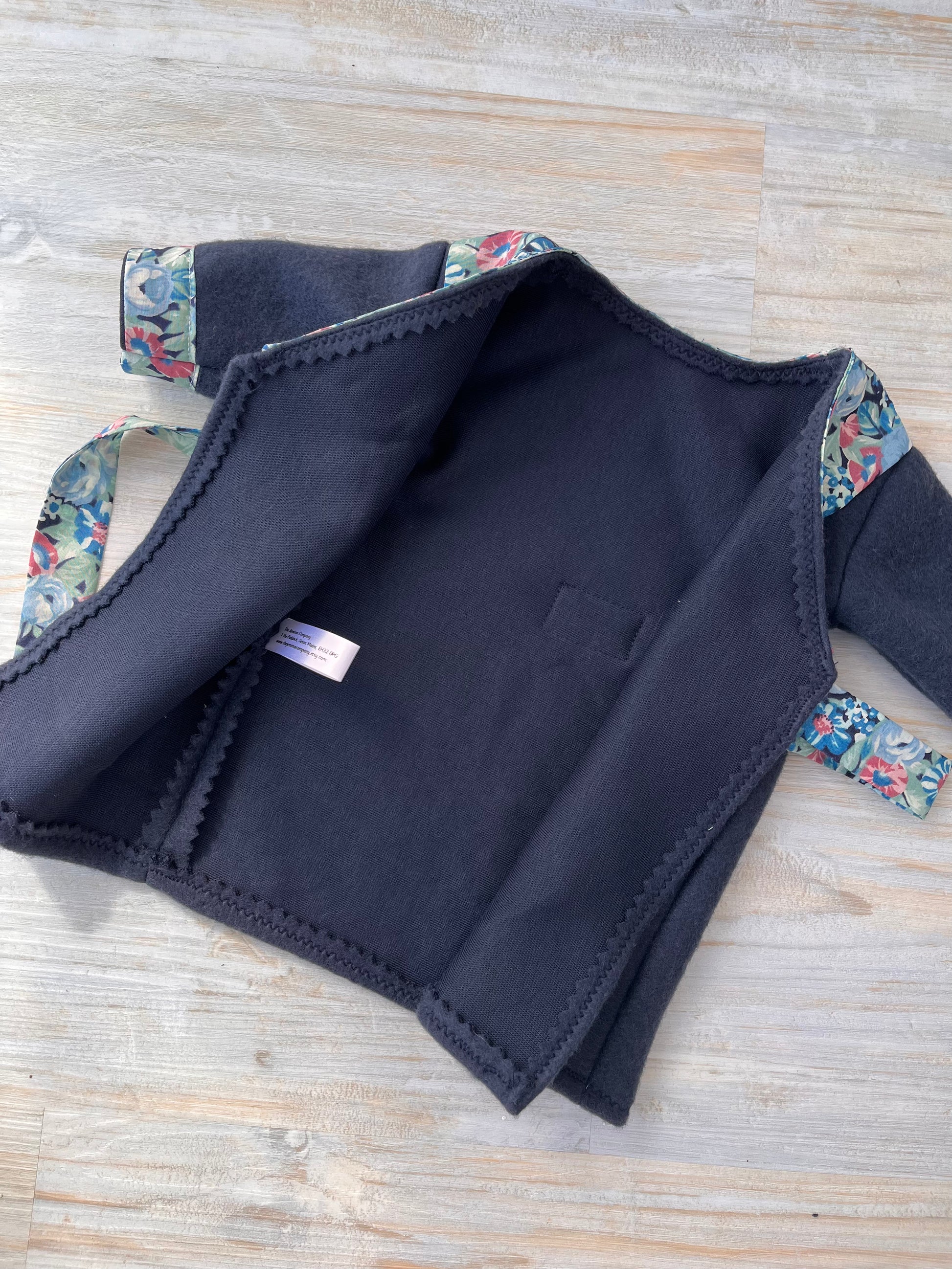 This lovely soft dressing gown is a great addition to any doll's wardrobe and is perfect for doll duvet days or when your doll is not feeling so well. It has a floral cotton shawl collar, cuffs and belt. The belt is stitched on to the dressing gown so it won't get lost. The dressing gown is made from one-sided navy fleece, and can be hand- or machine-washed.