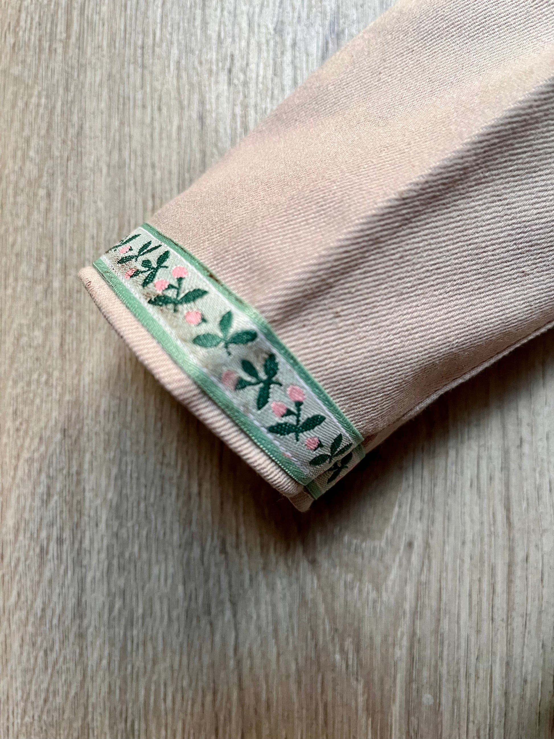 The trousers are made from a lovely stone-coloured cotton drill fabric with a pretty ribbon detail round the hem. The trousers have an elasticated waist.