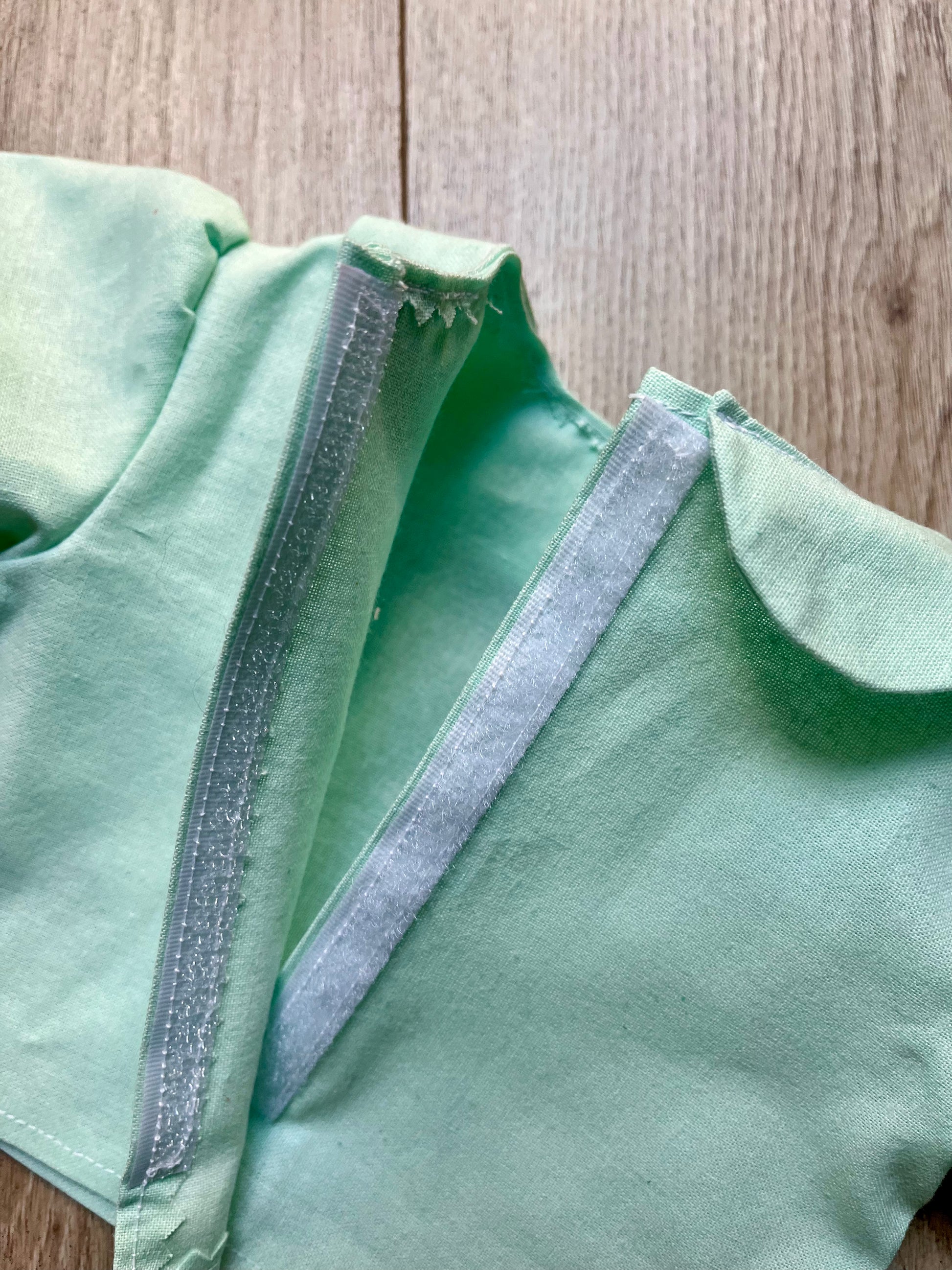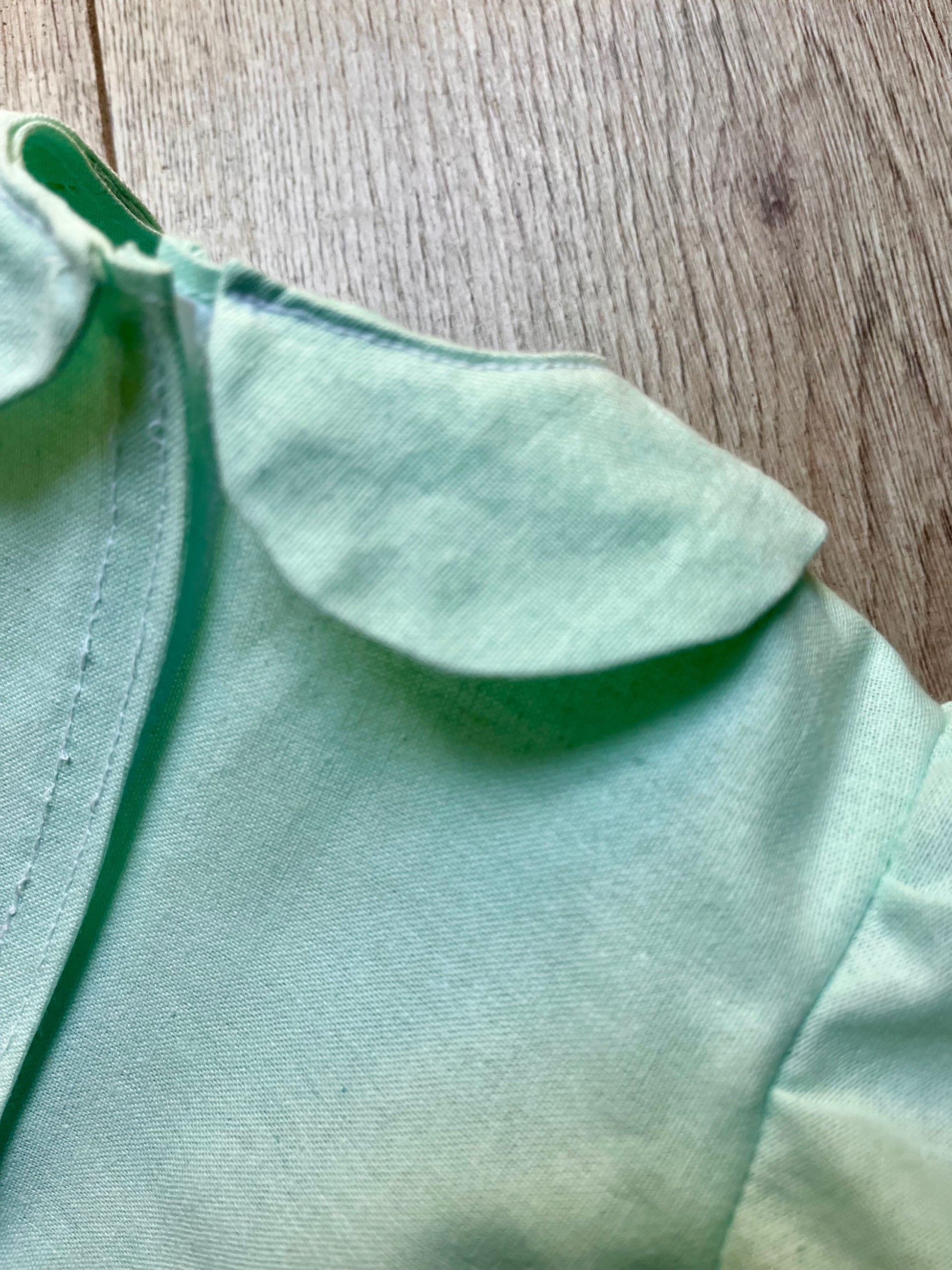 The little blouse is made from a lovely Eau de Nil-coloured cotton, with a pink ric-rac trim around the sleeves; it has a Peter Pan collar and a Velcro opening down the front.