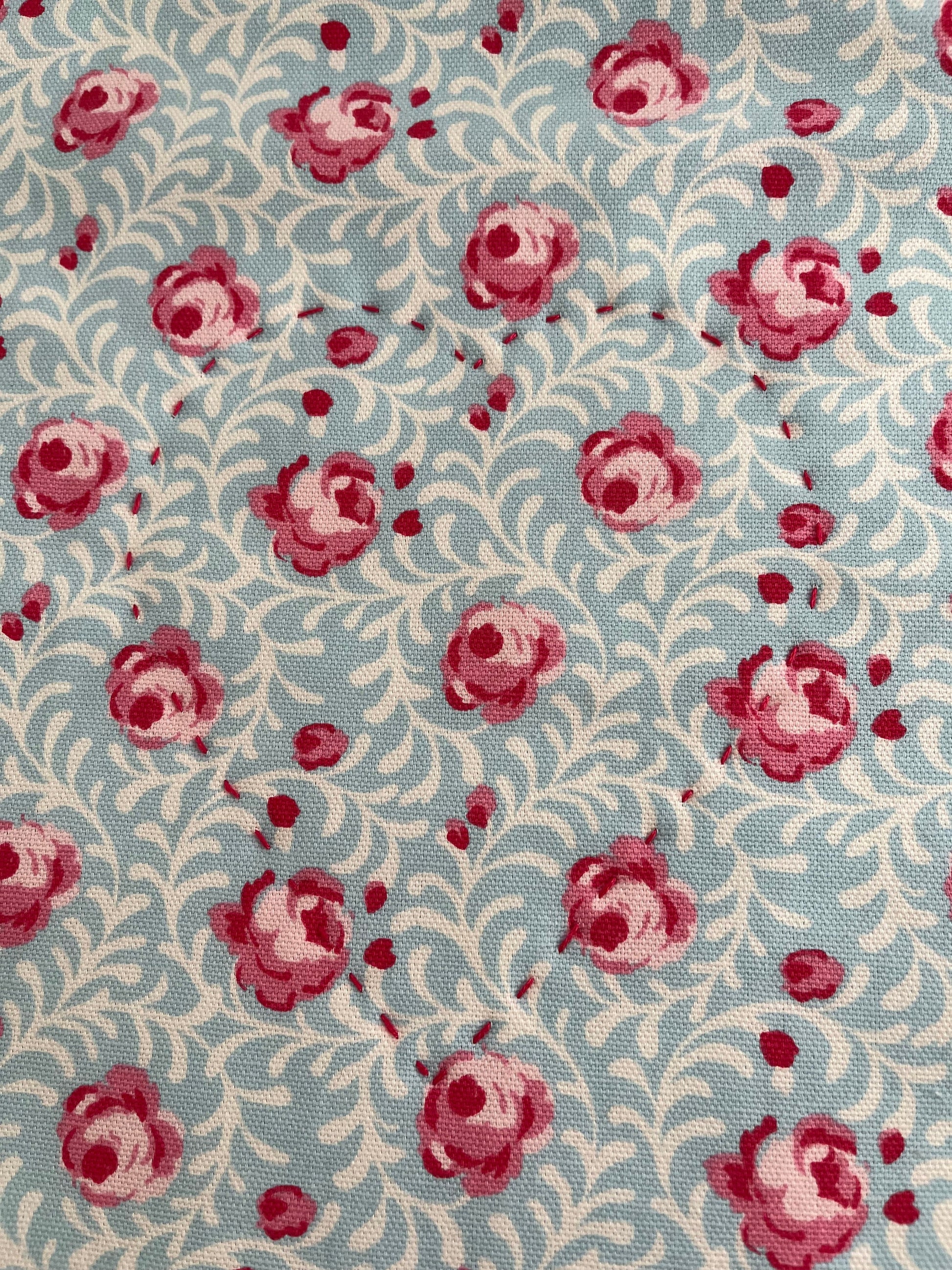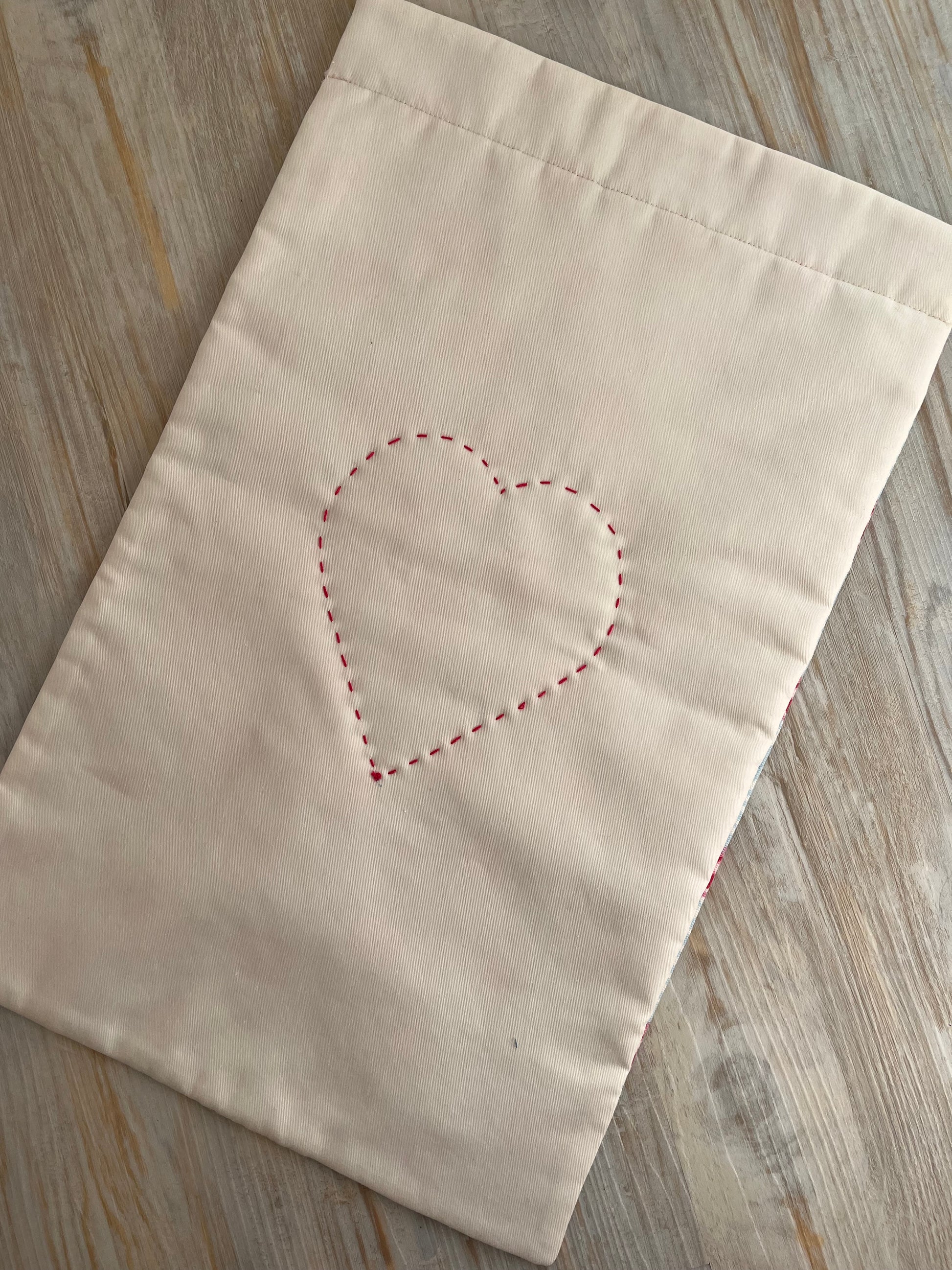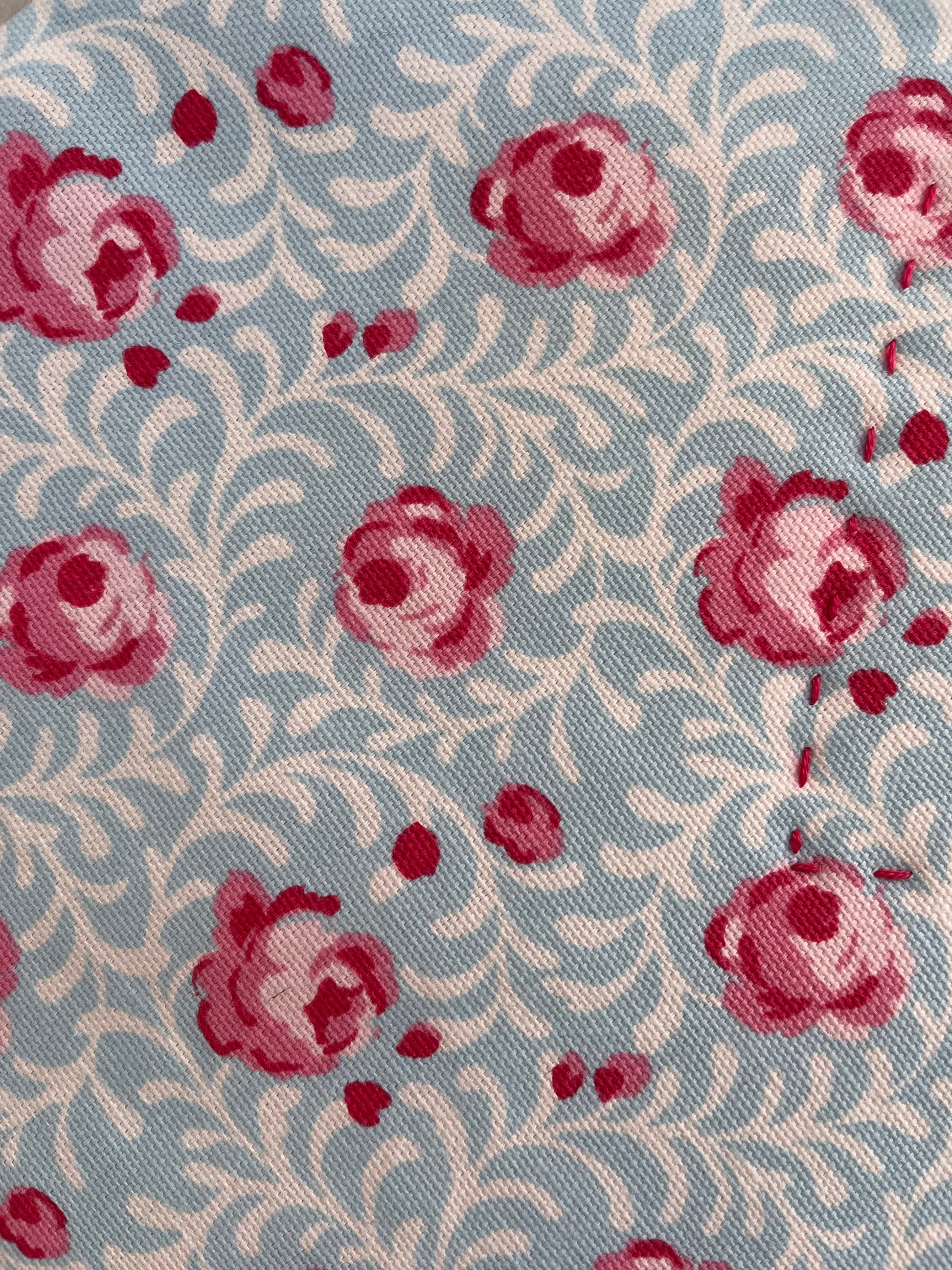 The quilt, is made of a lovely furnishing fabric with pink roses and a blue background. The quilt is lightly padded and backed with white cotton fabric and has a heart hand-stitched into the middle. The matching pillow is double-sided and can be used on its floral side or matching deep pink side. Both the quilt and the pillow are finished with a beautiful daisy trim and can be hand or machine-washed and ironed.