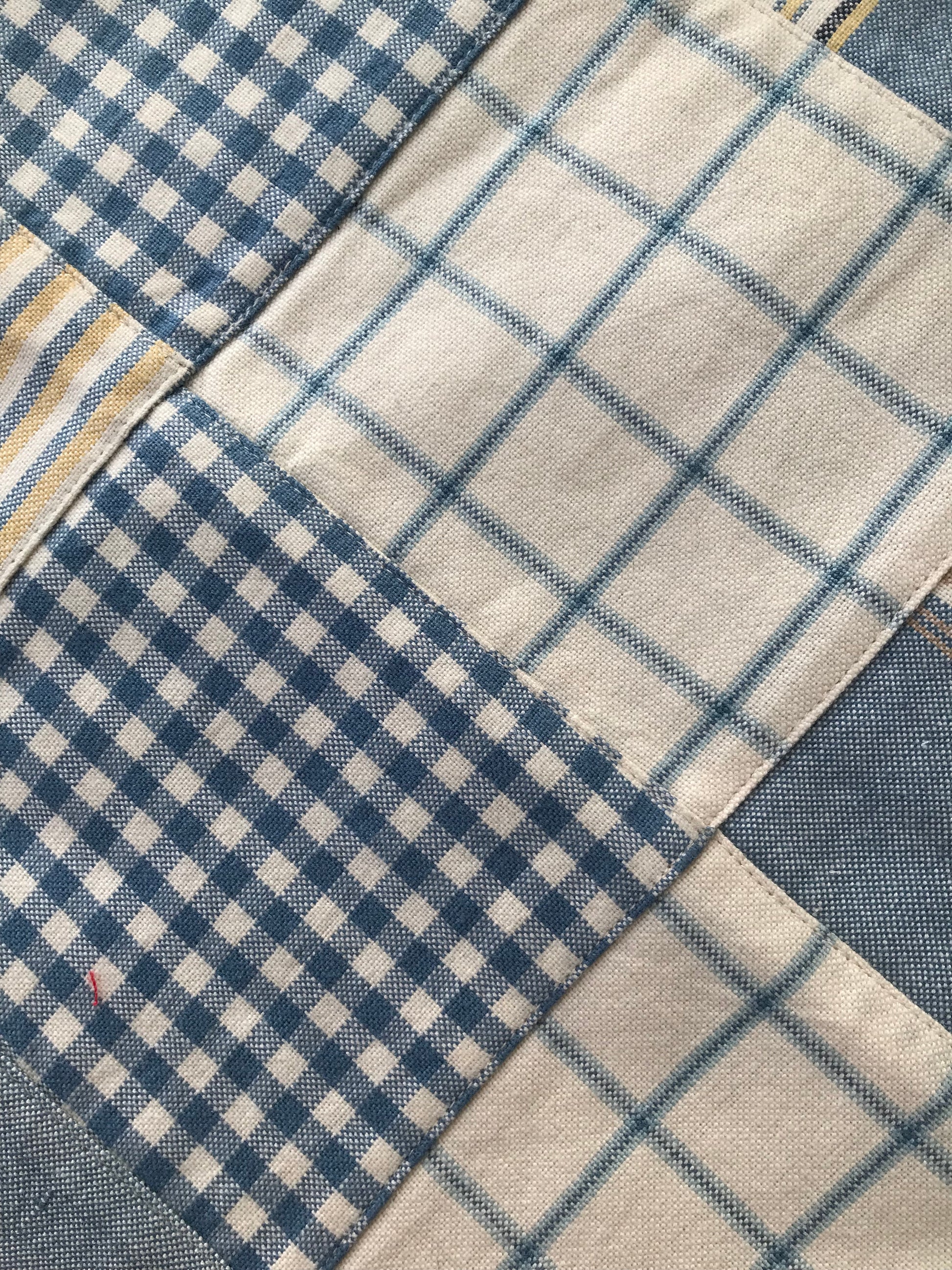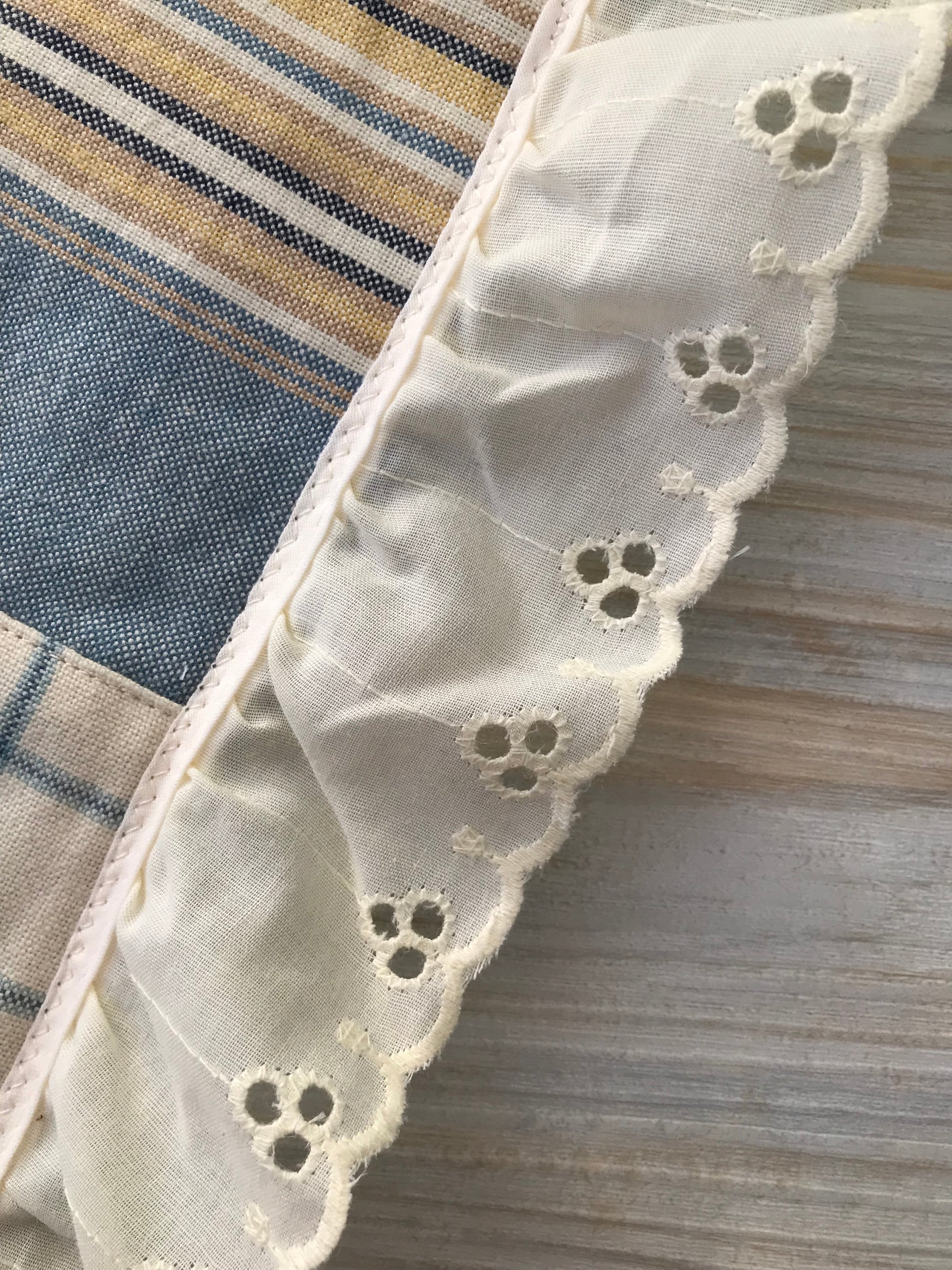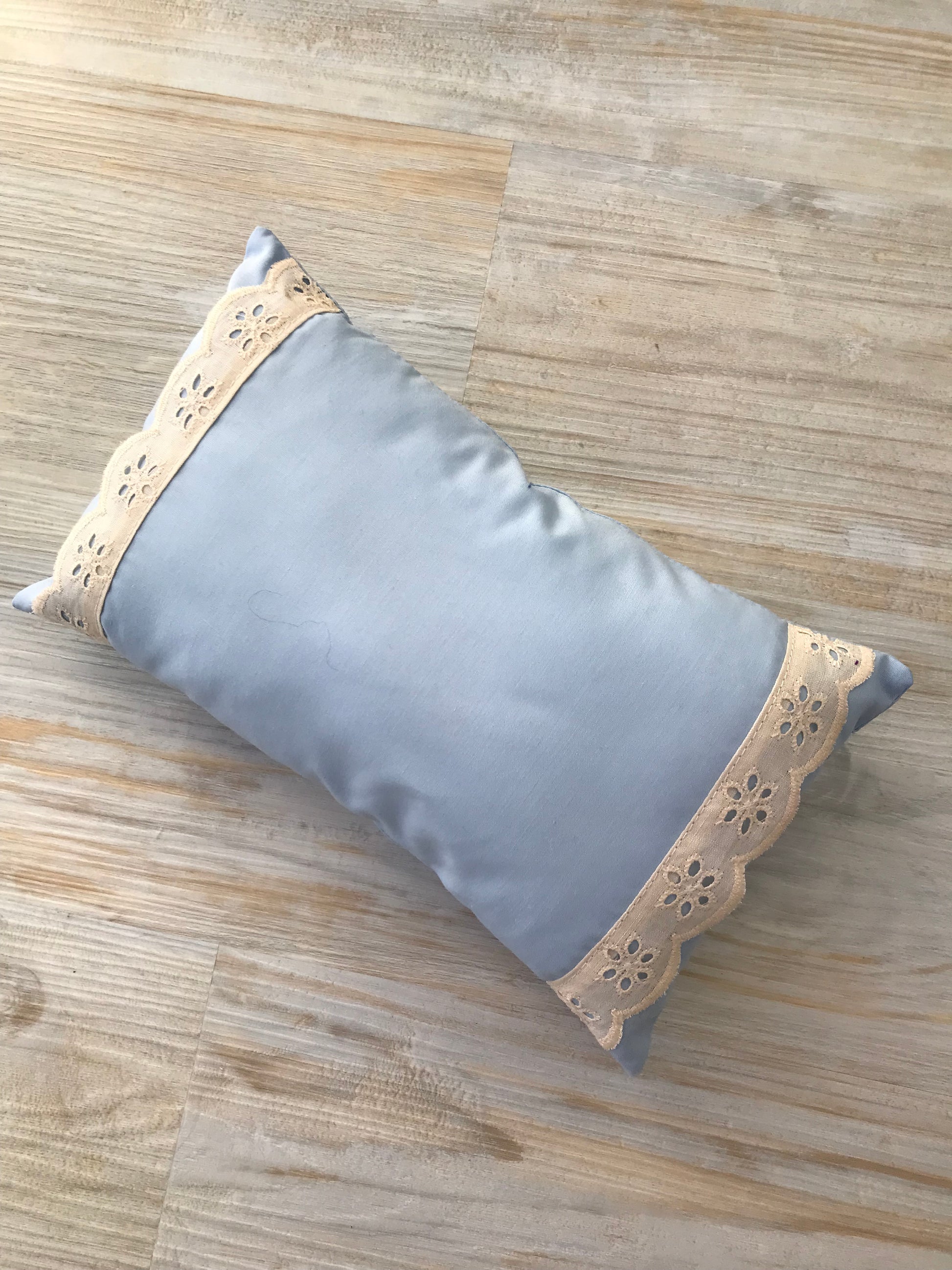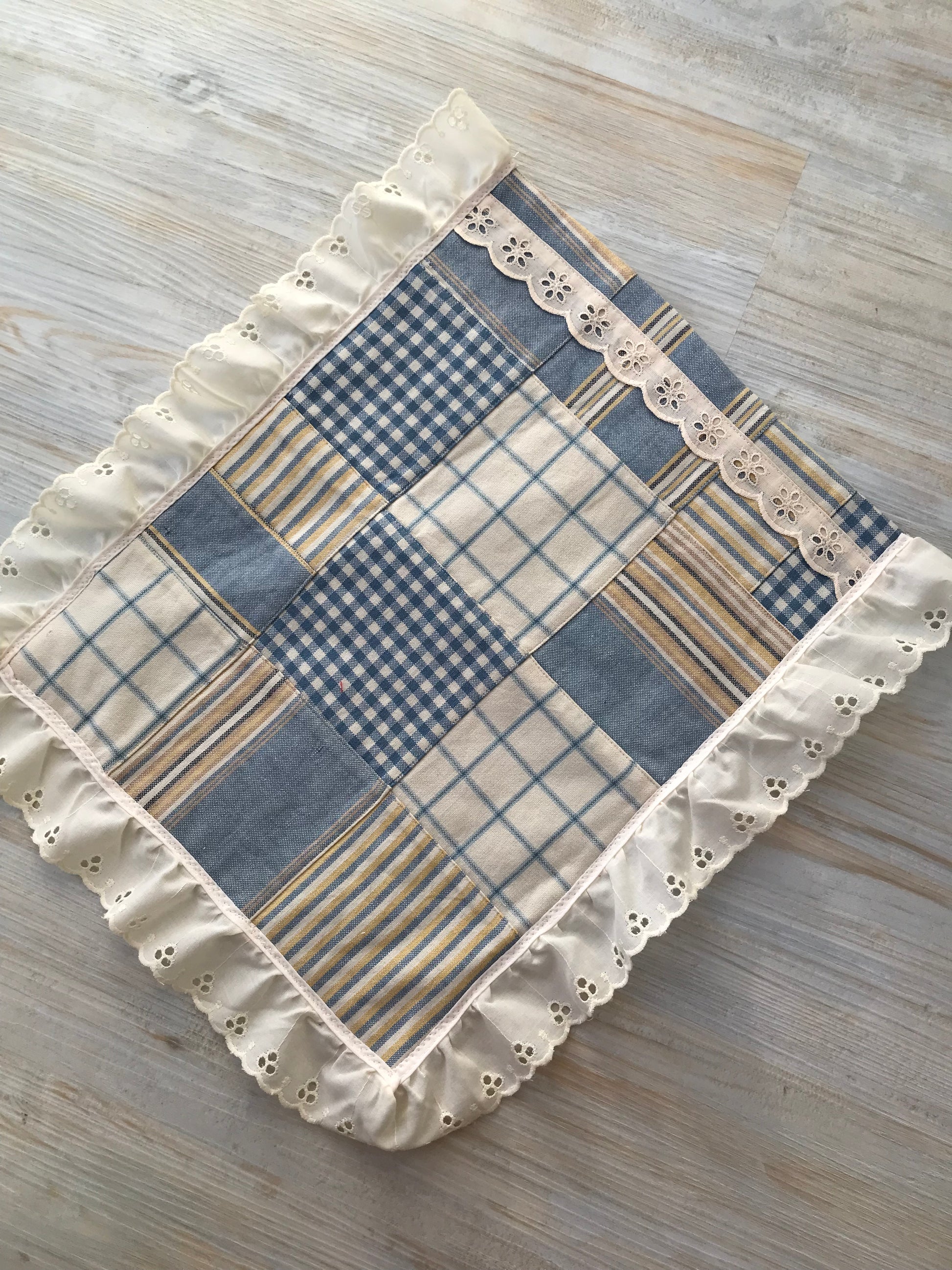 The patchwork quilt, in shades of blue has a cream Broderie Anglaise trim and a plain blue cotton fabric backing. The quilt is lightly padded. The matching pillow also has a cream Broderie Anglaise trim. Both the quilt and pillow can be hand washed and ironed.