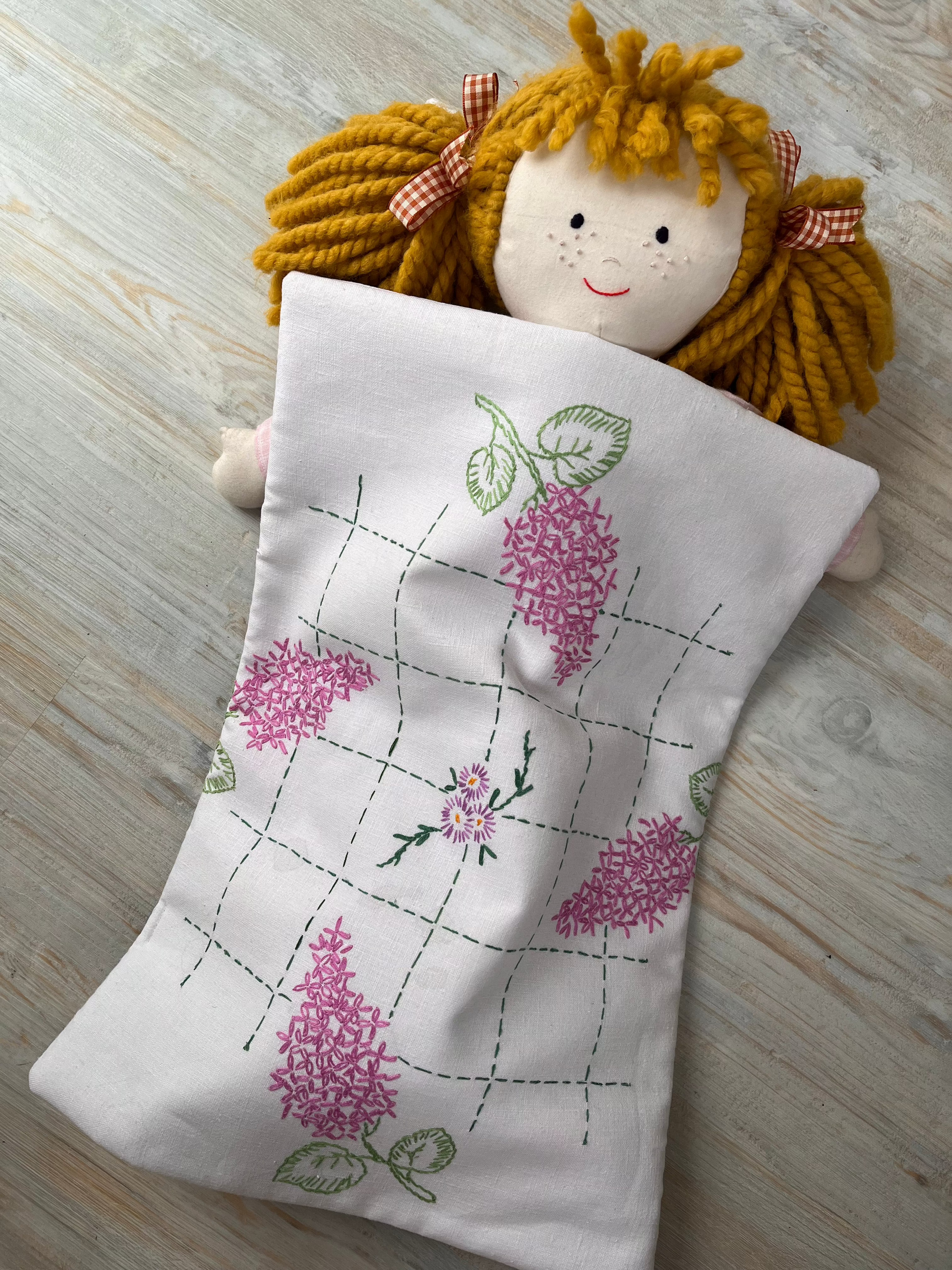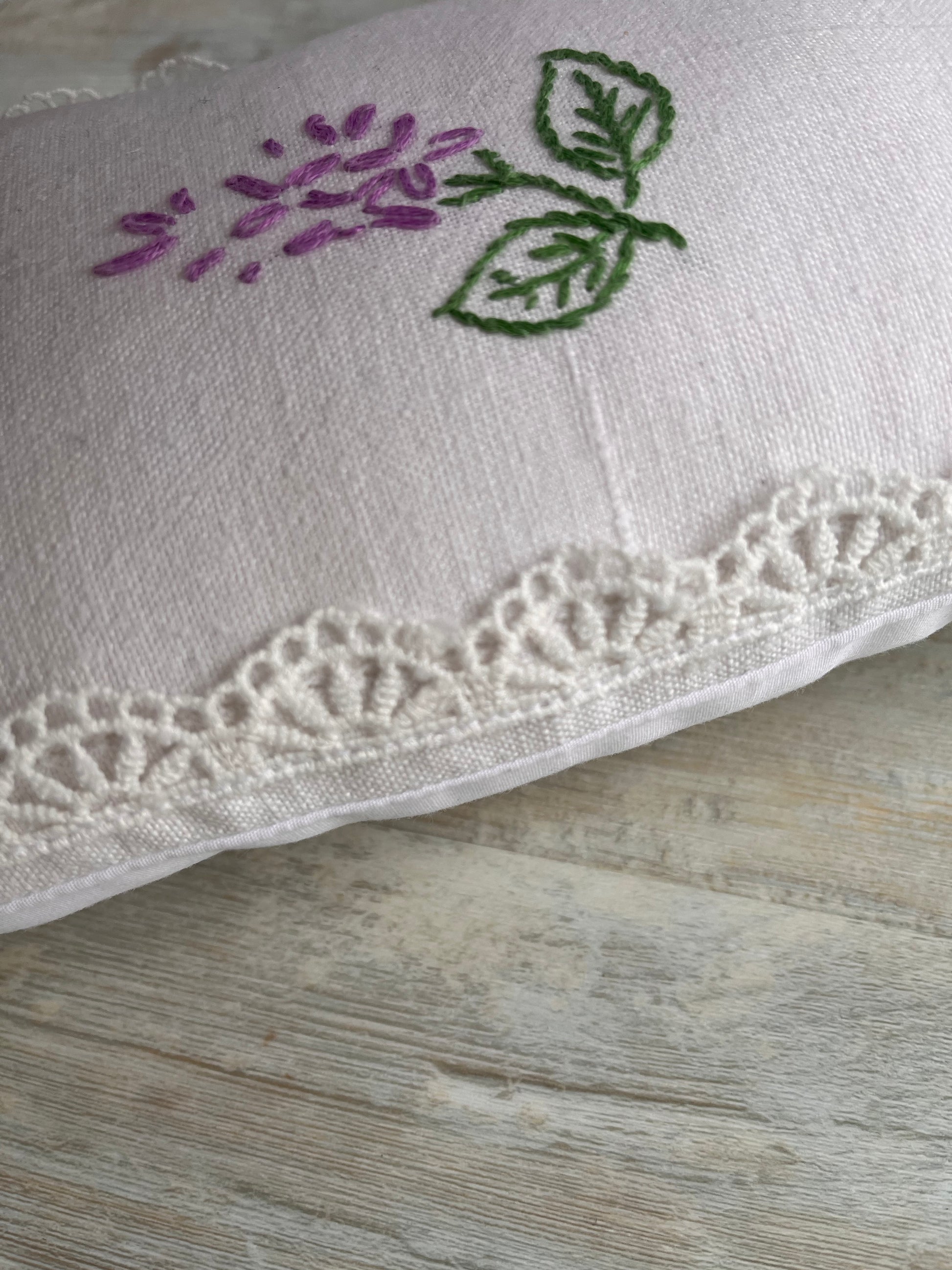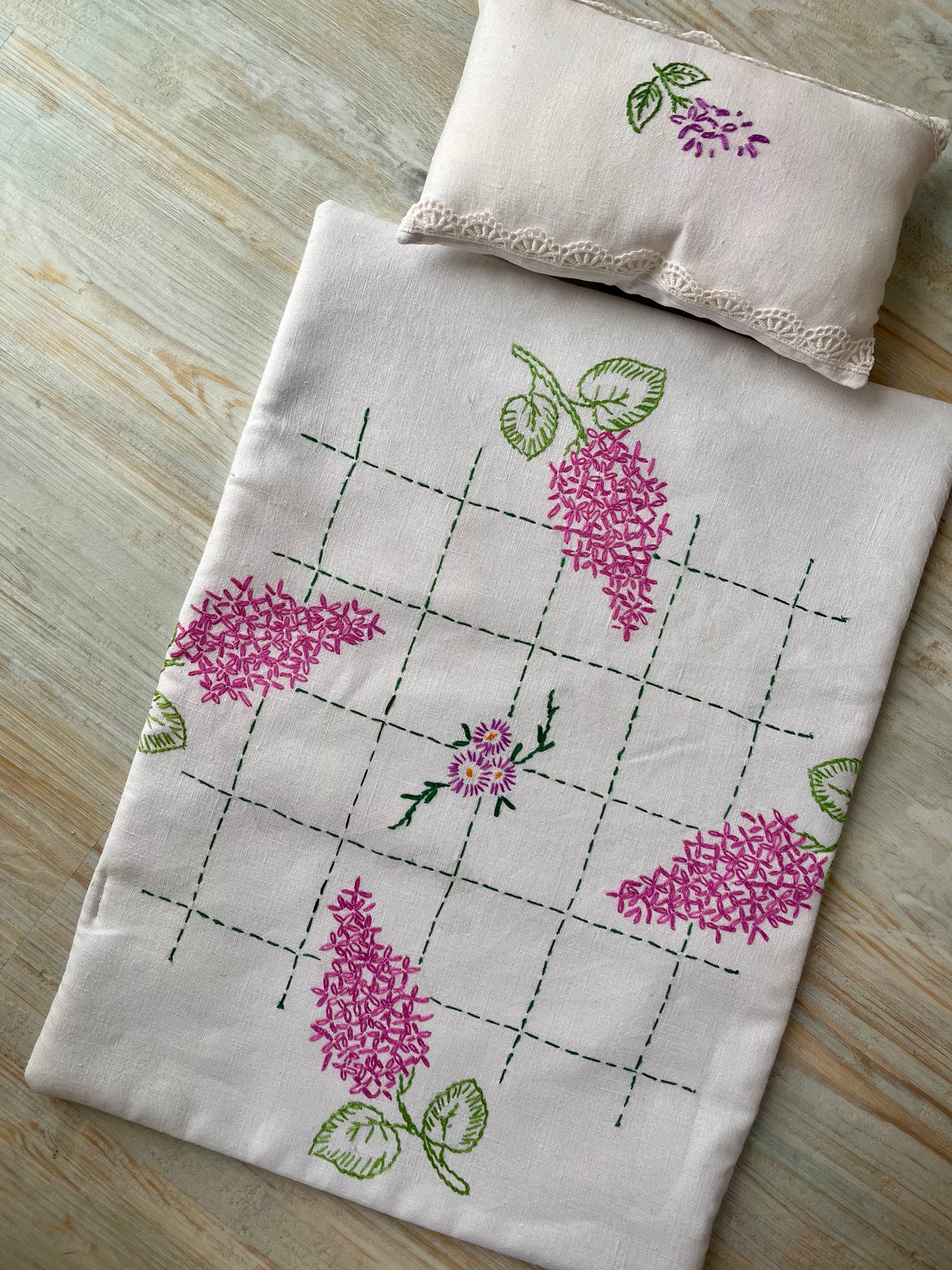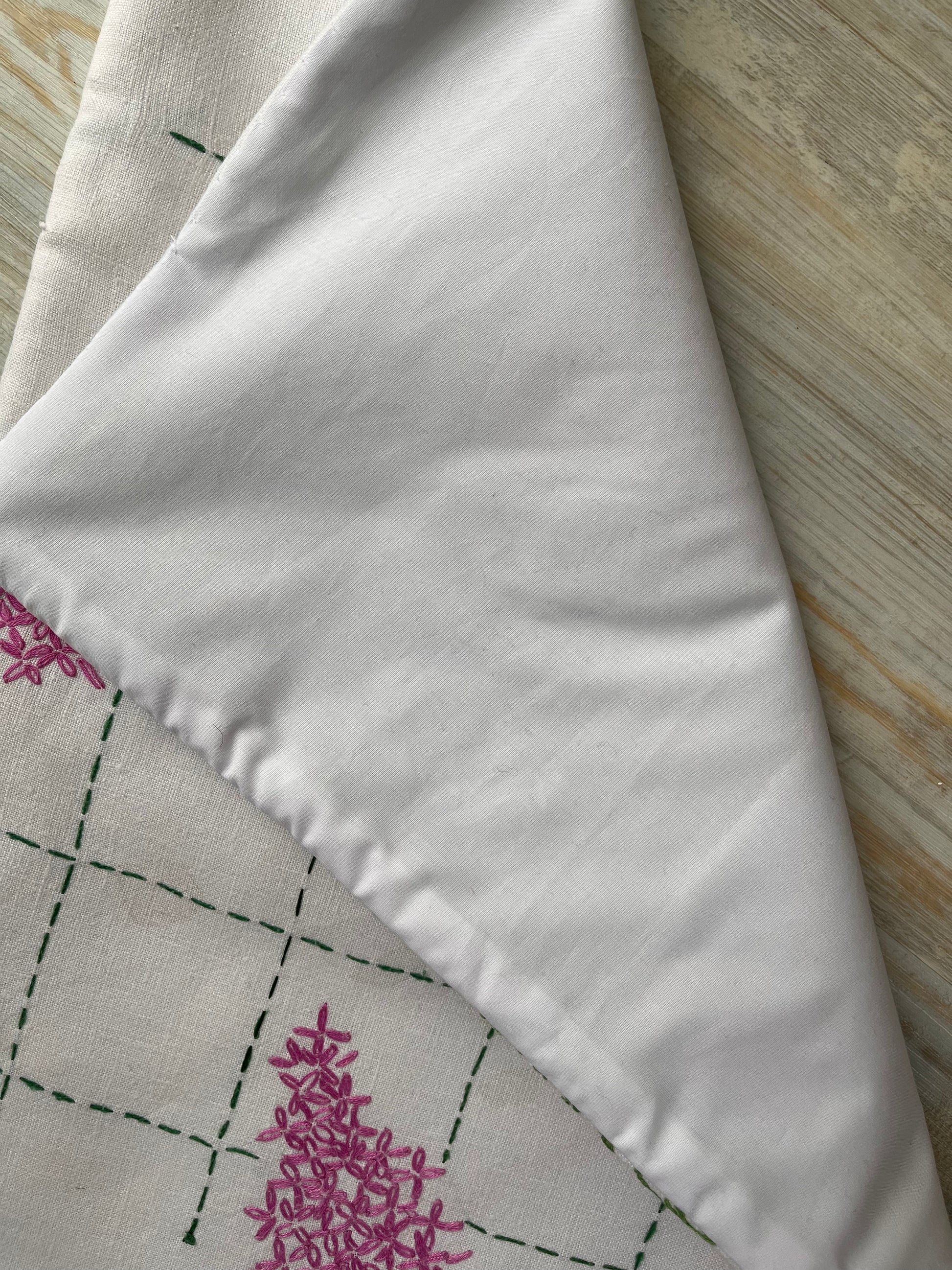 The quilt, is made from a beautiful, hand embroidered, vintage table cloth. Its lilac design has been embroidered onto linen and is in pretty shades of pink and purple. The quilt is lightly padded and backed with white cotton fabric. The matching pillow has a small lilac embroidery on it and is trimmed with scalloped lace; it is also backed with white cotton fabric. Both the quilt and the pillow can be hand or machine-washed and ironed.