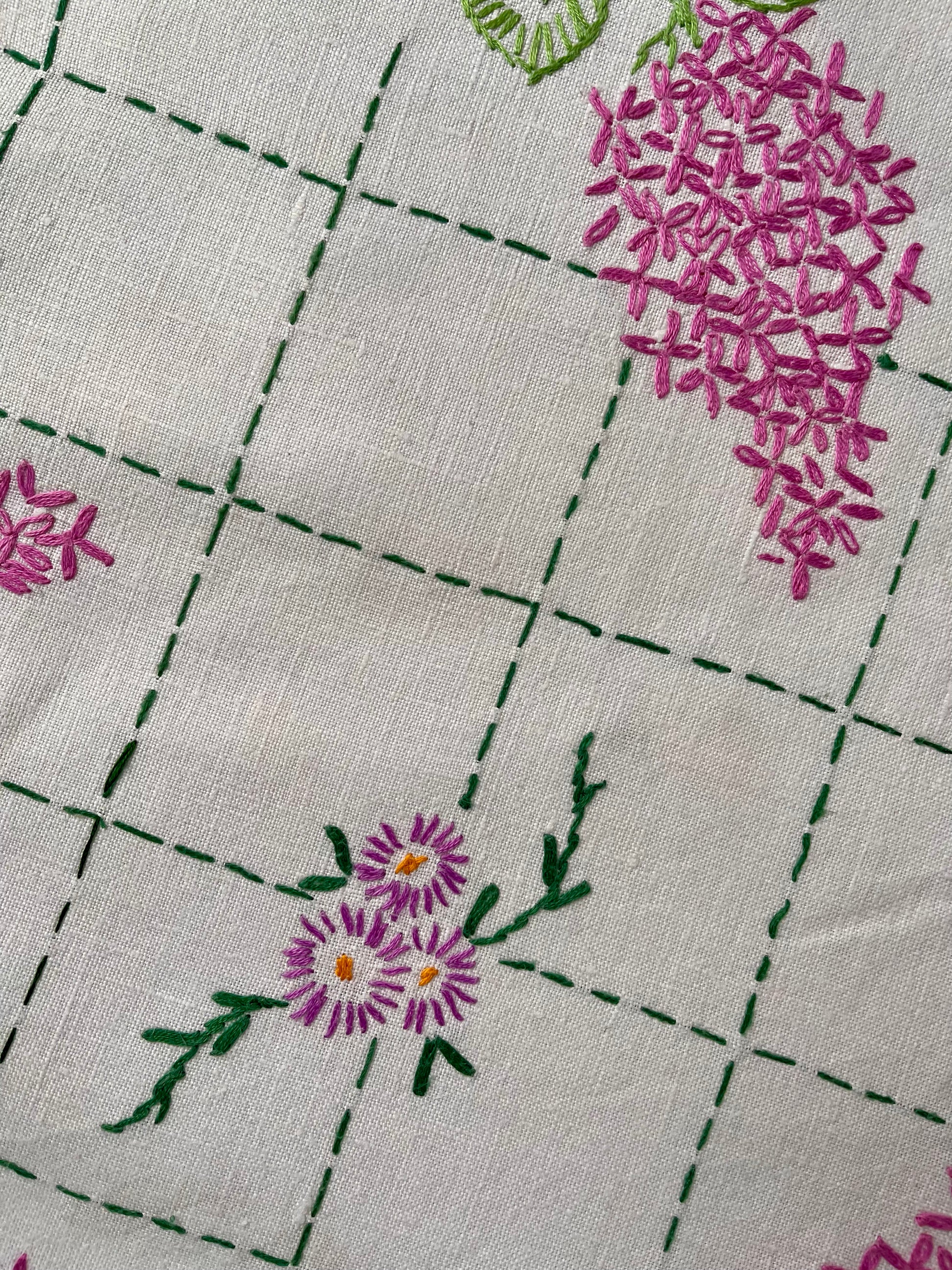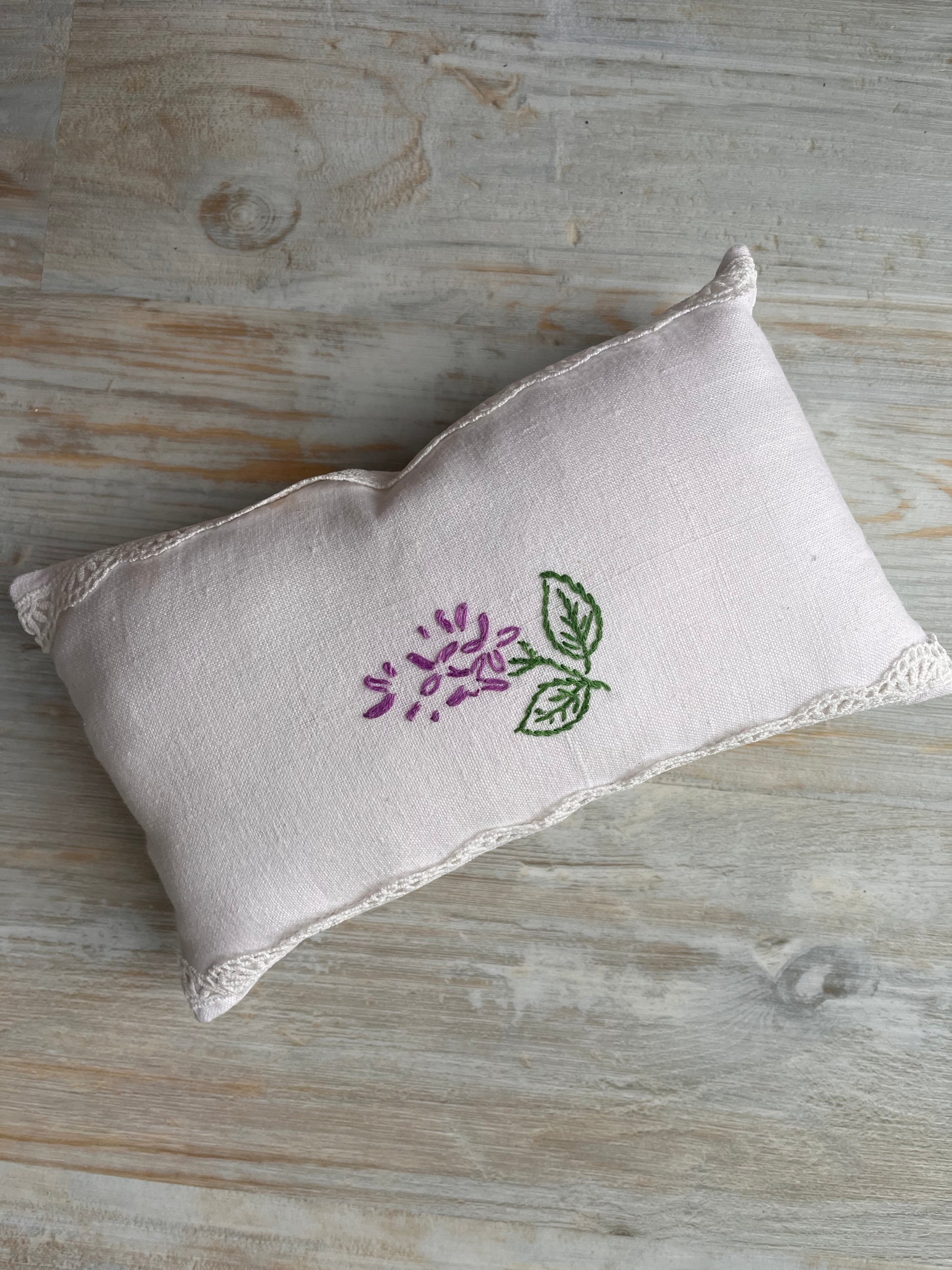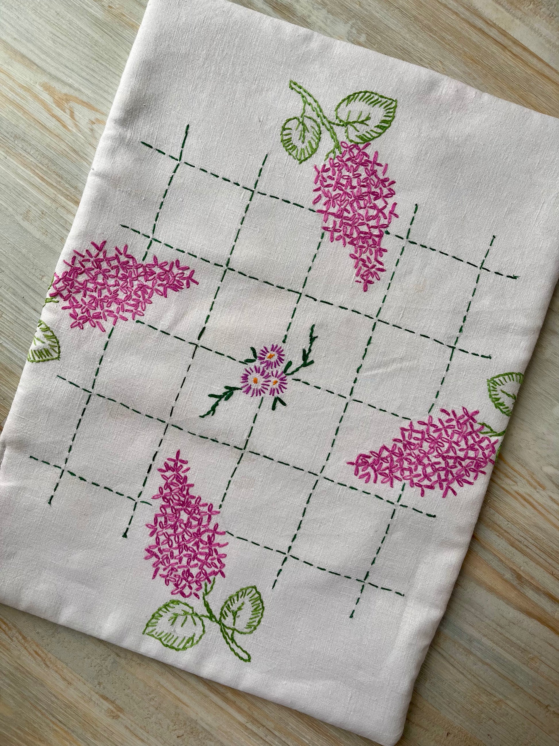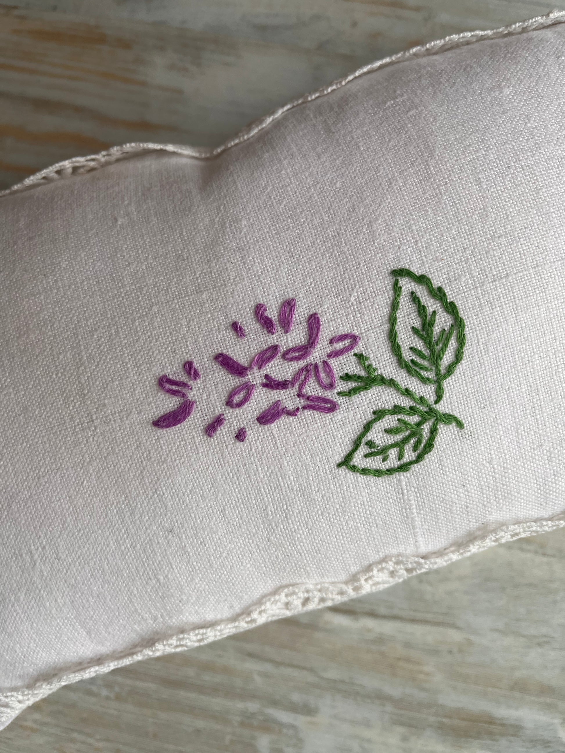 The quilt, is made from a beautiful, hand embroidered, vintage table cloth. Its lilac design has been embroidered onto linen and is in pretty shades of pink and purple. The quilt is lightly padded and backed with white cotton fabric. The matching pillow has a small lilac embroidery on it and is trimmed with scalloped lace; it is also backed with white cotton fabric. Both the quilt and the pillow can be hand or machine-washed and ironed.