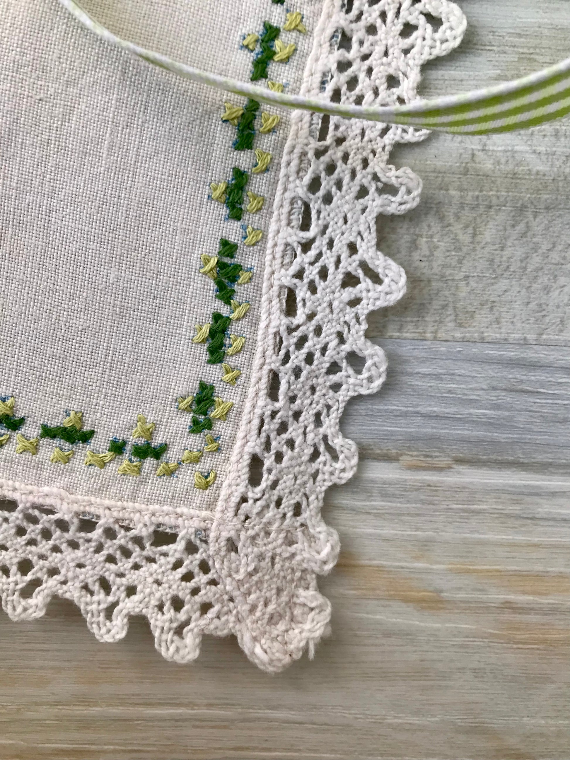 A perfect little apron for one of The Jemima Company’s rag dolls or your very own doll or toy. It makes the perfect addition to an outfit and will complement some imaginative play in the kitchen or workshop - it’s very important for a rag doll to cover up before a messy job! This apron is made from a delightful vintage hand-embroidered square with gingham ribbon ties and a lace trim. It can be hand-washed. Have a look at our photographs to see the measurements to check if it will fit your own doll or toy.