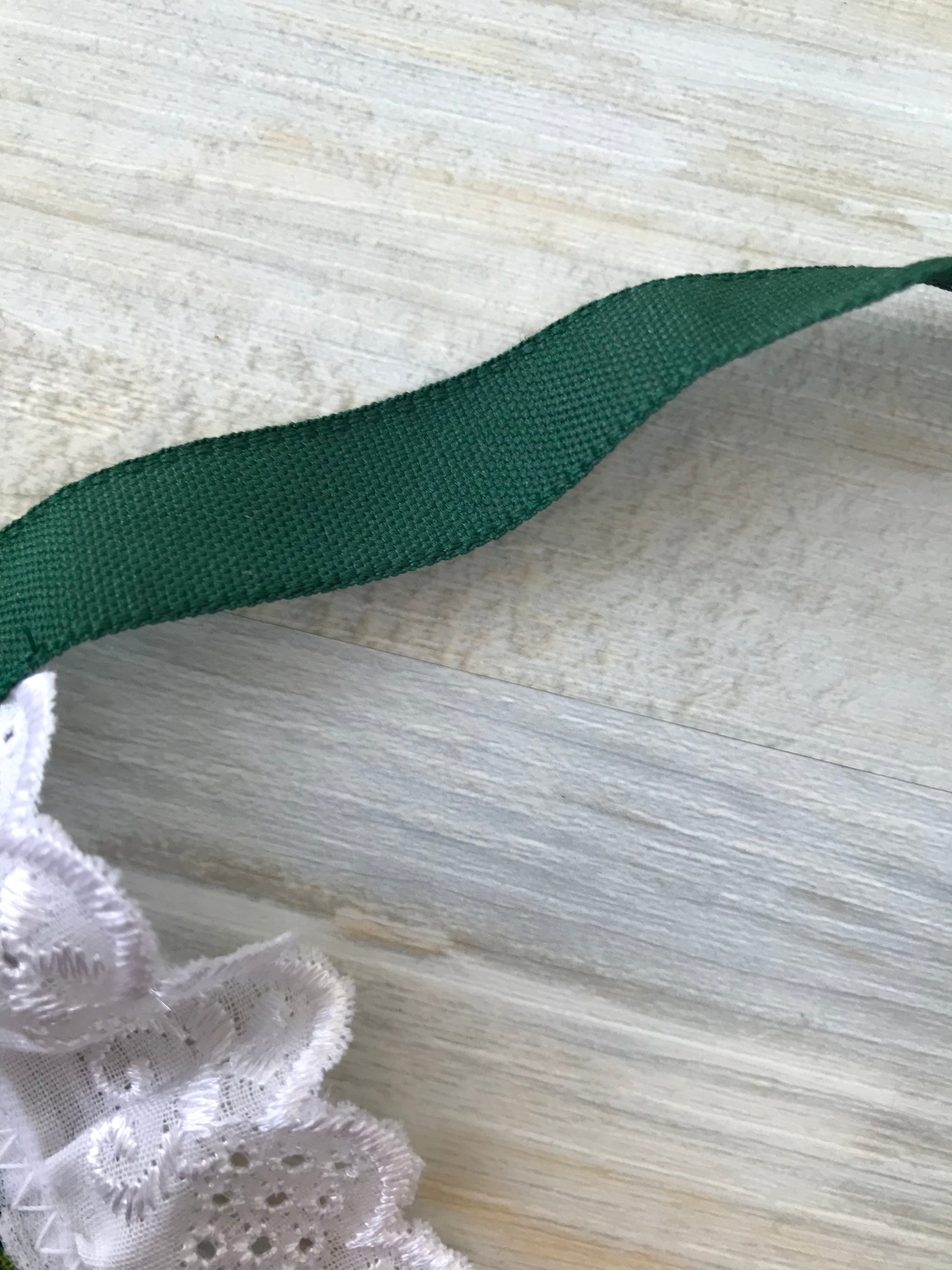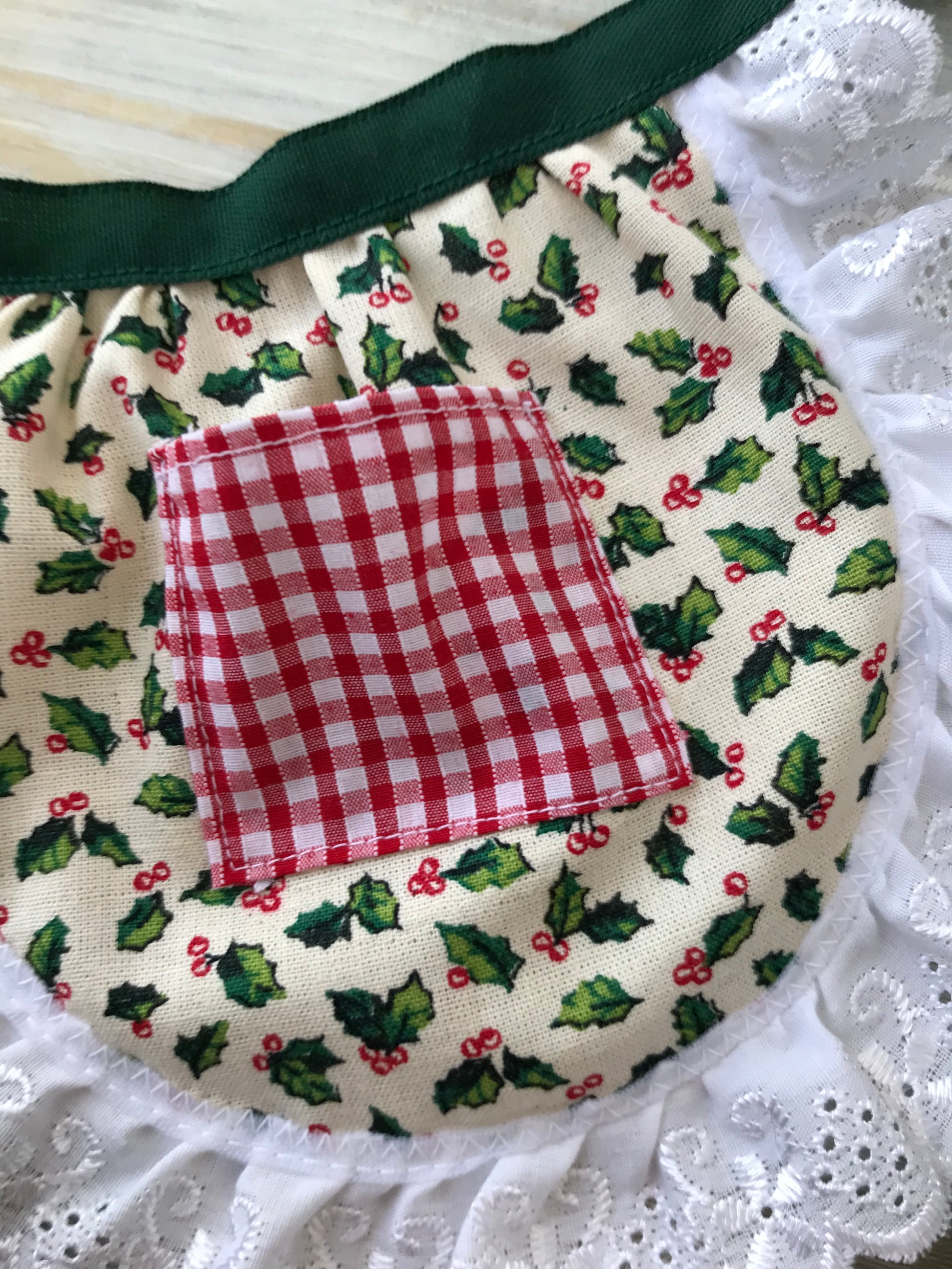 This apron is made from some delightful holly-print cotton Christmas fabric with a deep green ribbon tie, a red gingham pocket and Broderie Anglaise trim around it. It can be hand-or machine-washed.
