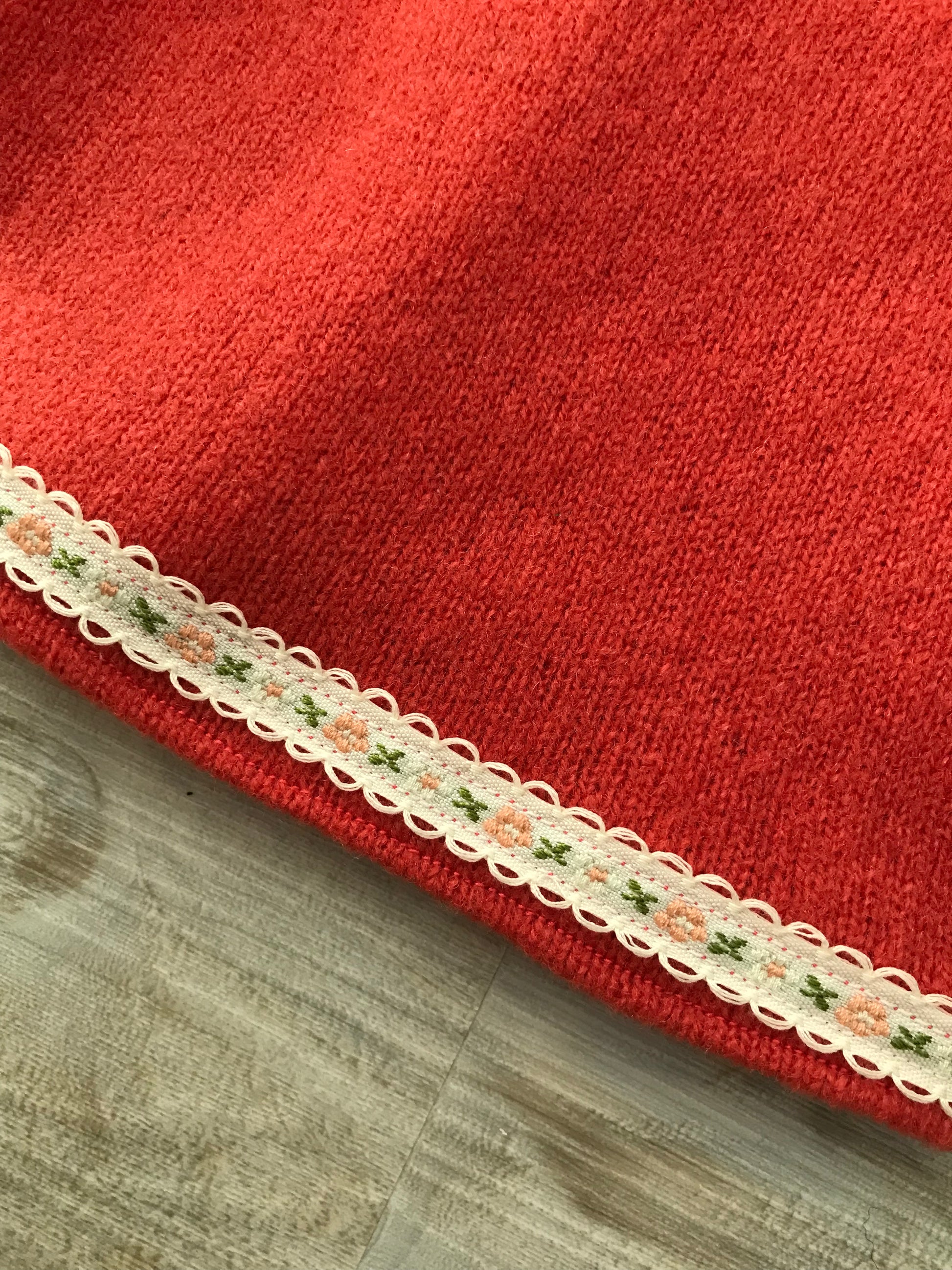 This delightful sleeveless pullover is made from soft, salmon pink lambswool, is trimmed along the hem with an embroidered, floral trim, and has a velcro opening down the back. This garment can be worn along with some of our other outfits and would look perfect on top of one of our blouses or dresses.