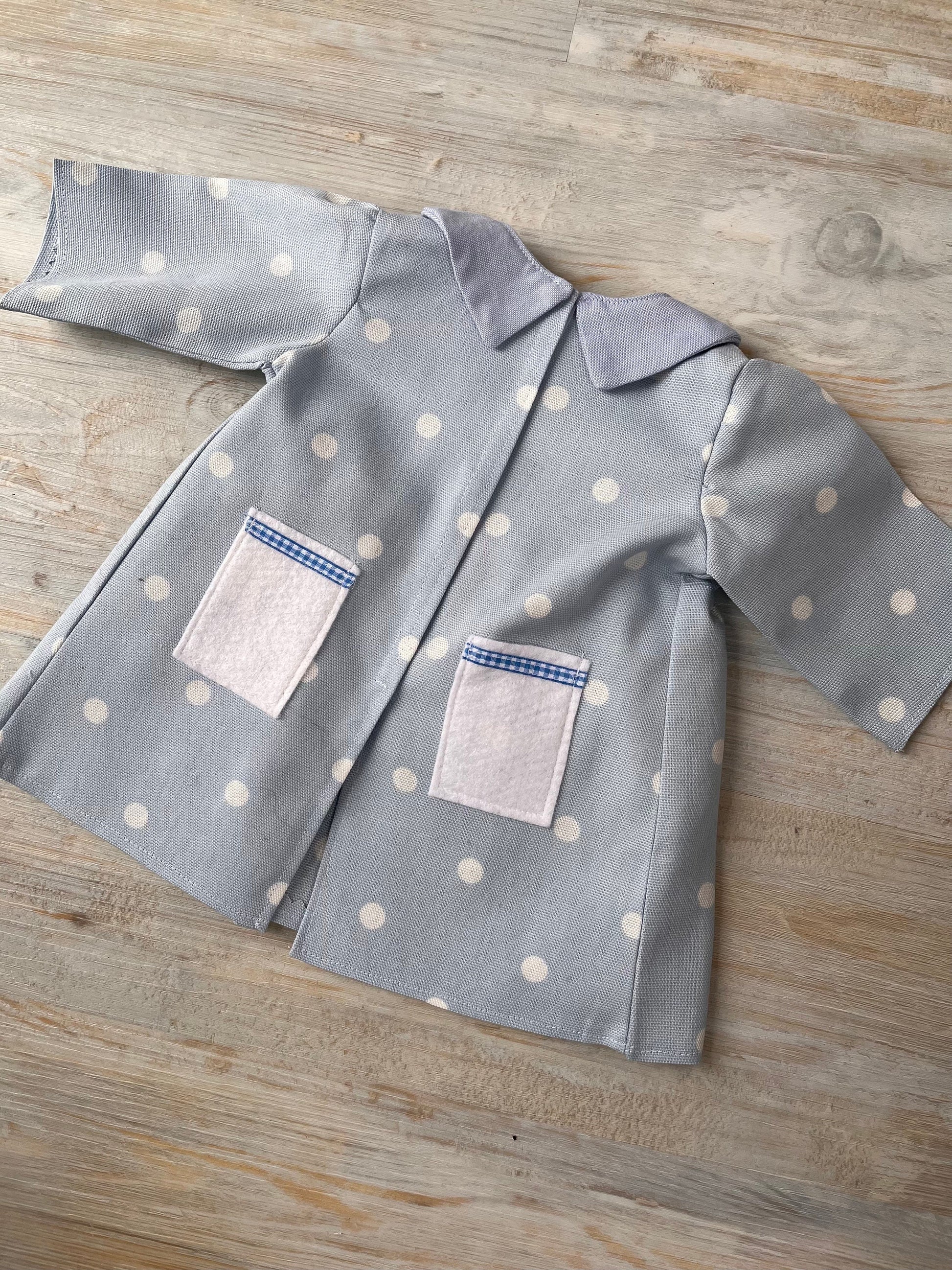 This lovely coat is made from a lovely pale blue fabric with white polka dots, with a blue cotton collar and felt patch pockets with a gingham ribbon trim. The coat has a back yoke and gathered back skirt and a velcro opening down the front.