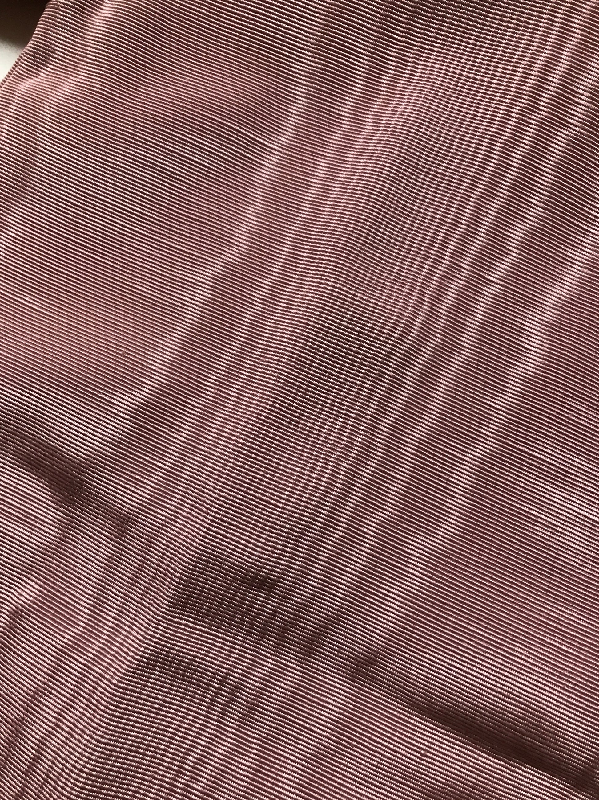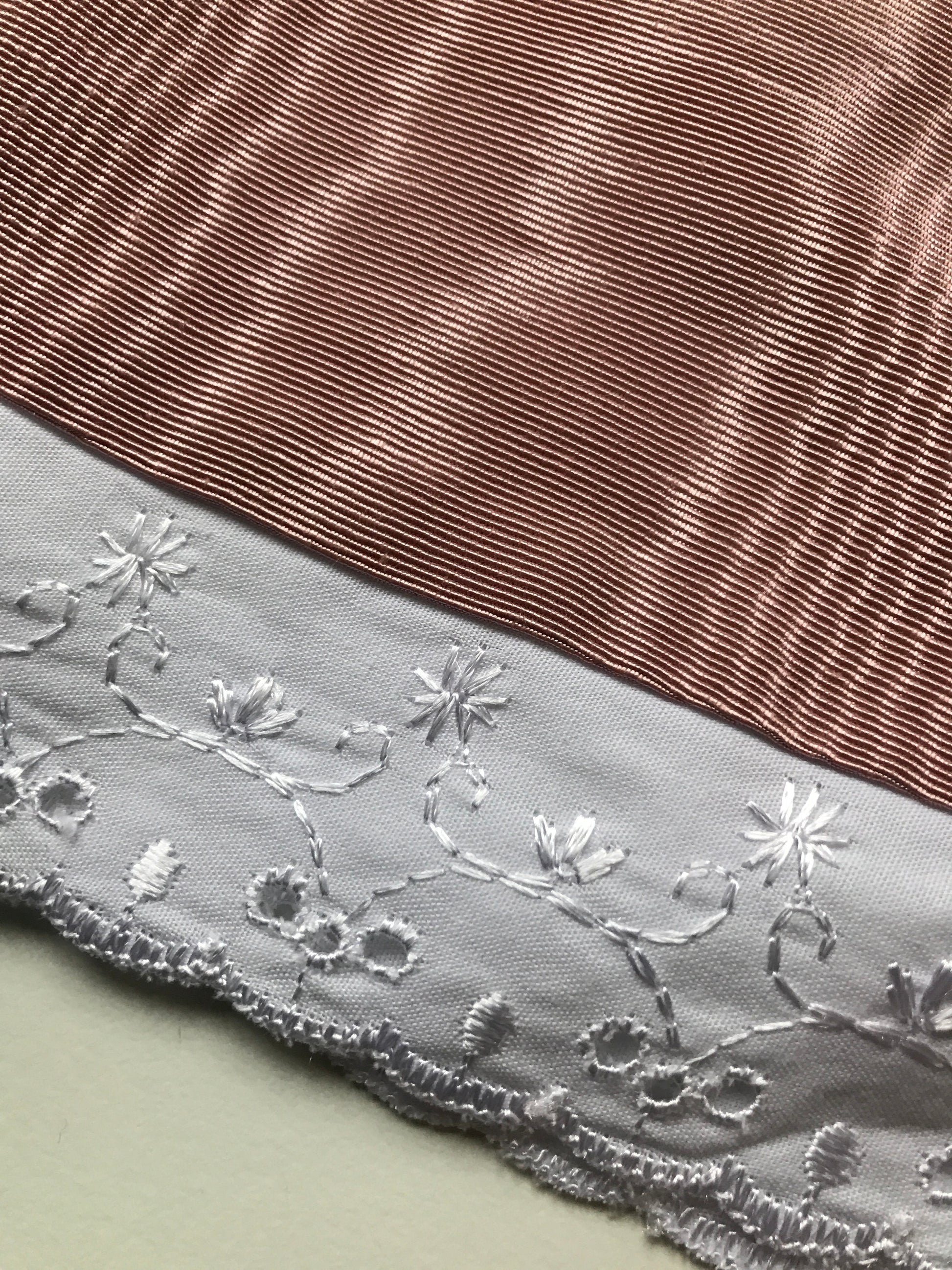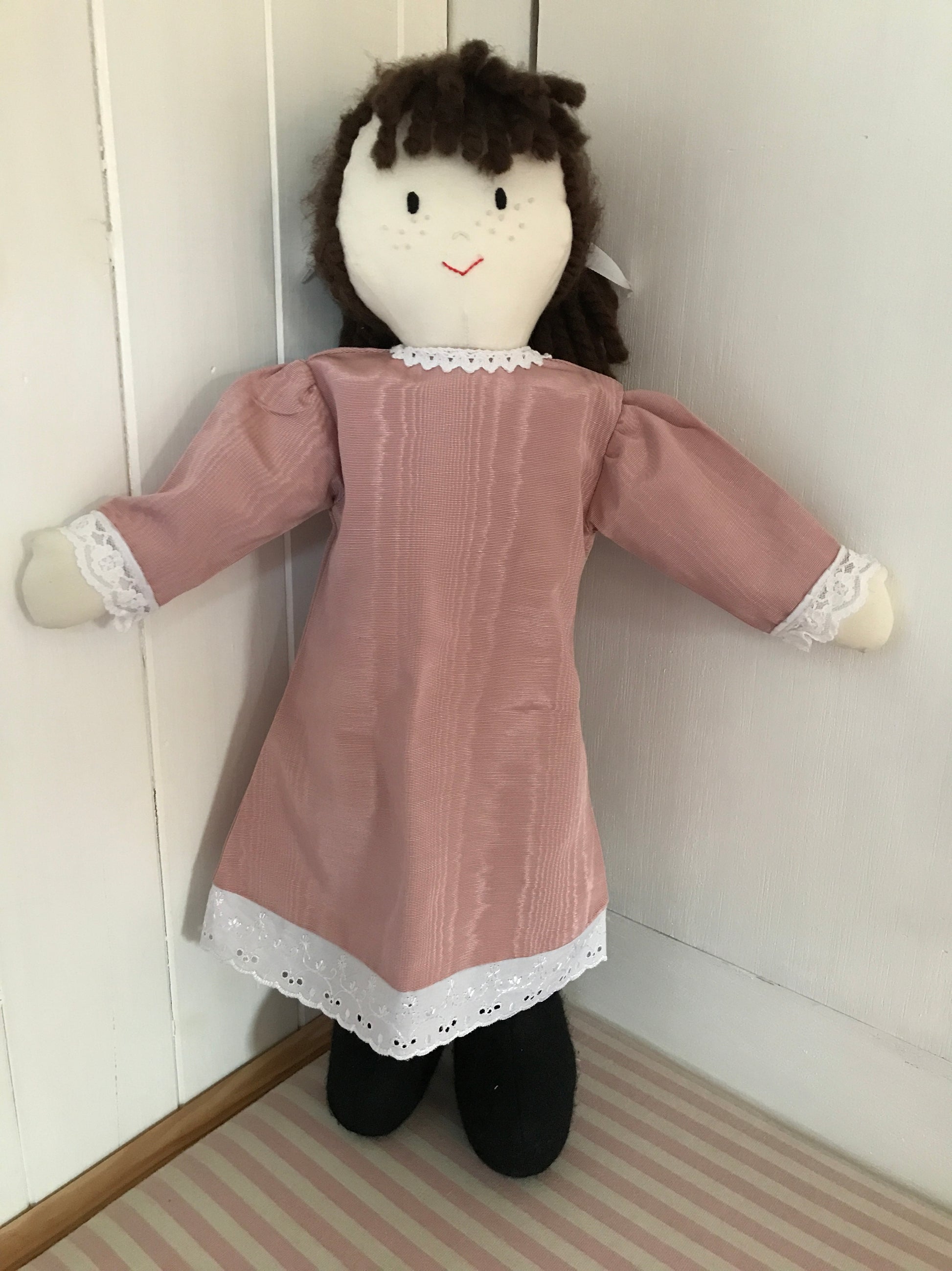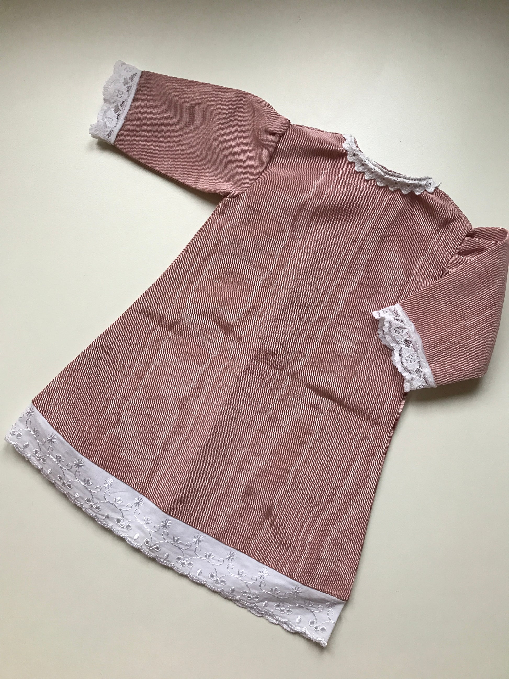 A beautiful dolls dress made from a dusky pink water silk-type fabric. The dress has a beautiful Broderie Anglaise lace trim at the hem and a lace trim round the cuffs. There is also a little lace trim around the collar.