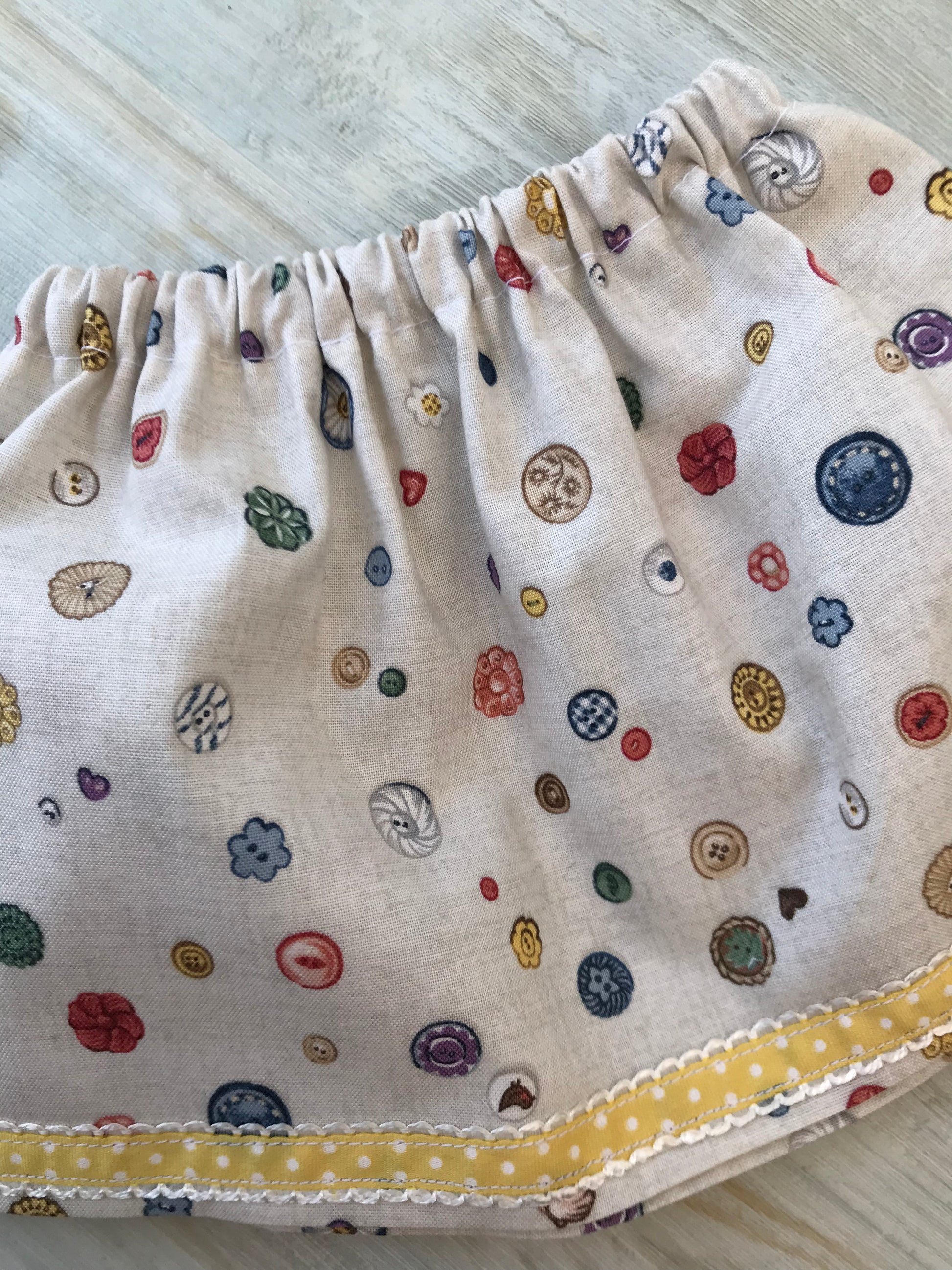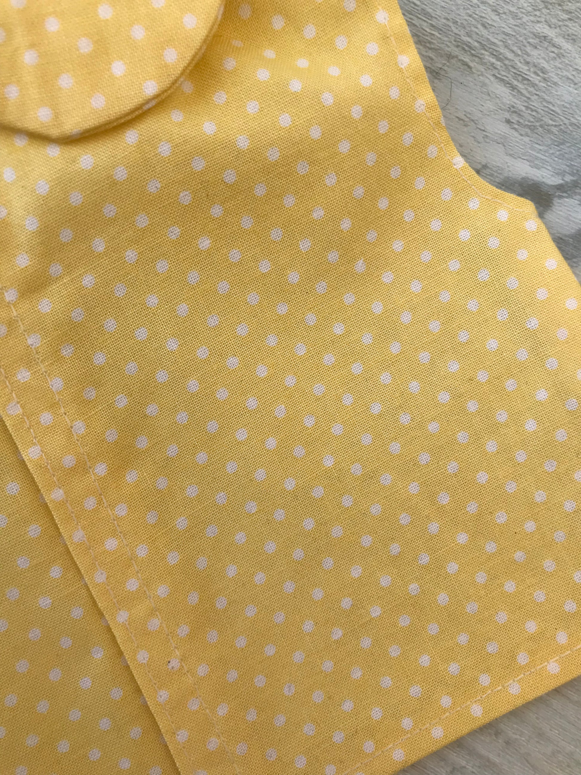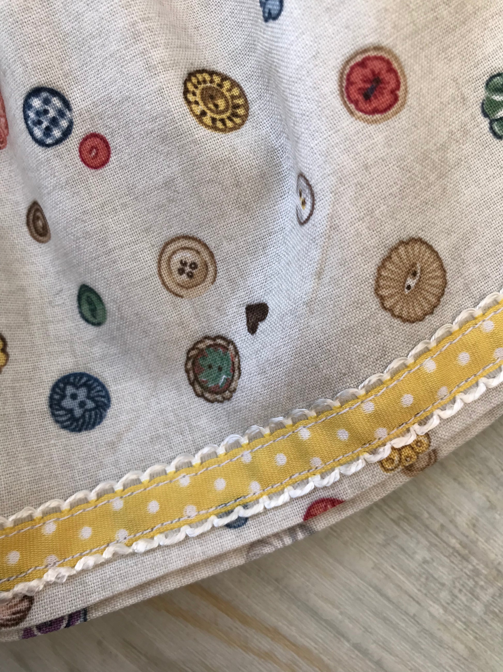 The blouse is made from a very pretty butter yellow cotton with white polka dots. It is sleeveless, has a Peter Pan collar and a velcro opening down the front. The skirt is made from a lovely beige cotton fabric with a button print all over it. It has an elasticated waist and a matching butter yellow polka dot trim along the hem.