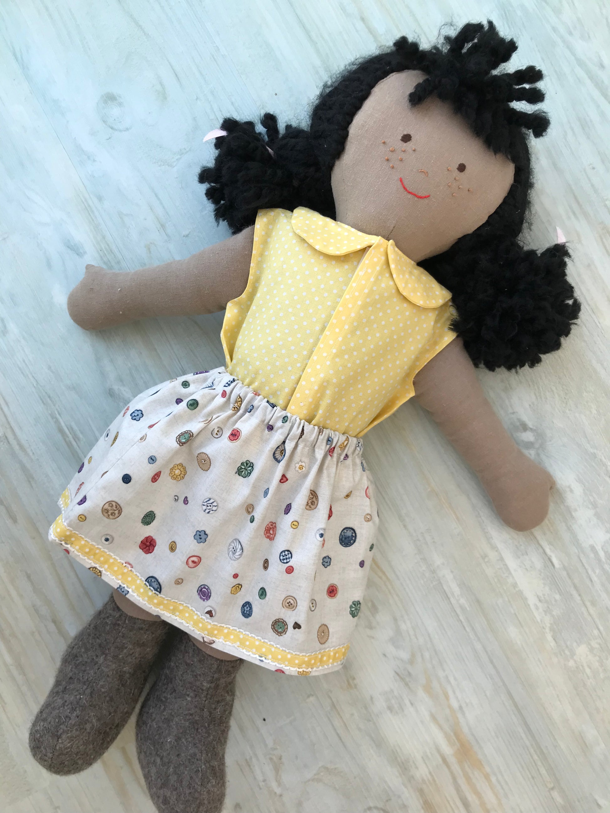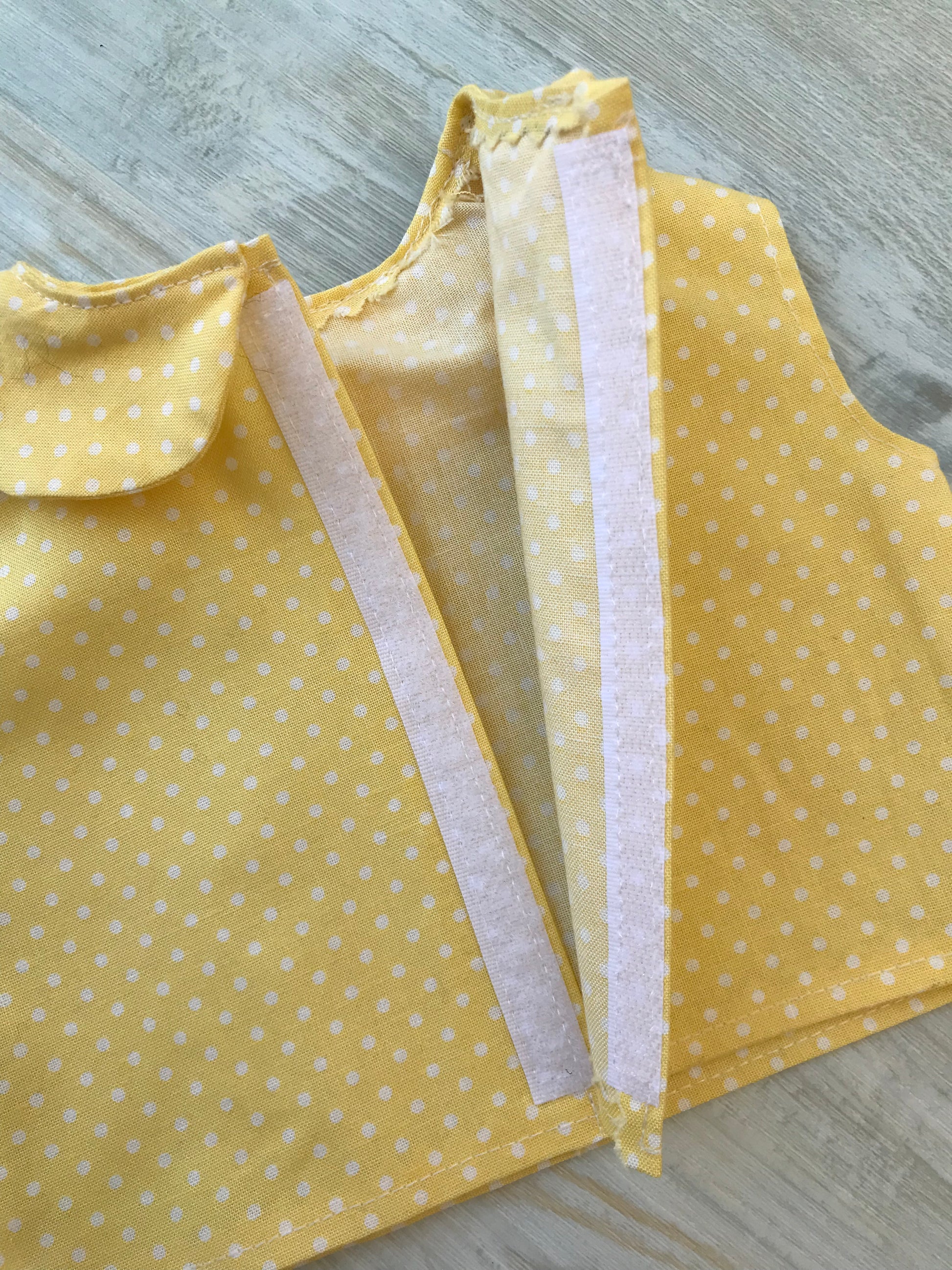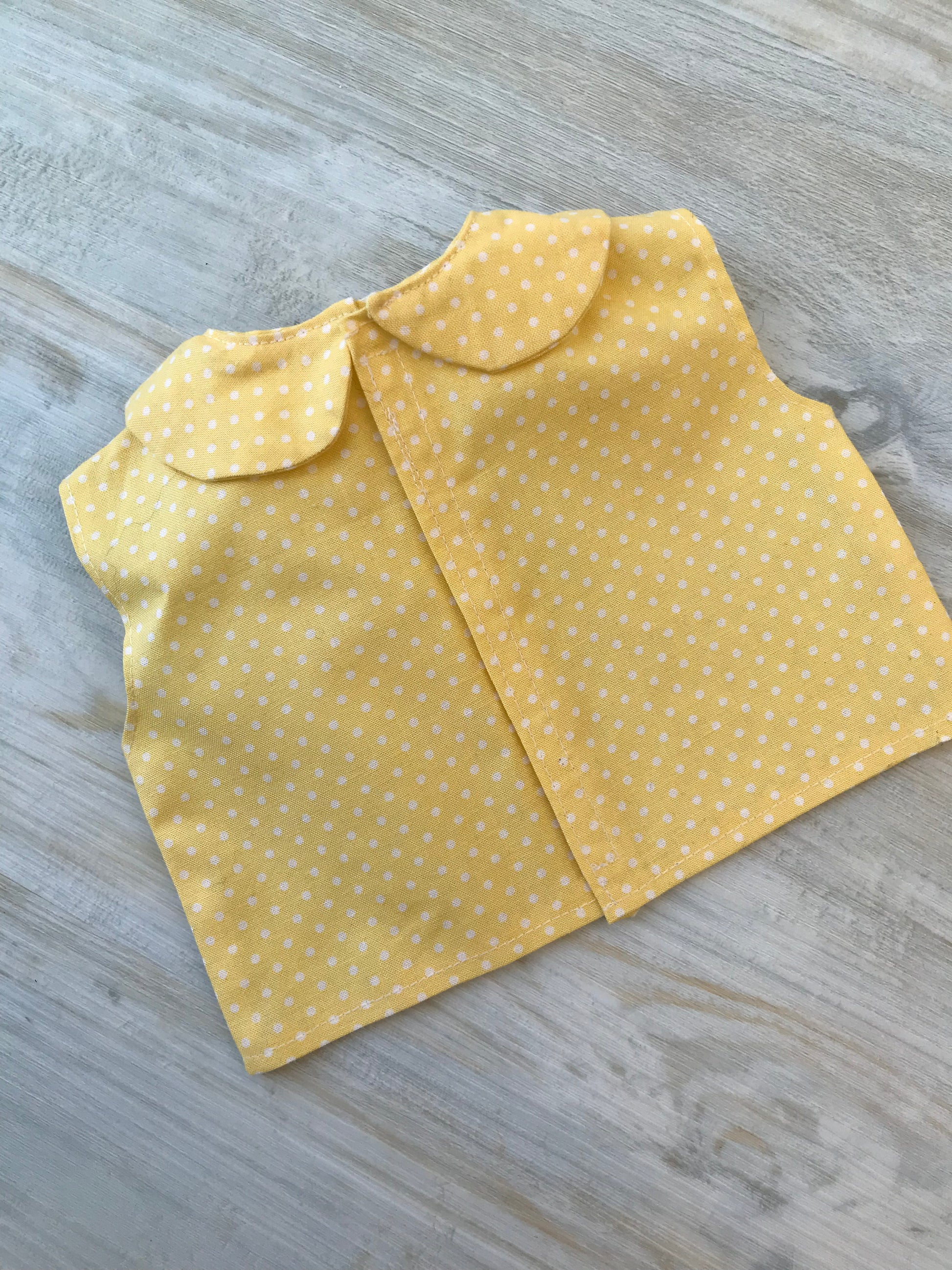 The blouse is made from a very pretty butter yellow cotton with white polka dots. It is sleeveless, has a Peter Pan collar and a velcro opening down the front. The skirt is made from a lovely beige cotton fabric with a button print all over it. It has an elasticated waist and a matching butter yellow polka dot trim along the hem.