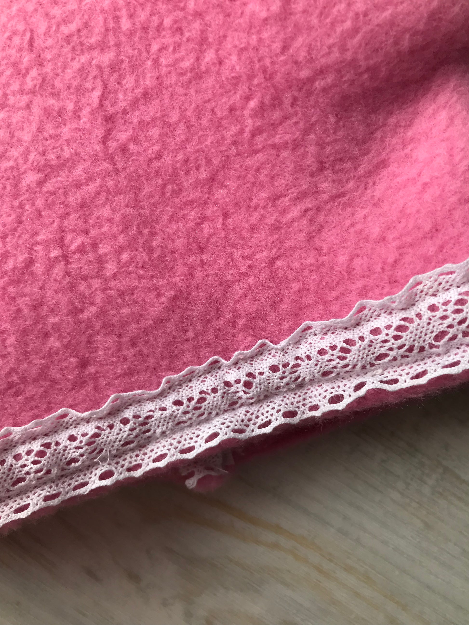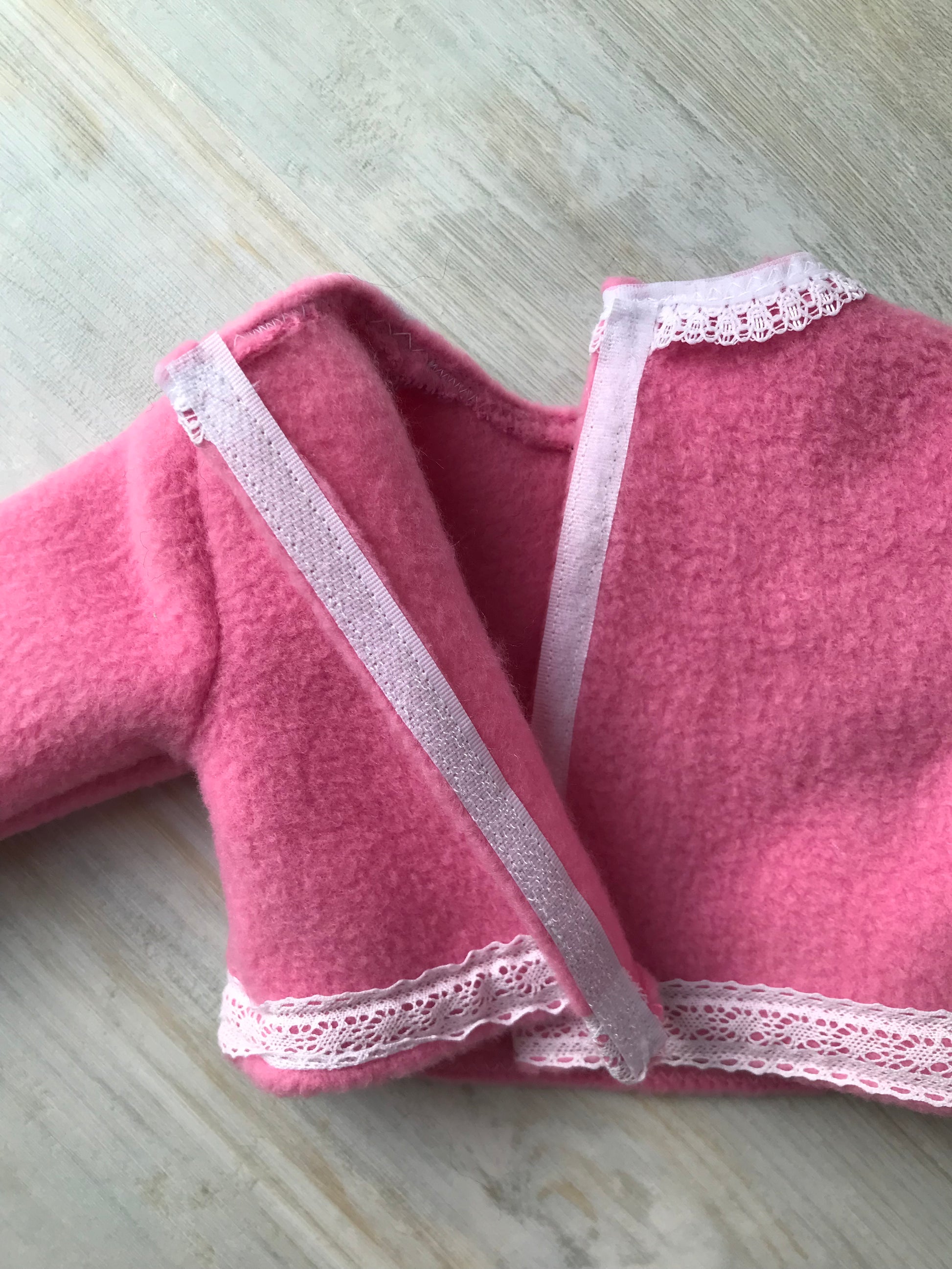 The jumper is made from a lovely soft, pink fleece fabric. It has a lace collar, a lace trim around the hem and a velcro opening down the back. The skirt is made from a pretty pink rosebud cotton fabric with a pink, gingham trim around the hem. It has an elasticated waist.
