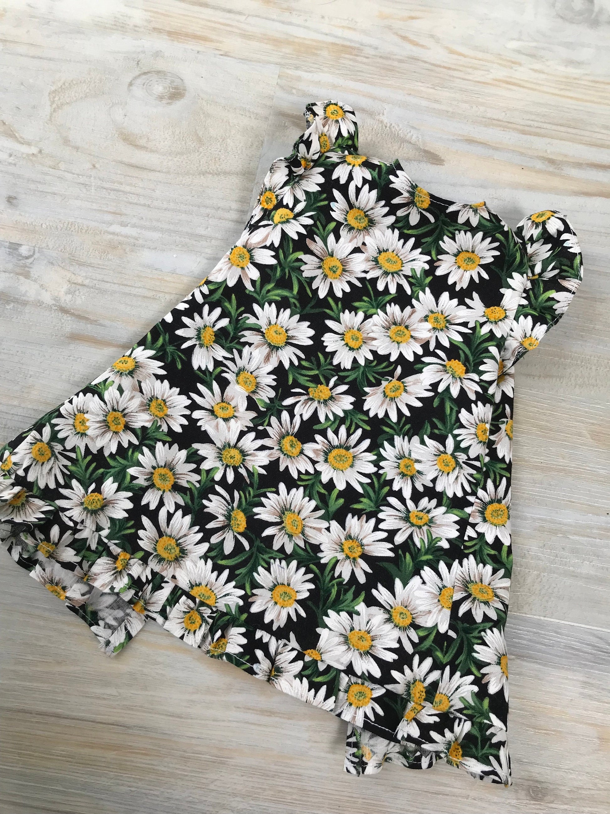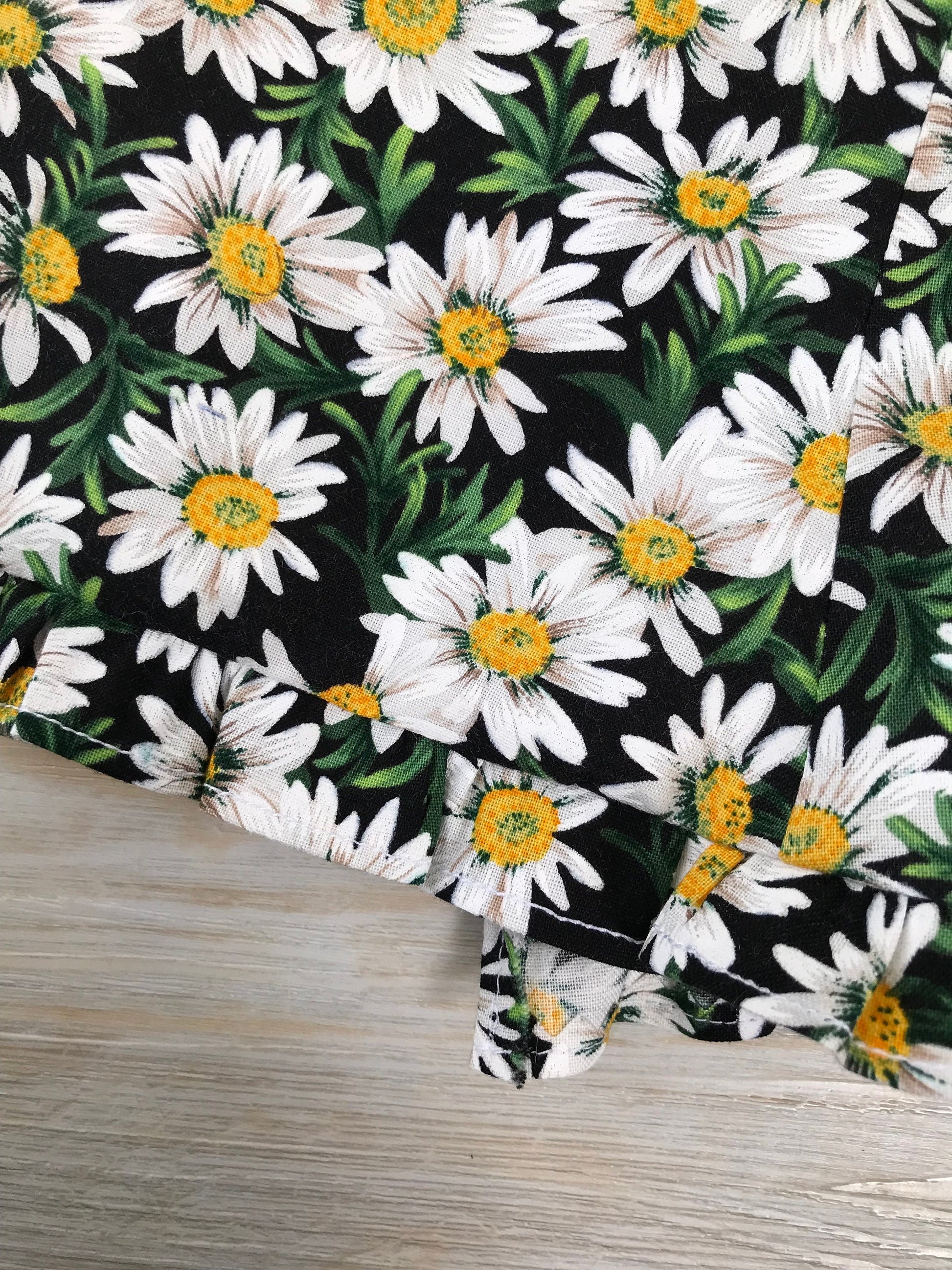 This sleeveless sundress has ruffles around the armholes and a ruffle hem, and ties at the back with two satin ribbon ties. The dress can be worn on its own or with one of The Jemima Company blouses underneath (for cooler weather!).