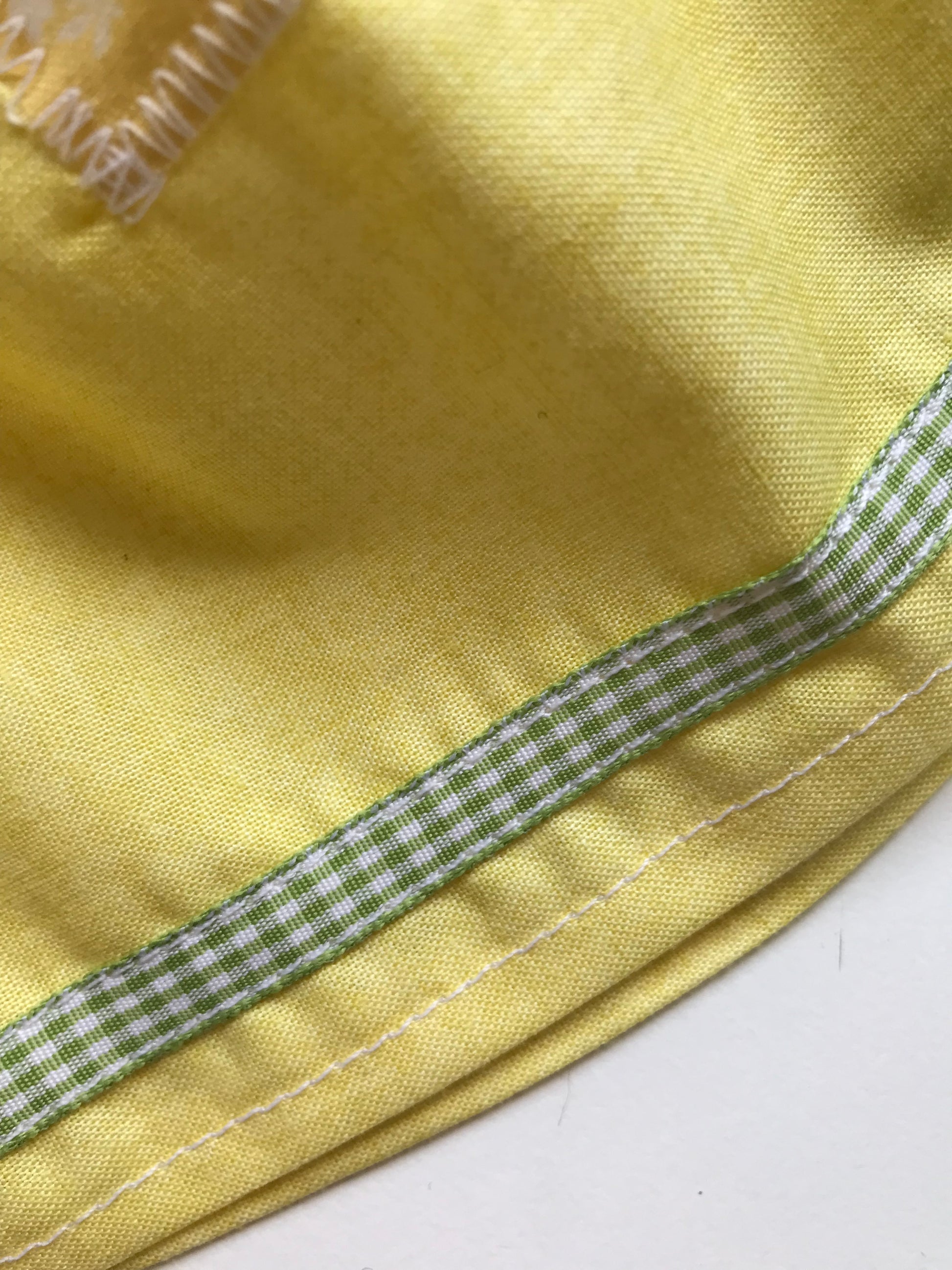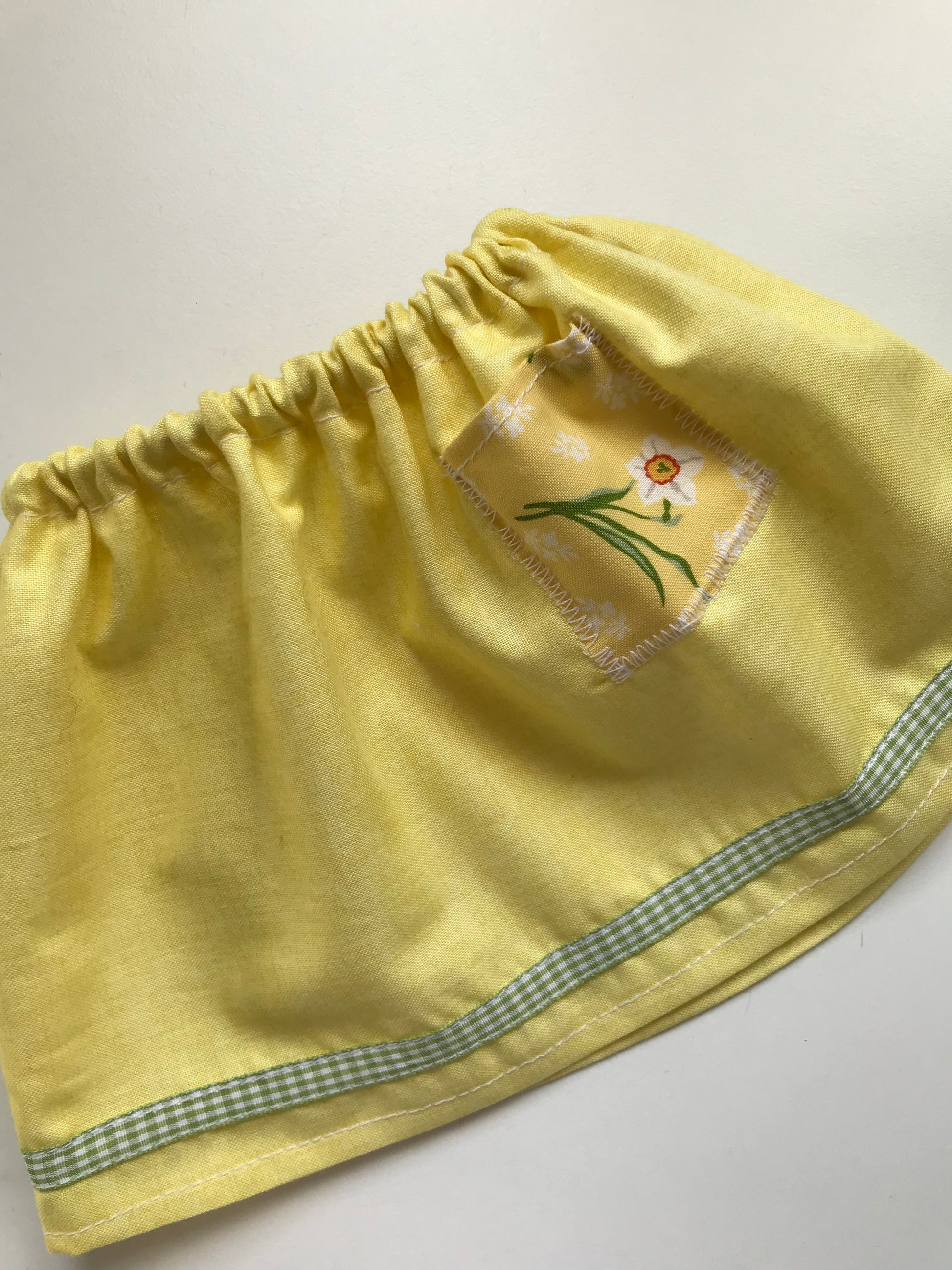 The blouse is made from a white printed cotton with a lace collar, a beautiful vintage trim down the front, short sleeves and a velcro opening down the back. The skirt is made from a lovely yellow cotton with a daffodil print pocket, gingham trim and an elasticated waist.