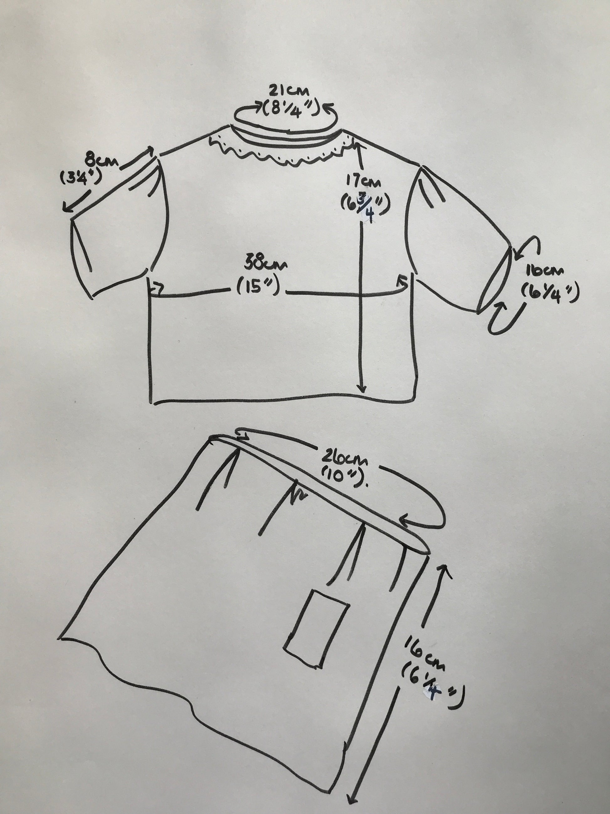 A delightful skirt and blouse set which is designed to fit The Jemima Company dolls but which may well fit your own doll or toy. Have a look at the photos to see all measurements of the garments.