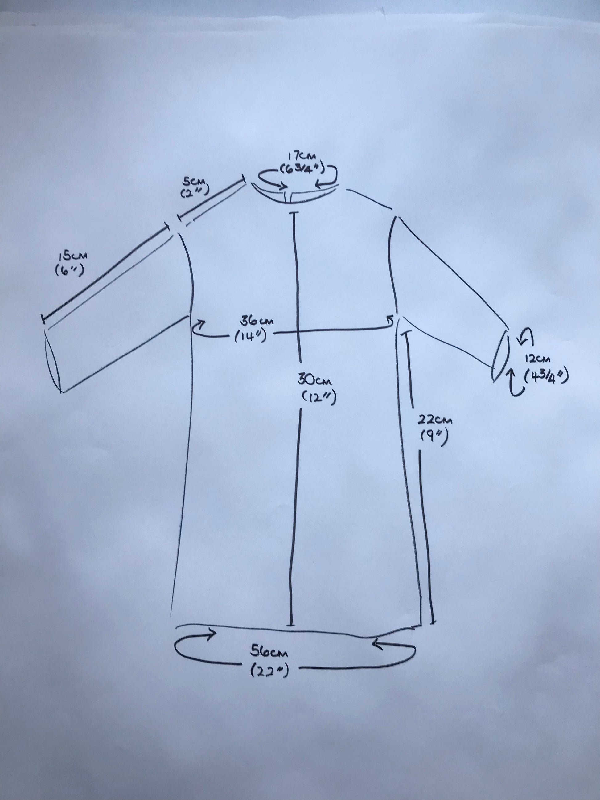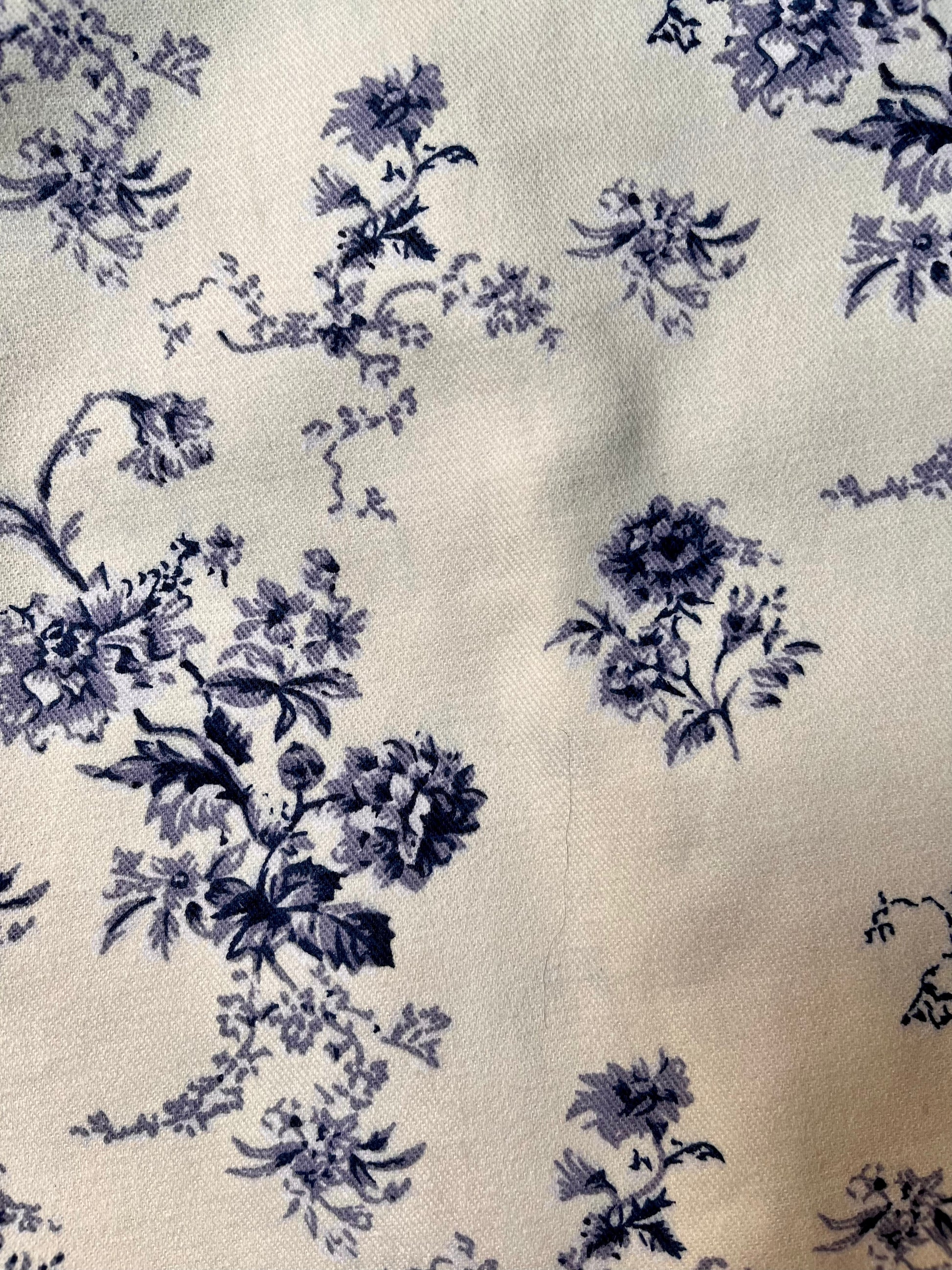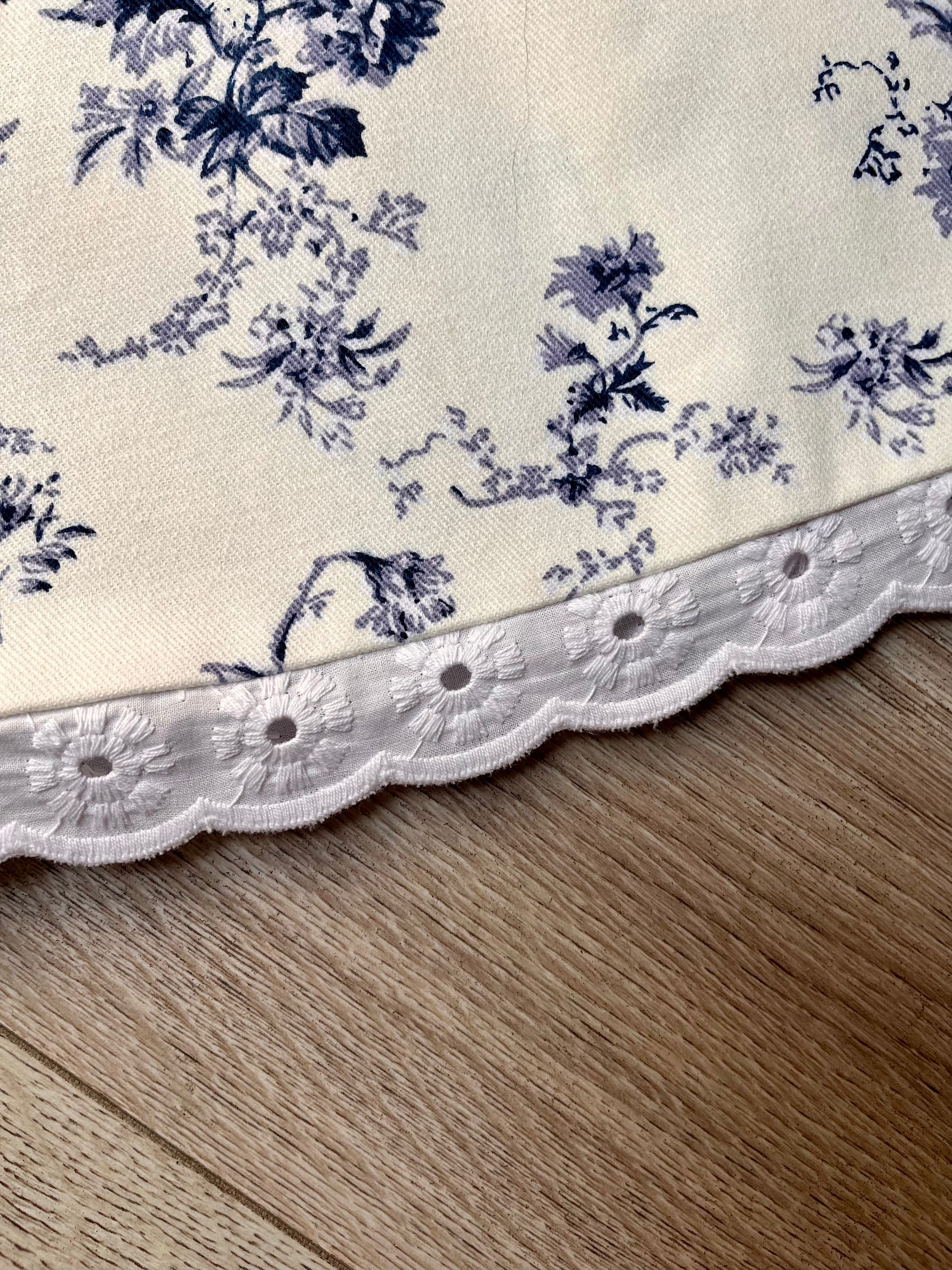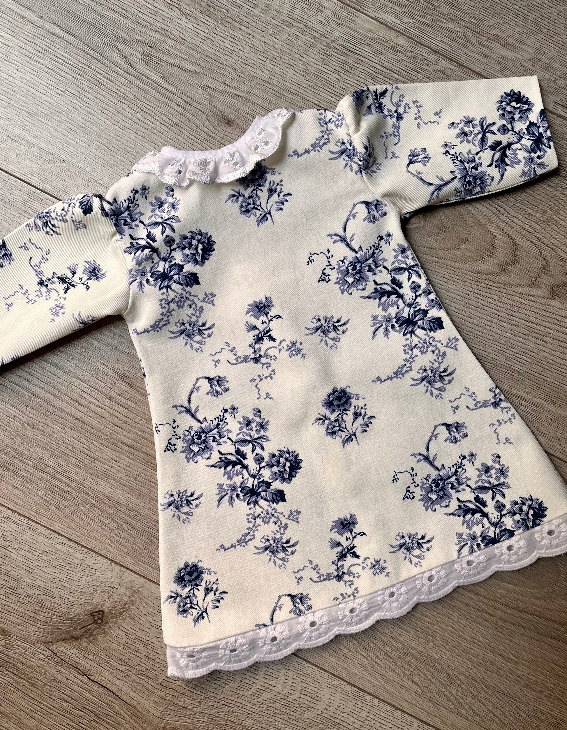 The dress is made from a beautiful blue and white floral print cotton, has a Broderie Anglaise lace collar and a Broderie Anglaise trim around the hem. There is a velcro opening down the back of the dress.