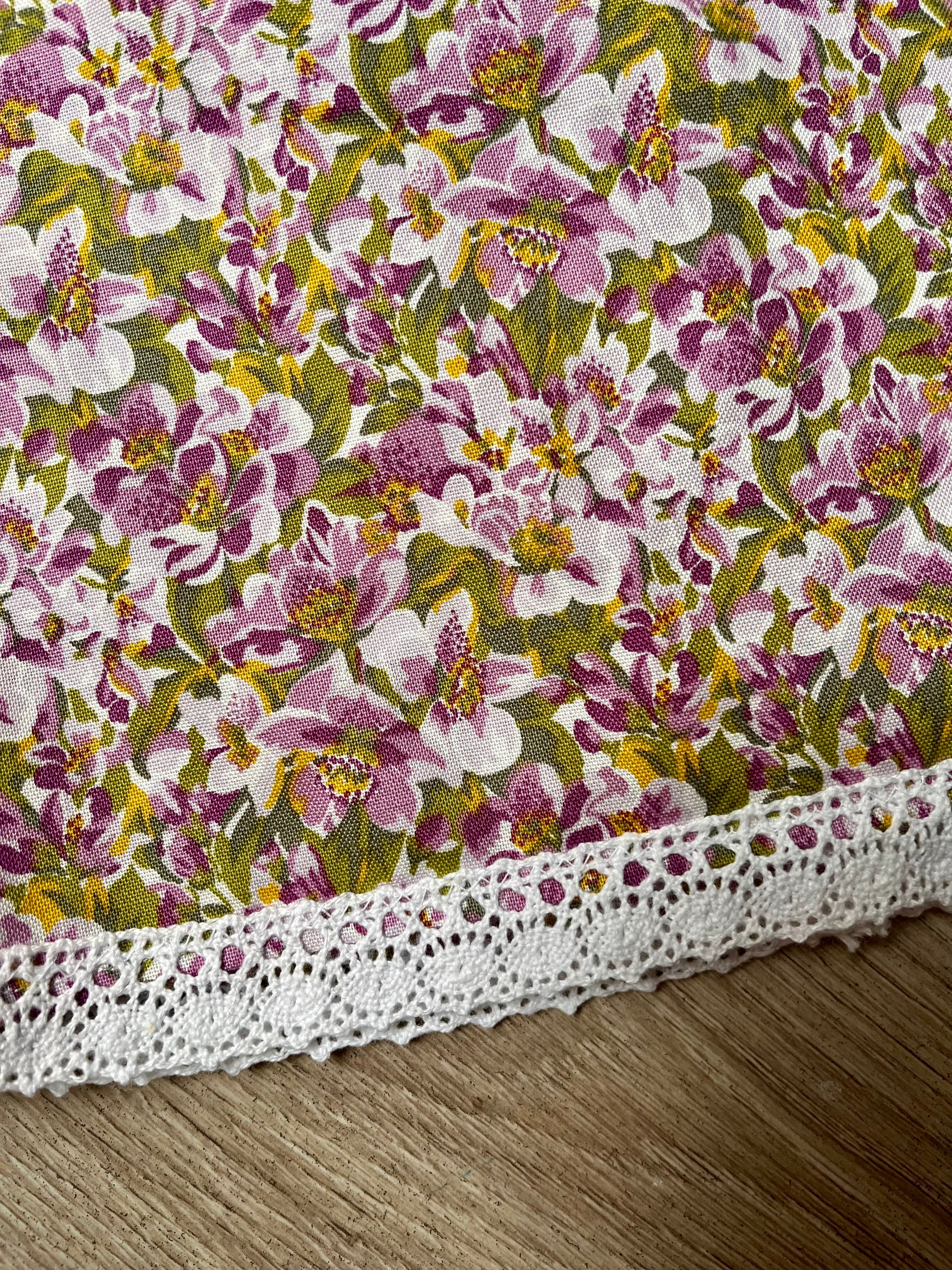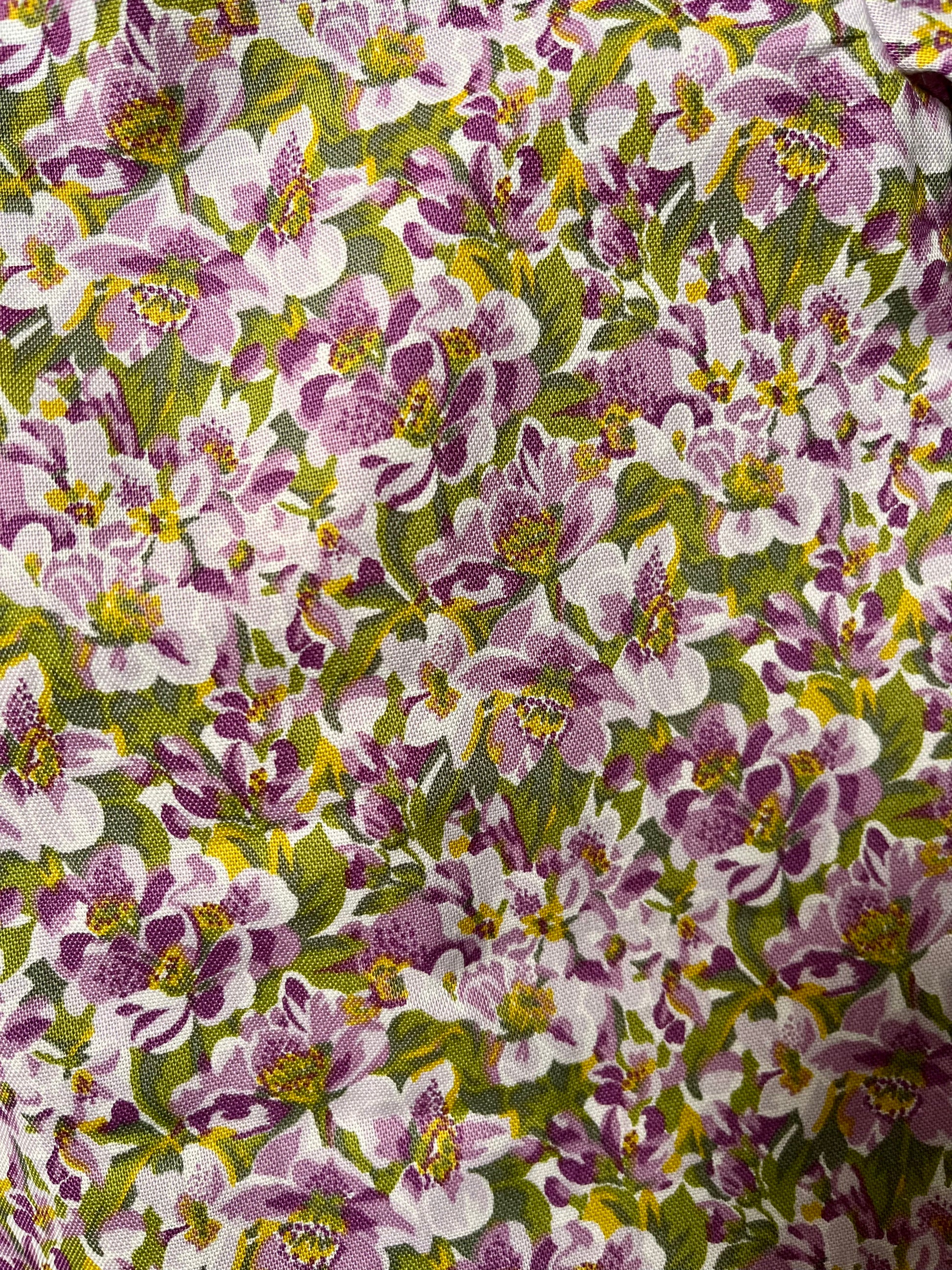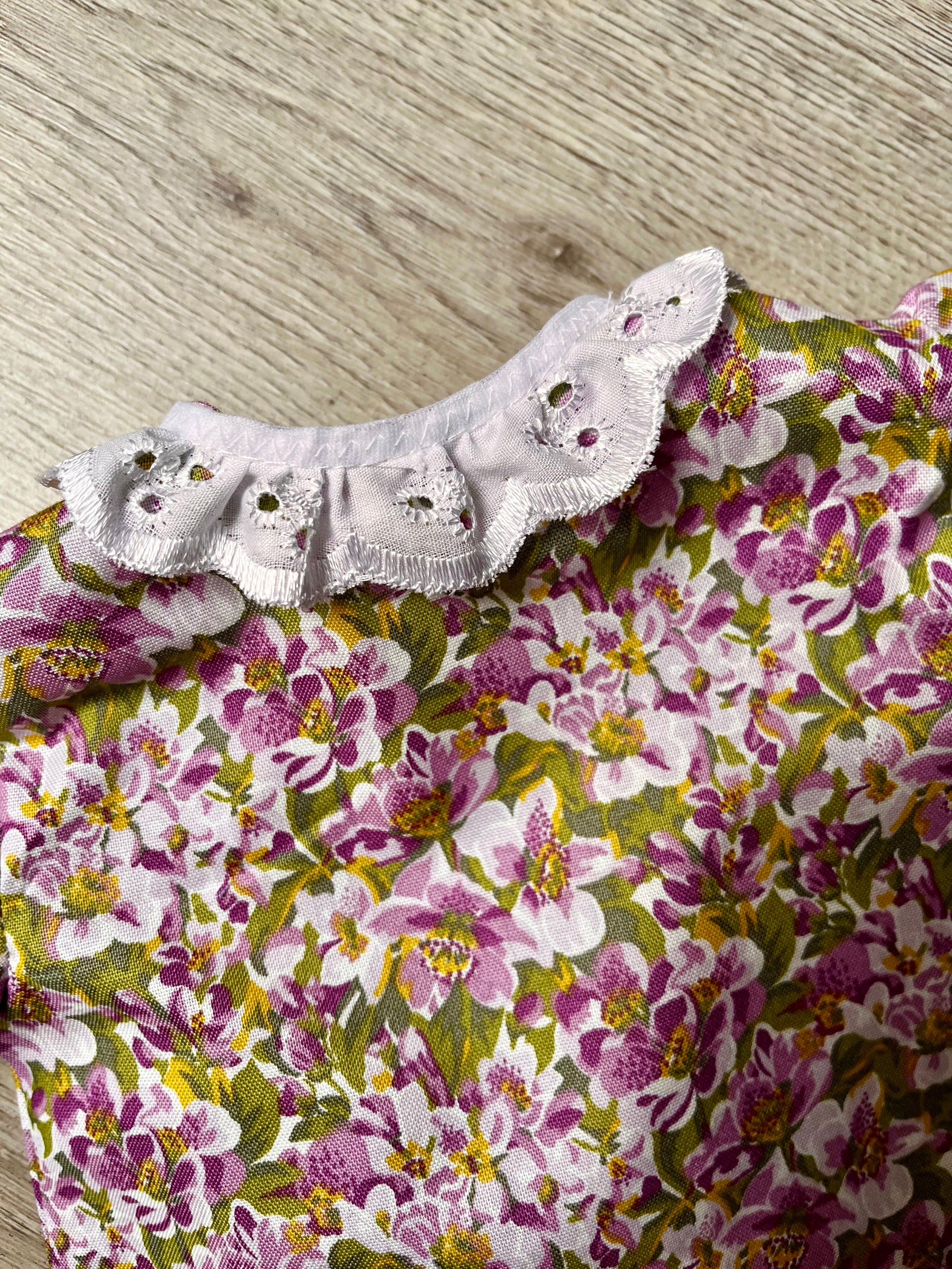 The dress is made from a beautiful Liberty print cotton, 'Hillside Rhododendron'. It is a floral print in shades of purple, lilac and green, has a Broderie Anglaise lace collar and a cotton lace trim around the hem. There is a velcro opening down the back of the dress.