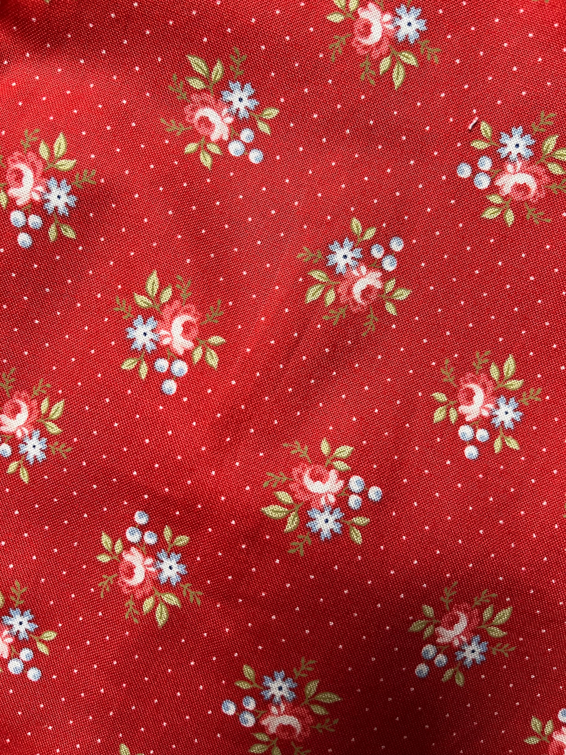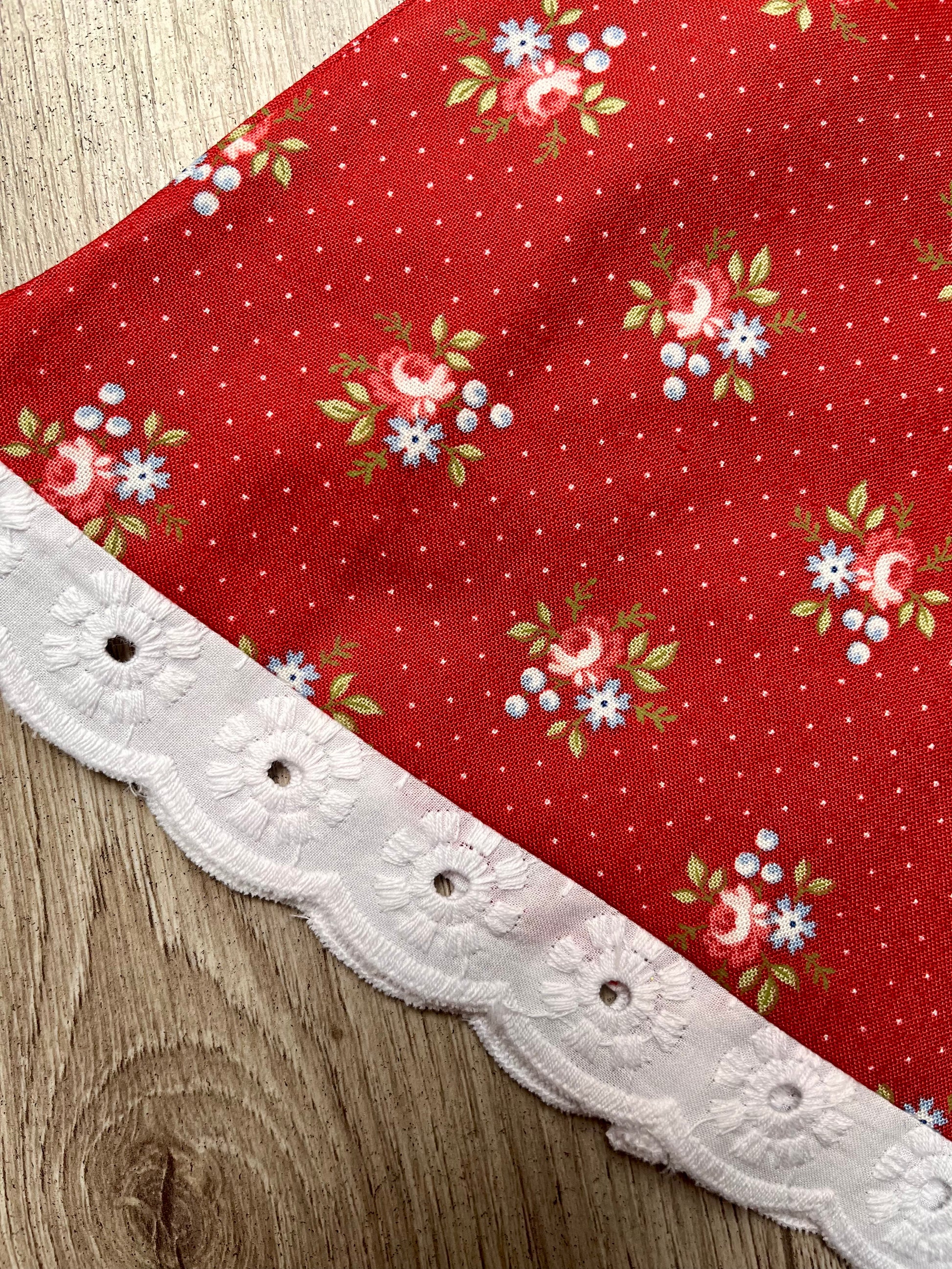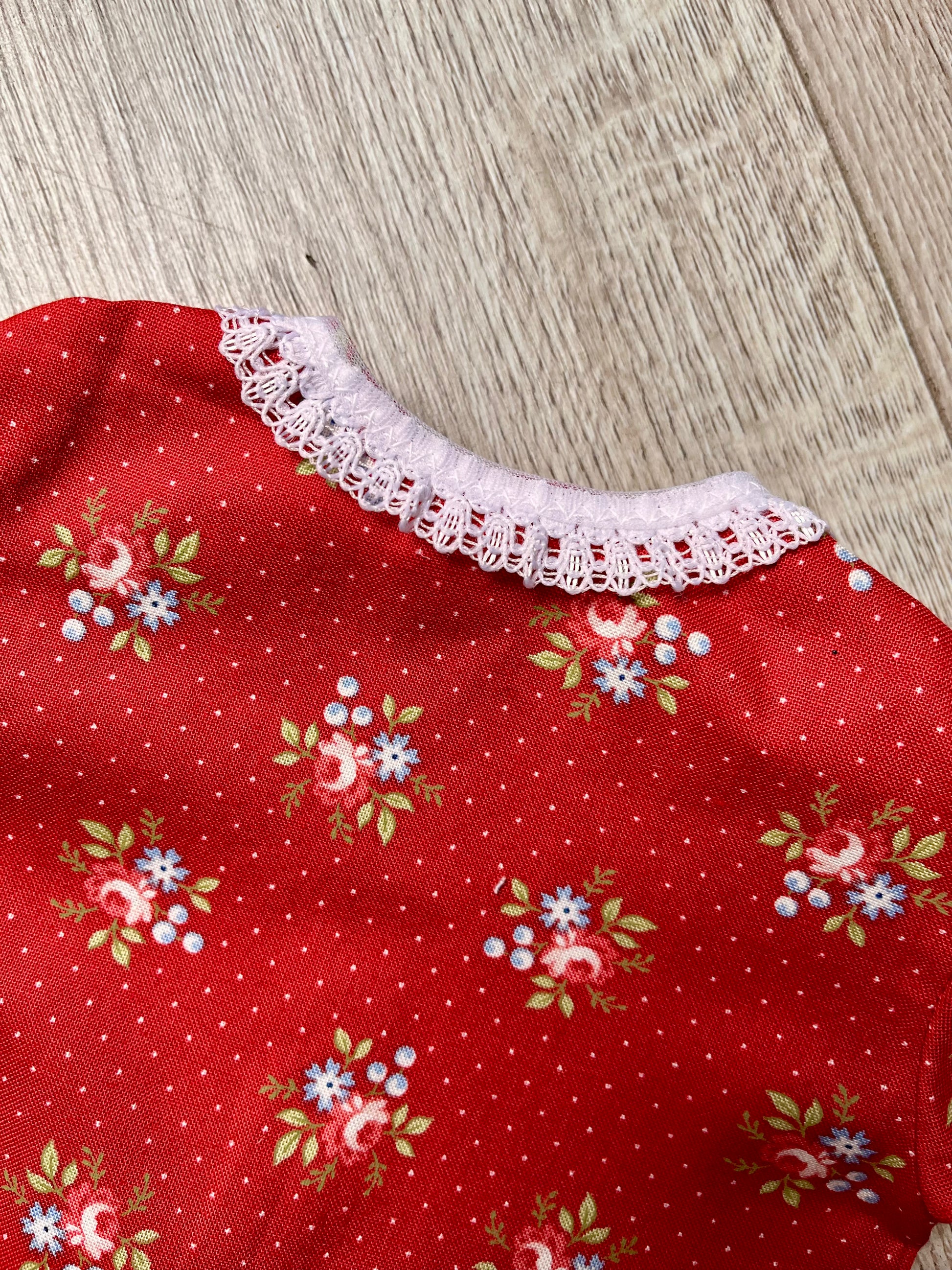 The dress is made from a beautiful red floral print cotton, has a Broderie Anglaise lace collar and a lace trim around the hem. There is a velcro opening down the back of the dress.