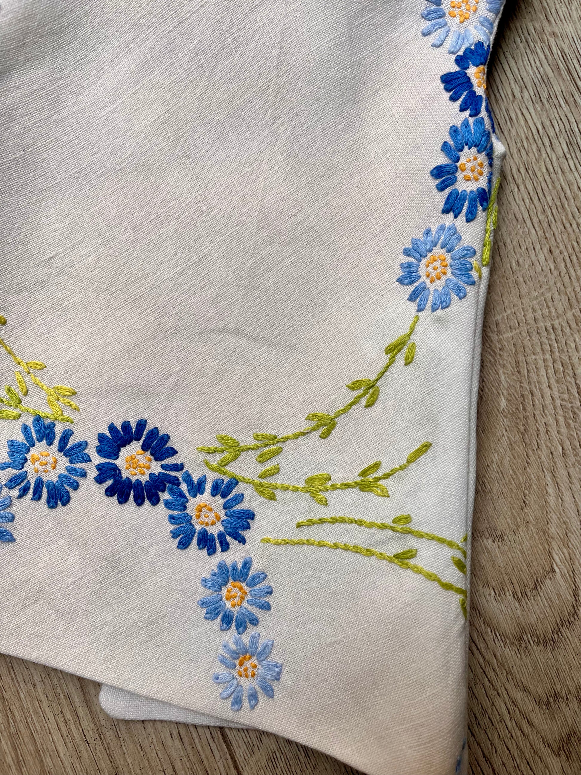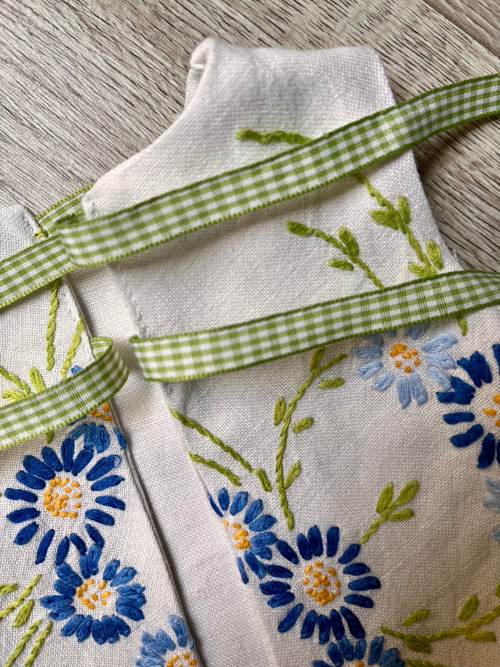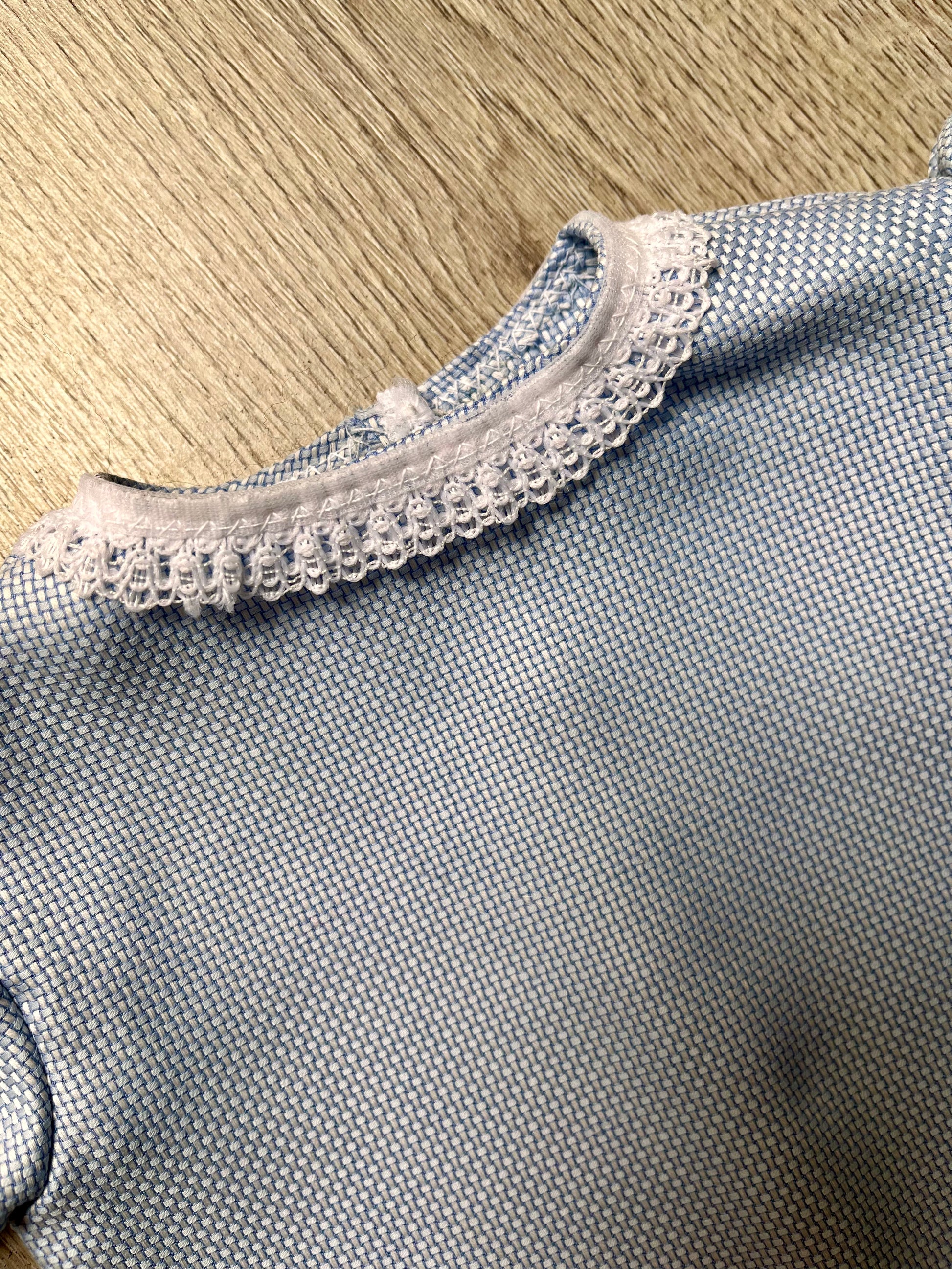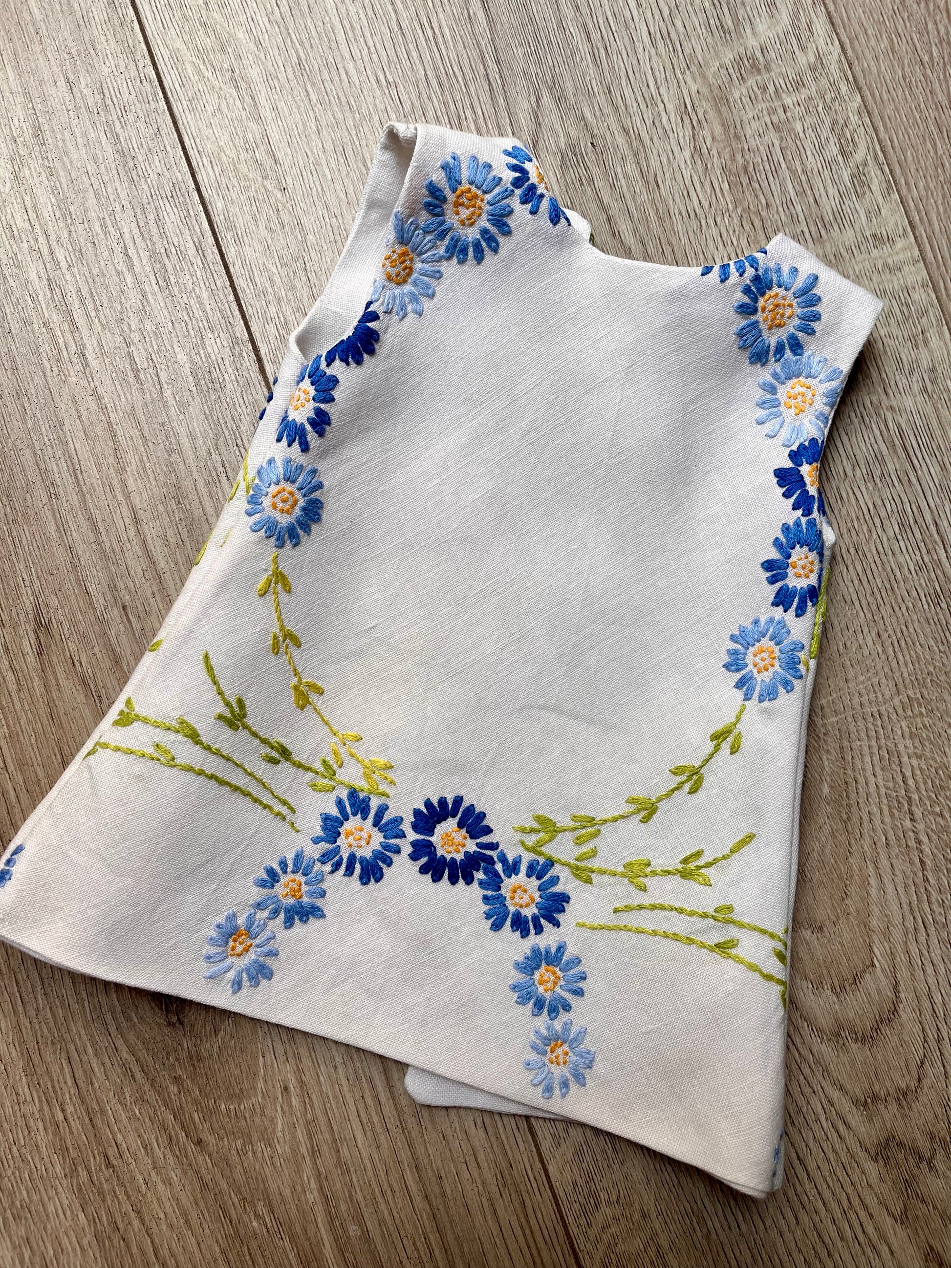This pinafore is made from beautiful, vintage, hand-embroidered table linen. It fastens with two sets of green gingham ribbons which have been carefully stitched on. The blouse is made from a lovely blue cotton fabric, has a lace collar, and a velcro opening. The pinafore can be worn on its own as a sundress or with the blouse as a pinafore - a mix-and-match set!