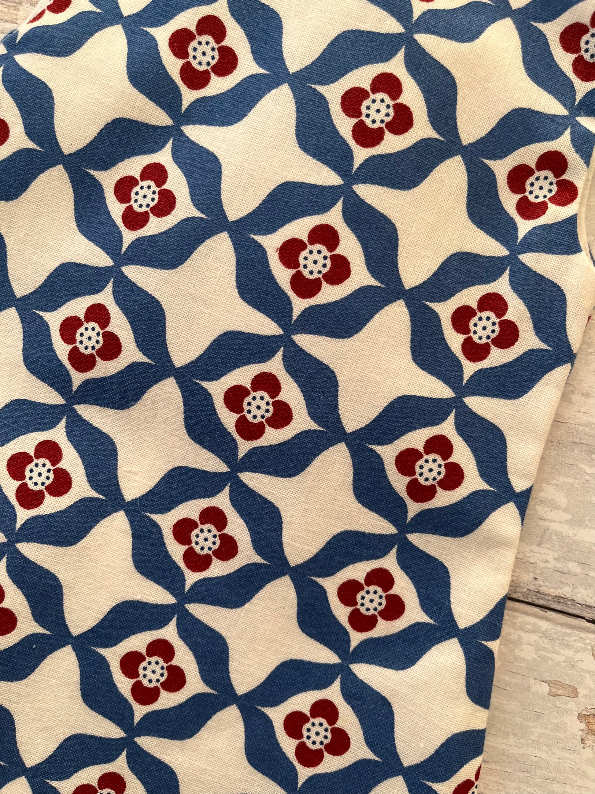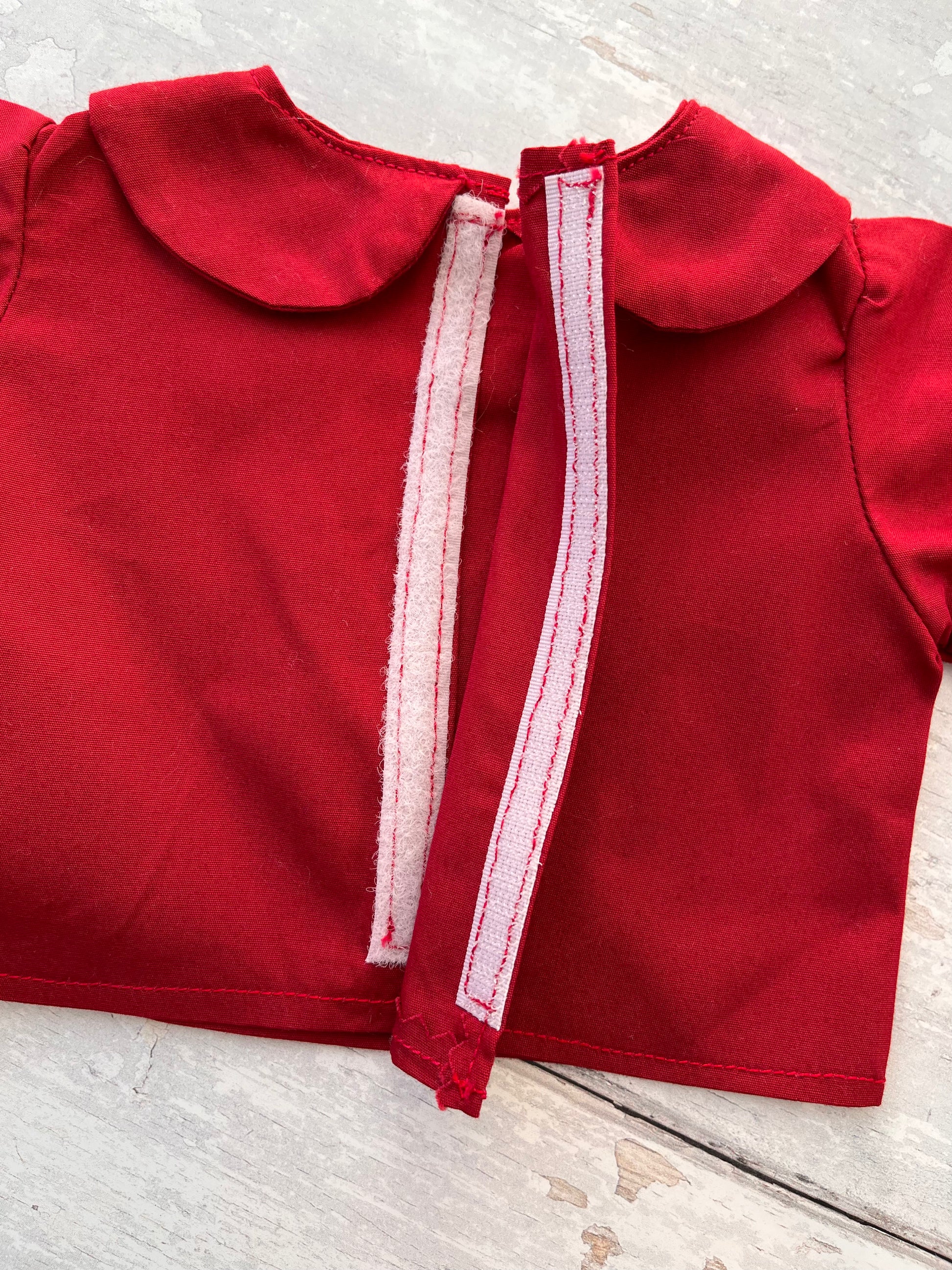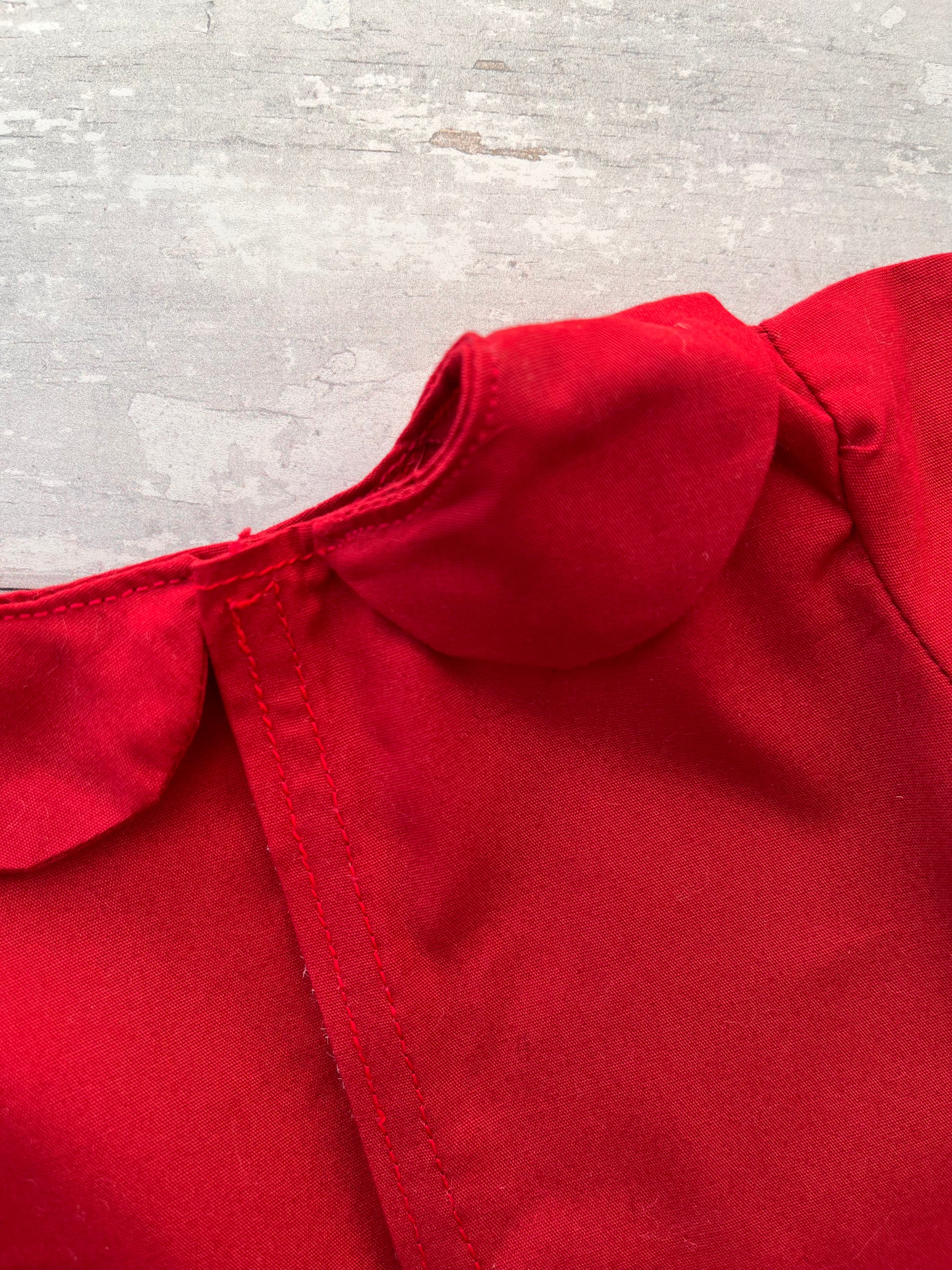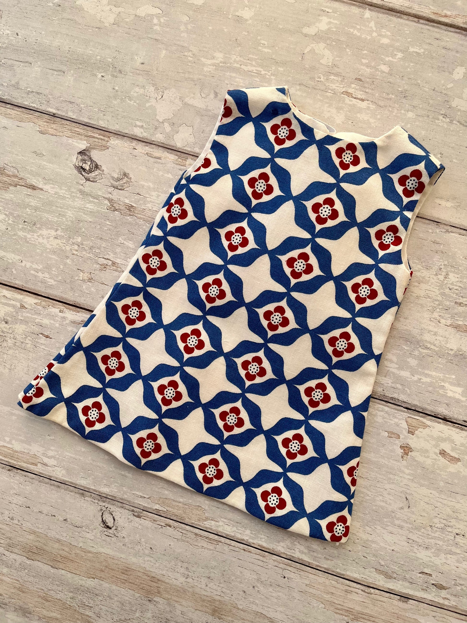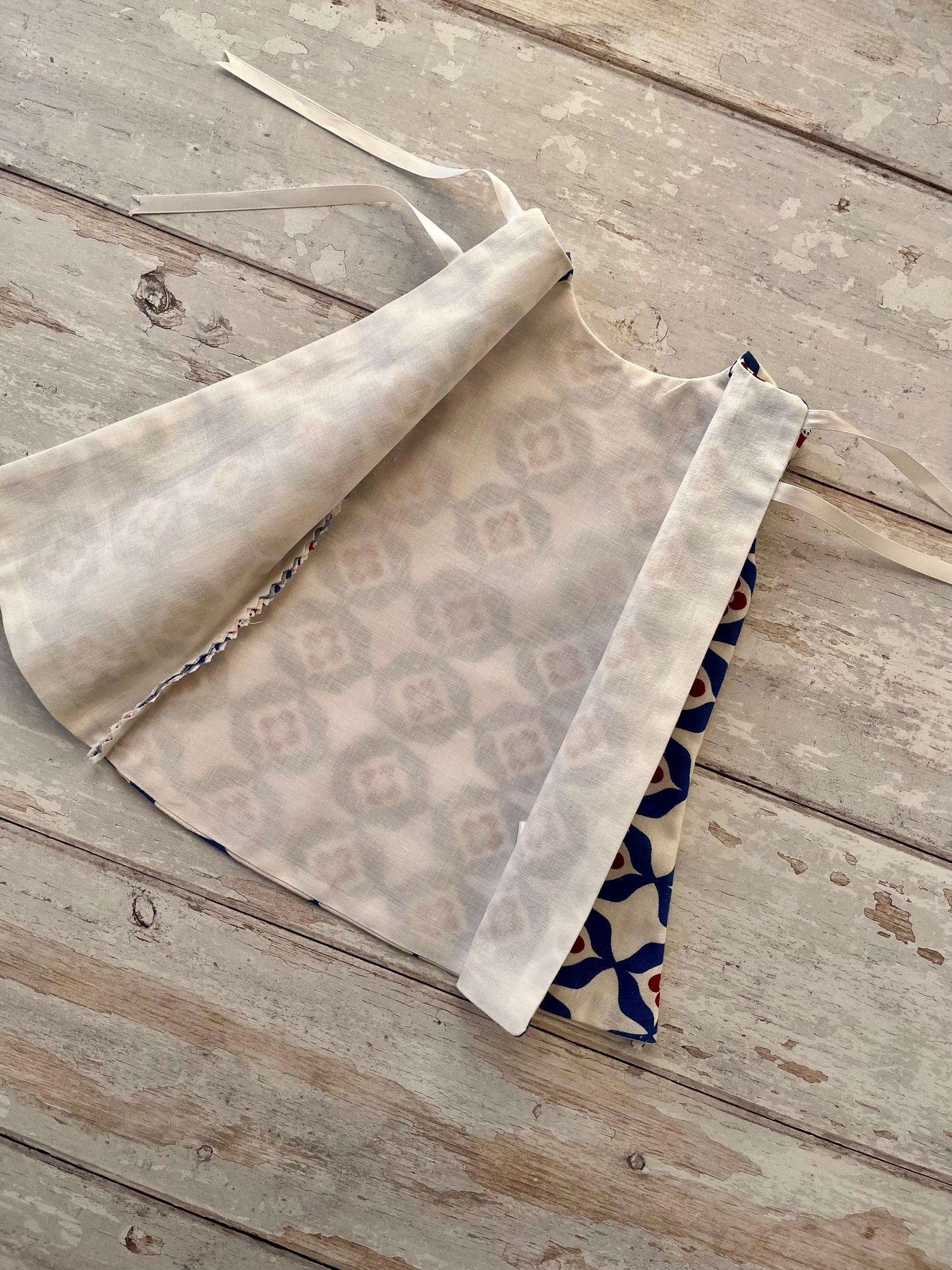 This pinafore is made from beautiful, bold-printed cotton. It fastens with two sets of white satin ribbons which have been carefully stitched on. The blouse is made from a lovely red cotton fabric, has a Peter Pan collar, long sleeves, and a velcro opening. The pinafore can be worn on its own as a sundress or with the blouse as a pinafore - a mix-and-match set!