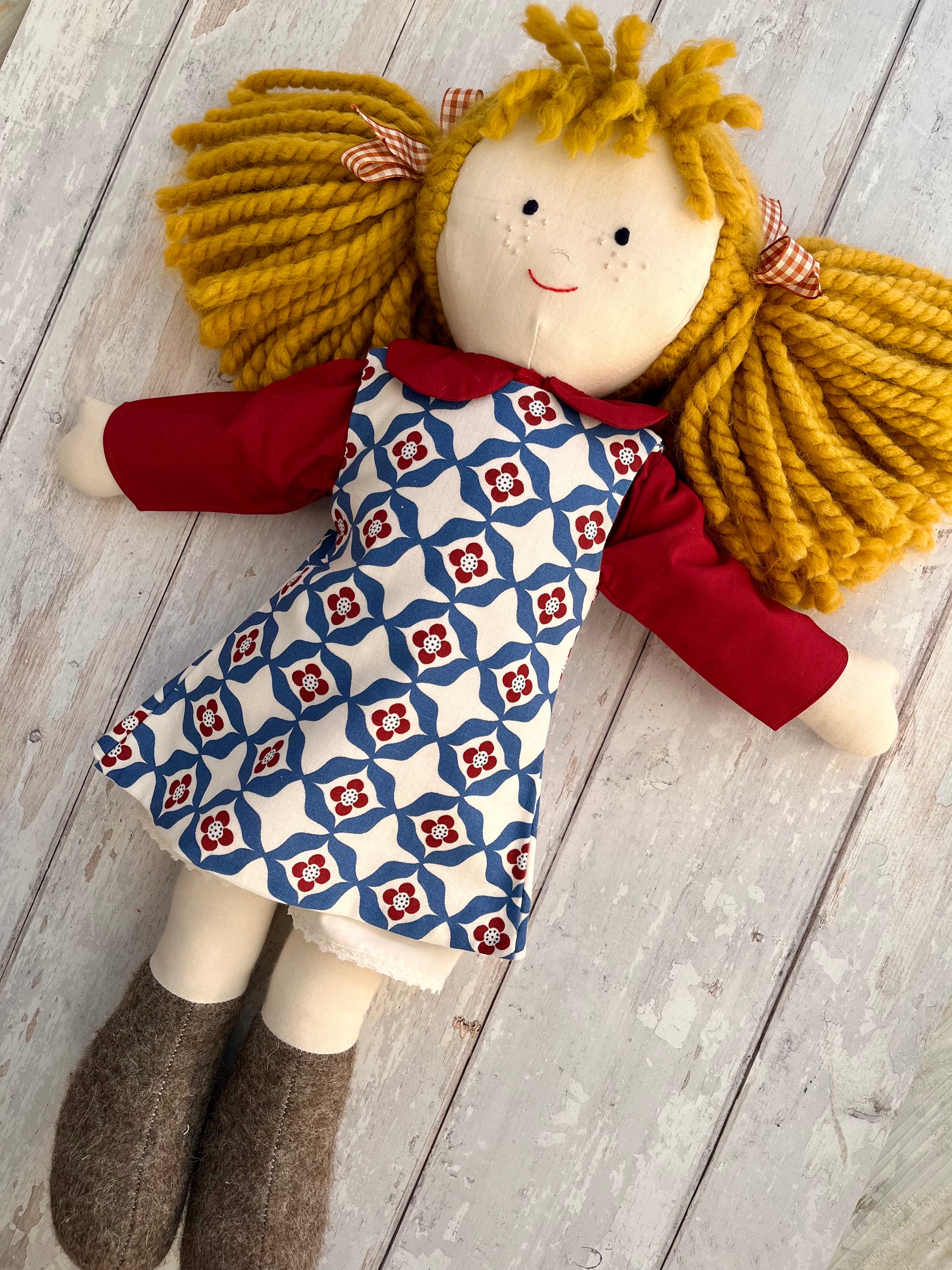 A lovely, handmade dolls pinafore dress and blouse set made by The Jemima Company to fit our own rag dolls but may well fit your own doll or toy. Have a look at our photographs to see full measurements of the garments.