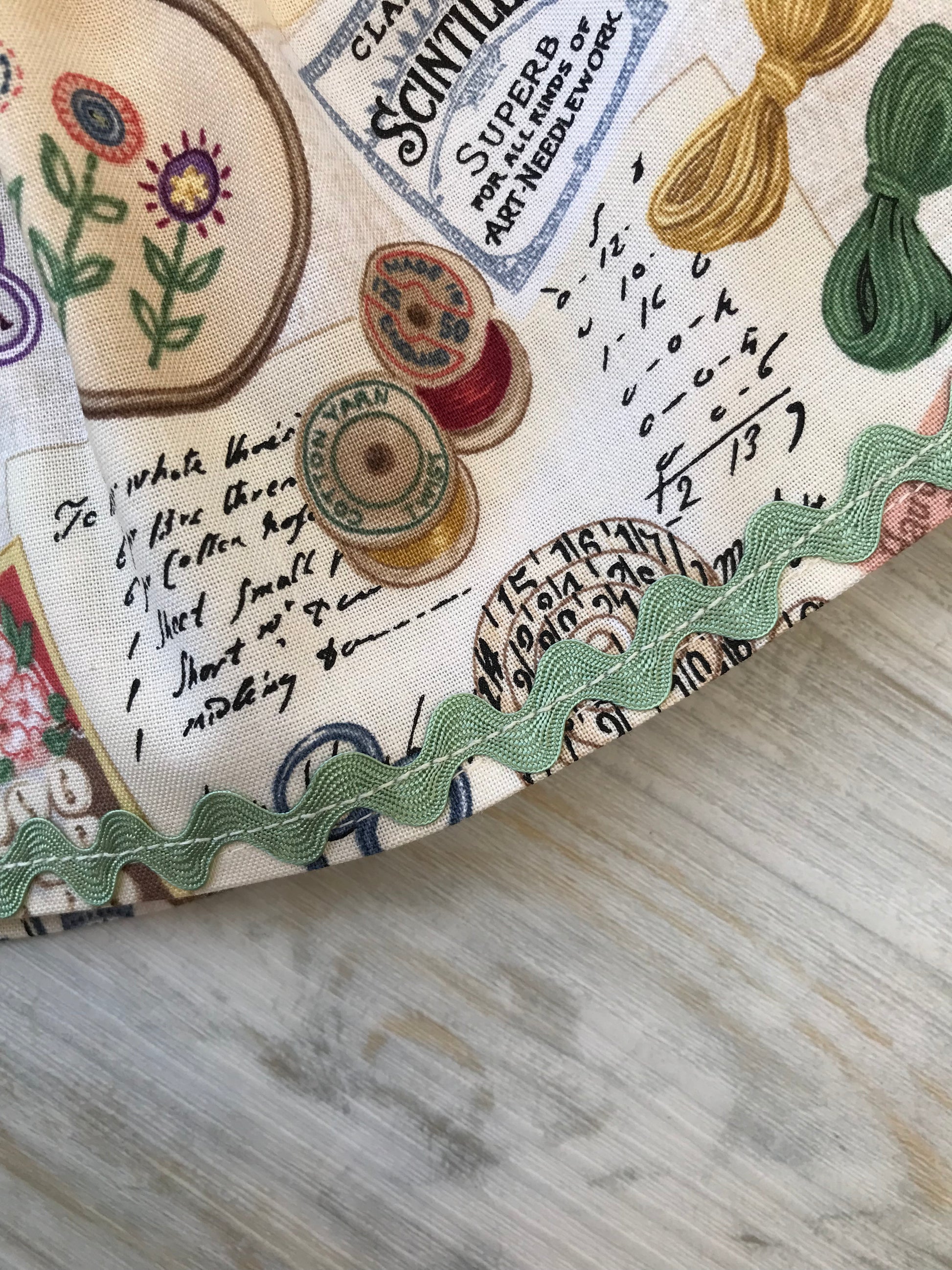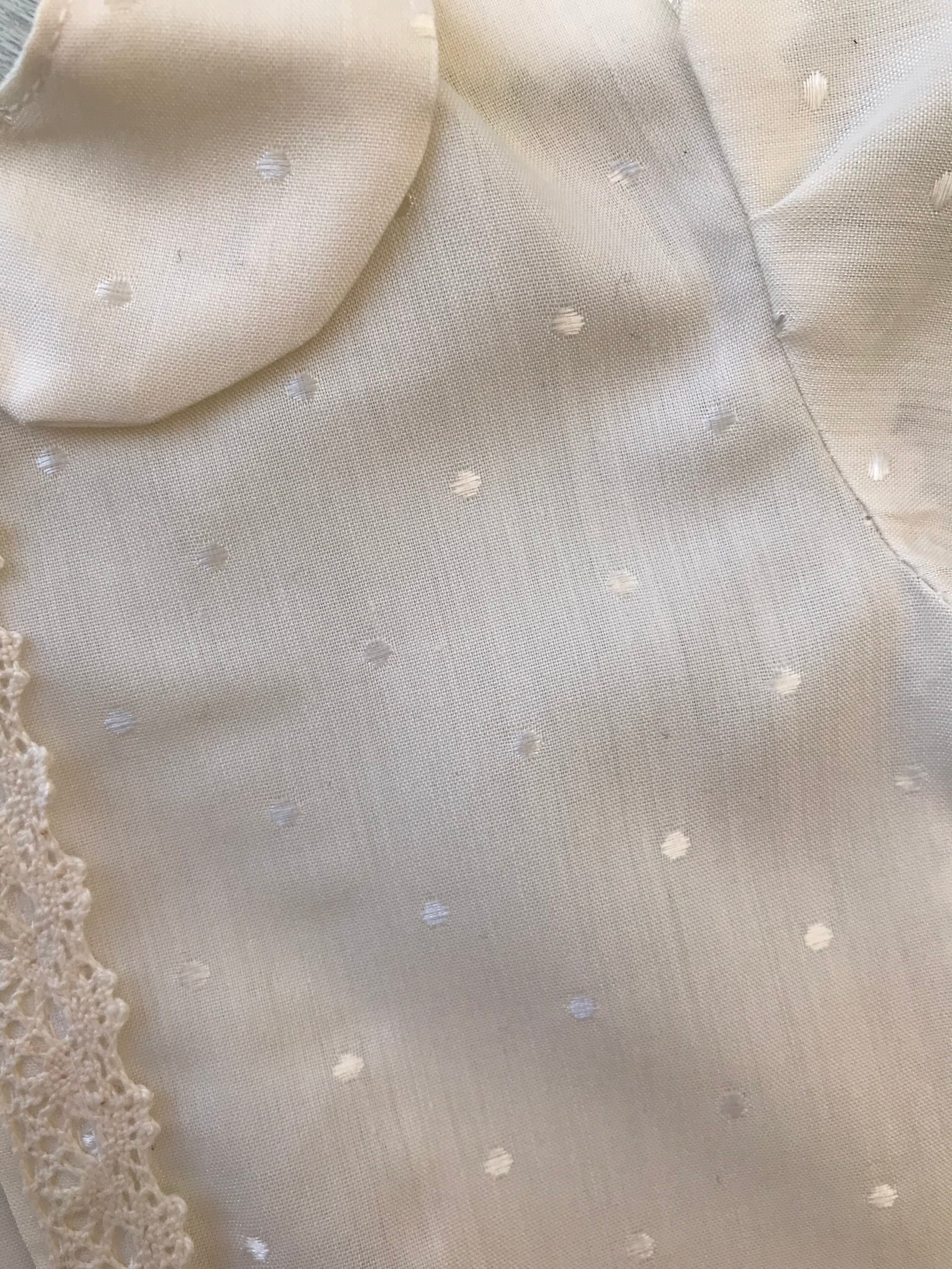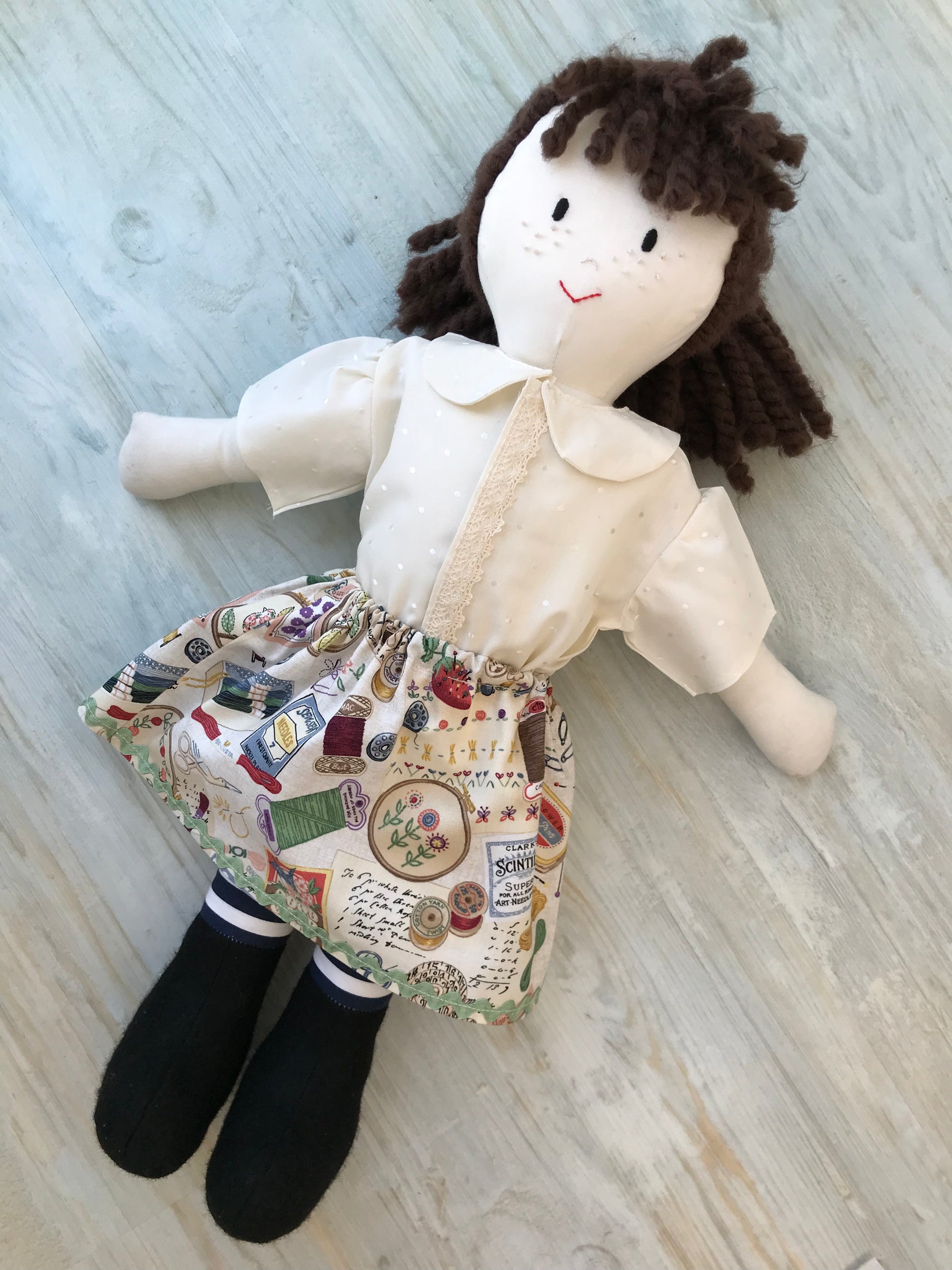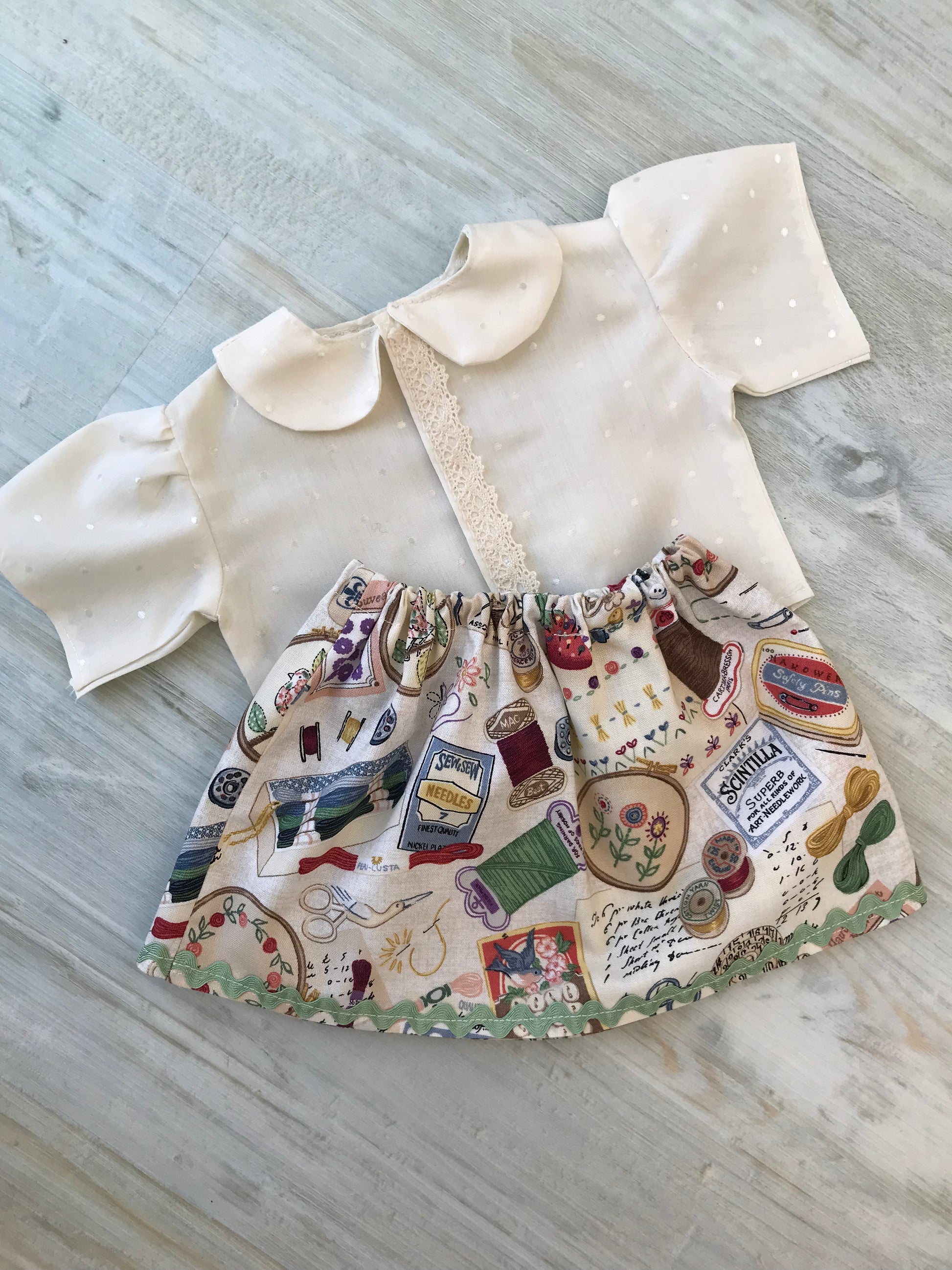 The blouse is made from a beautiful cream fabric with a shiny polka dot pattern. It has a Peter Pan collar, short sleeves, lace trim and velcro opening down the front. The skirt is made from a beautiful haberdashery print cotton fabric, with a ric-rac trim round the hem. It has an elasticated waist.