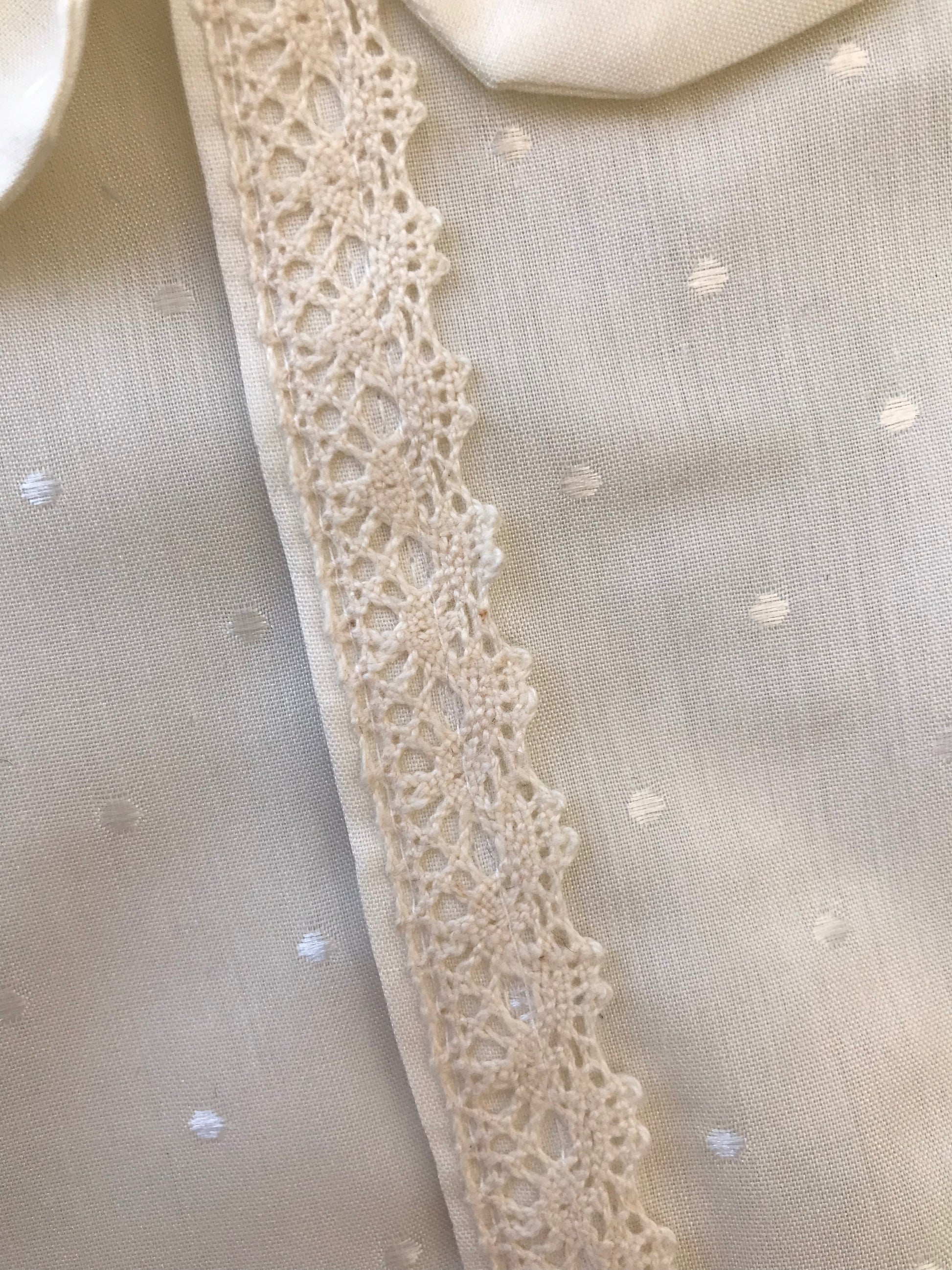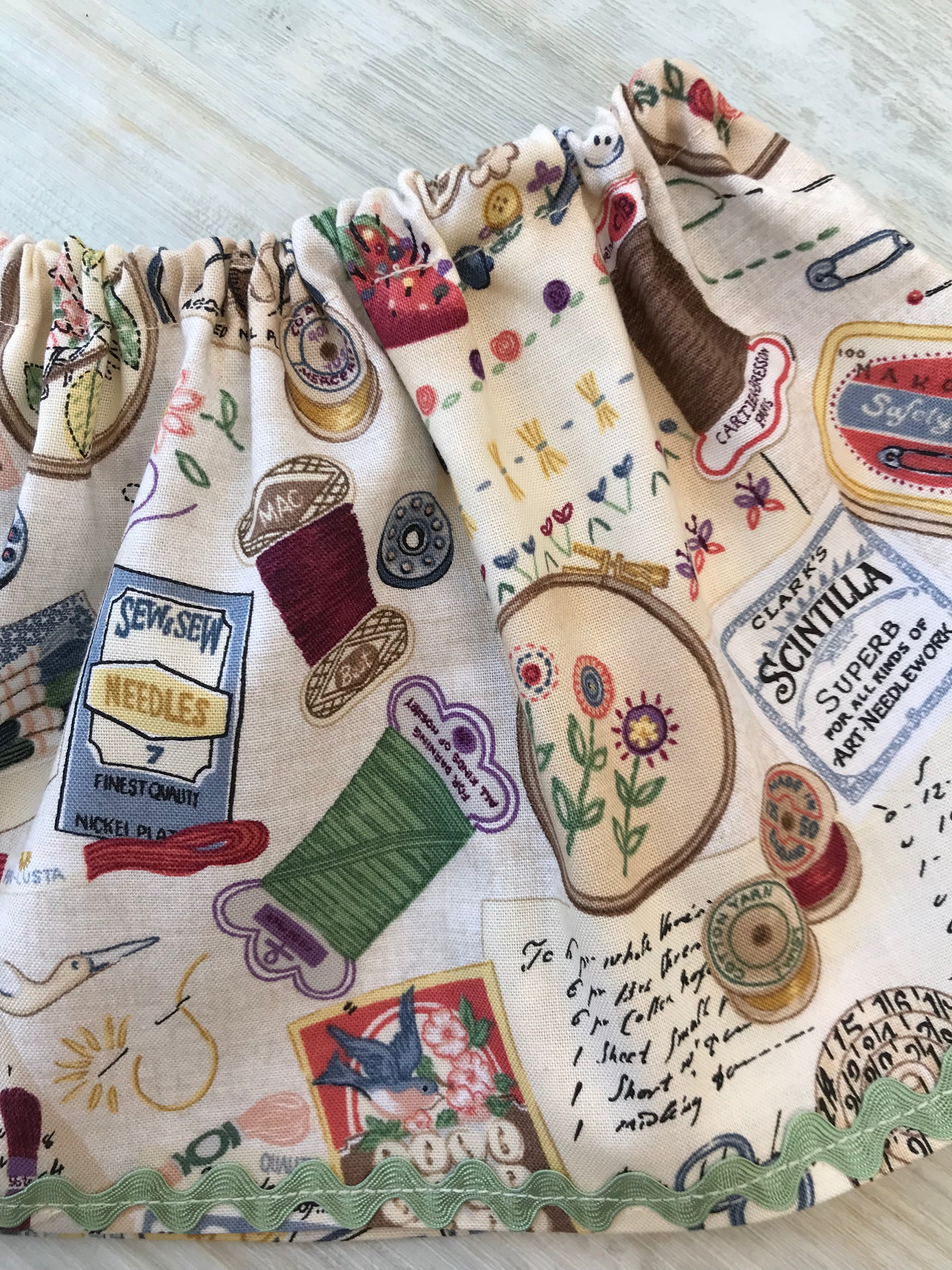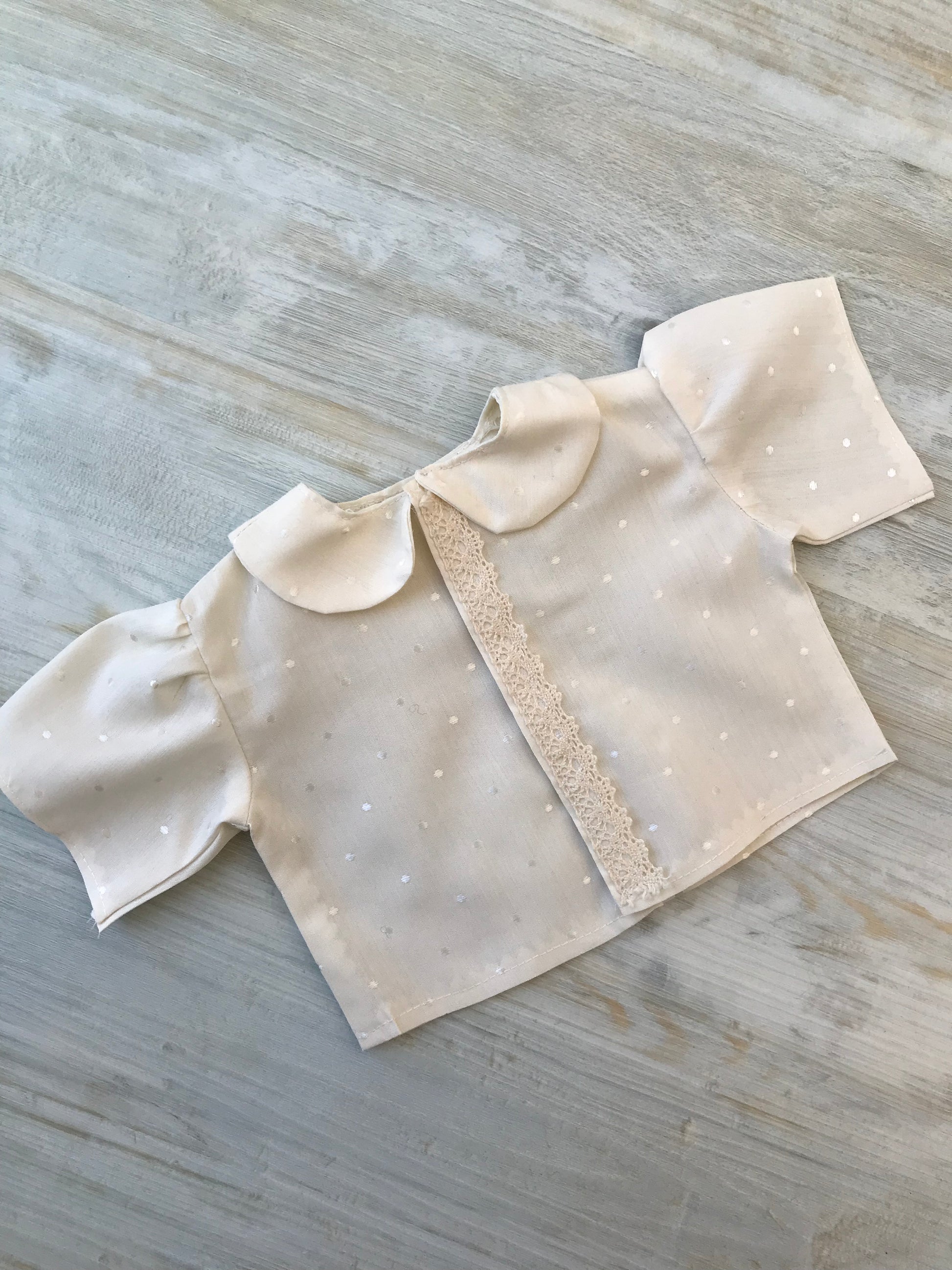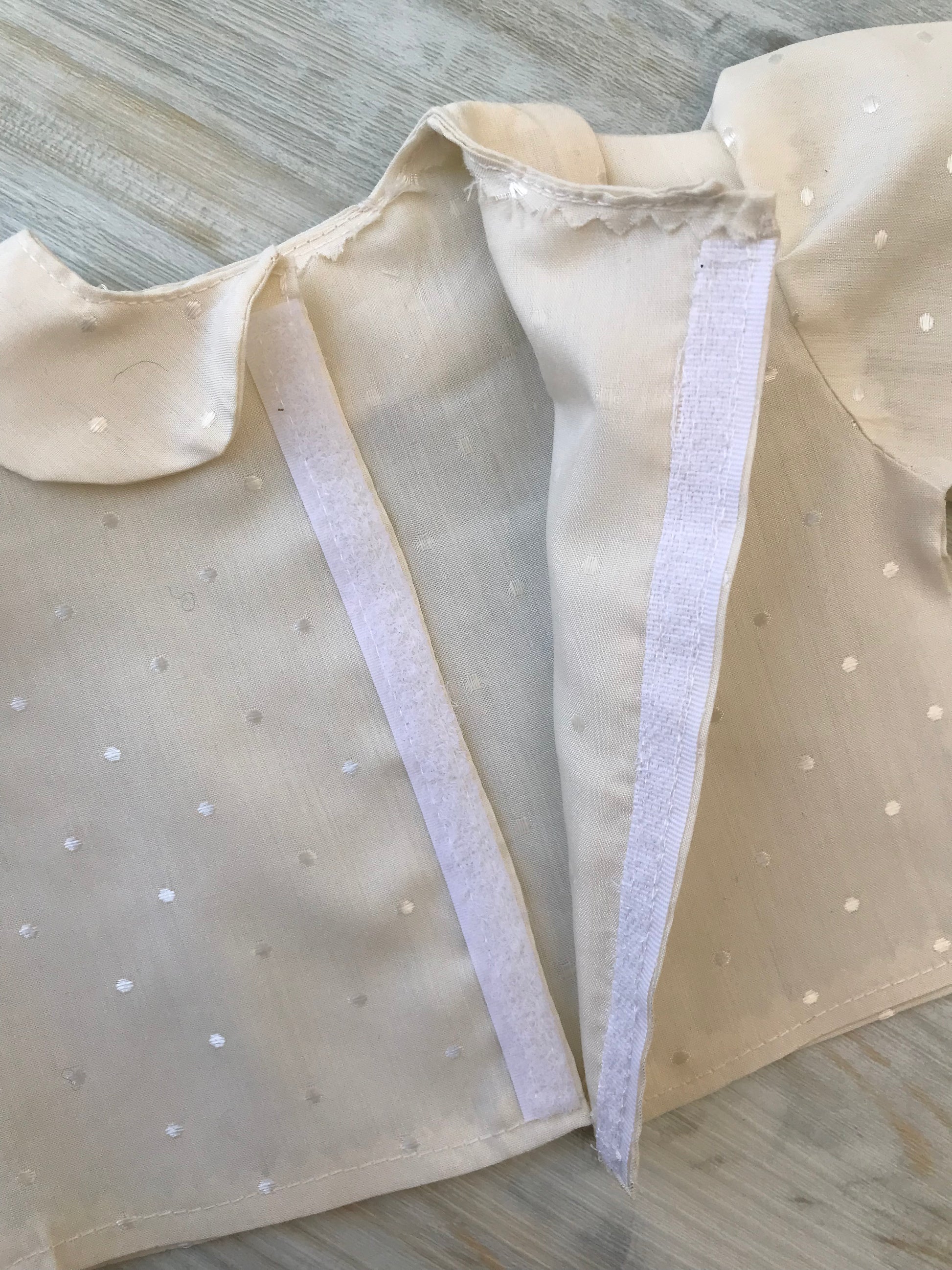 The blouse is made from a beautiful cream fabric with a shiny polka dot pattern. It has a Peter Pan collar, short sleeves, lace trim and velcro opening down the front. The skirt is made from a beautiful haberdashery print cotton fabric, with a ric-rac trim round the hem. It has an elasticated waist.