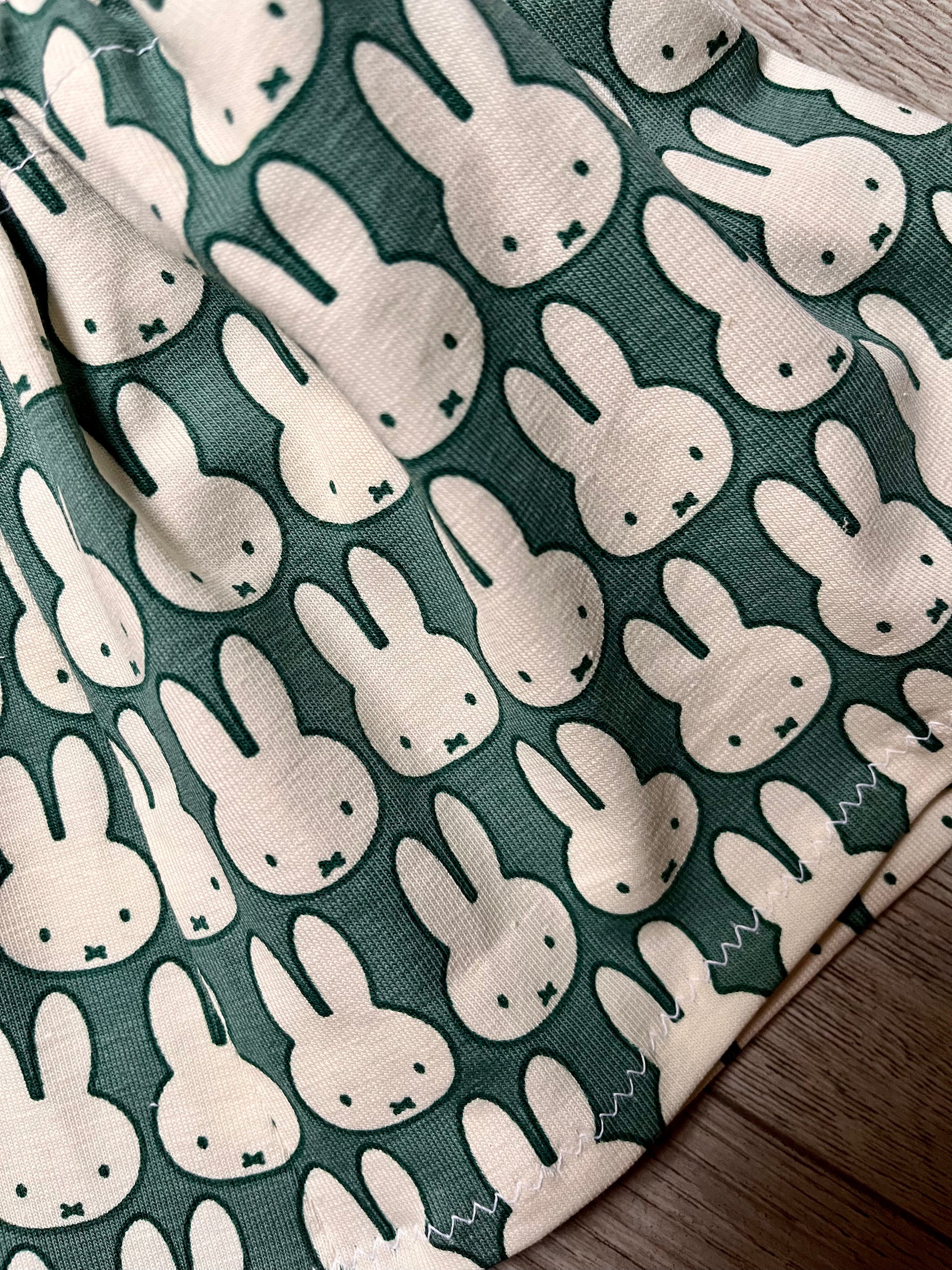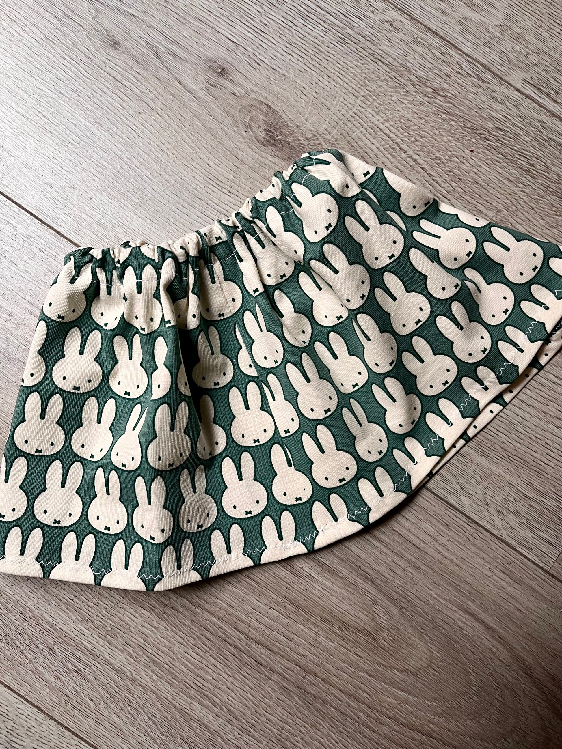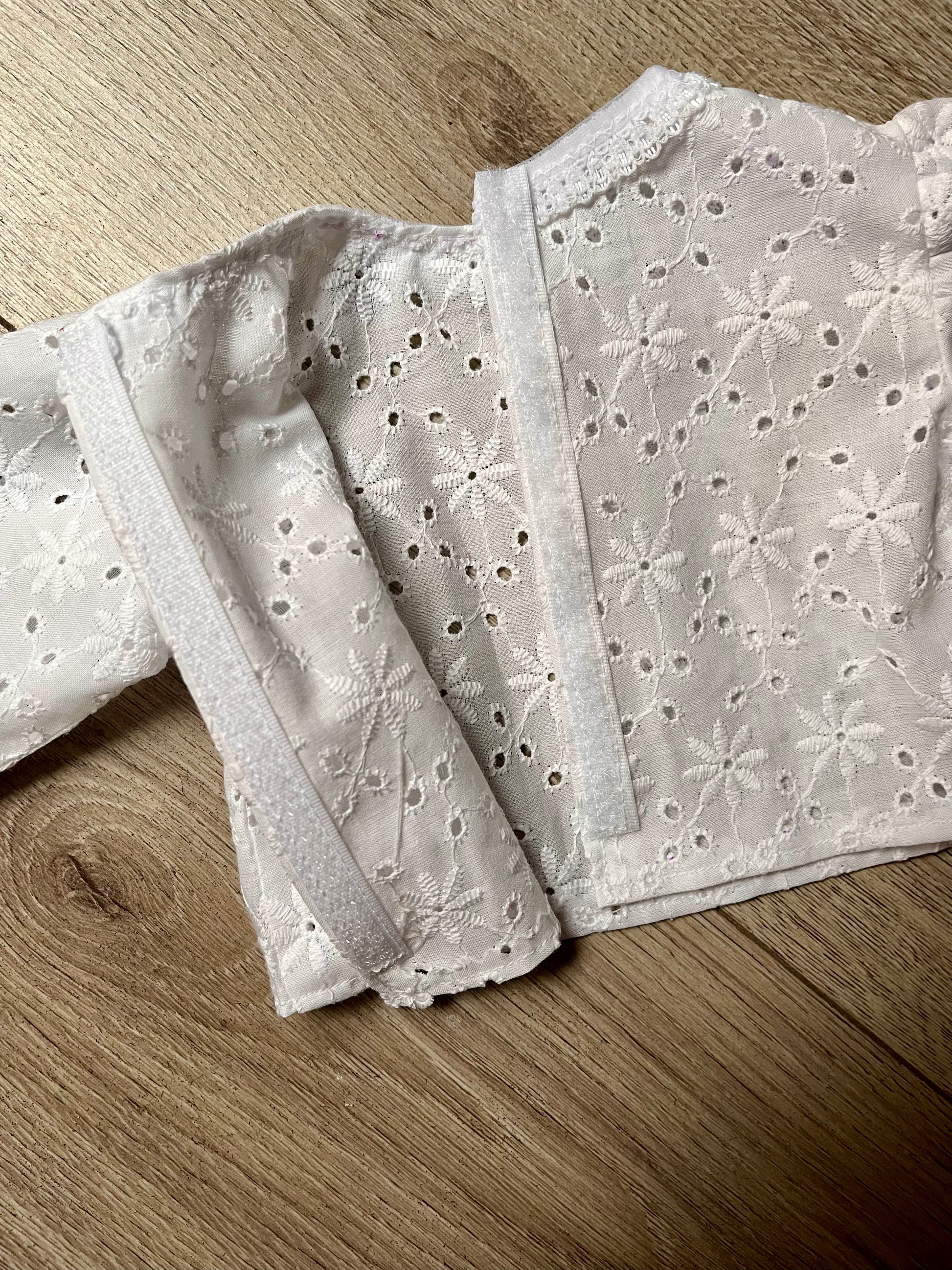 The blouse is made from a very pretty white cotton Broderie Anglaise, has a lace collar, long sleeves and a velcro opening down the front. The skirt is made from a lovely Miffy print cotton jersey fabric, and has an elasticated waist.