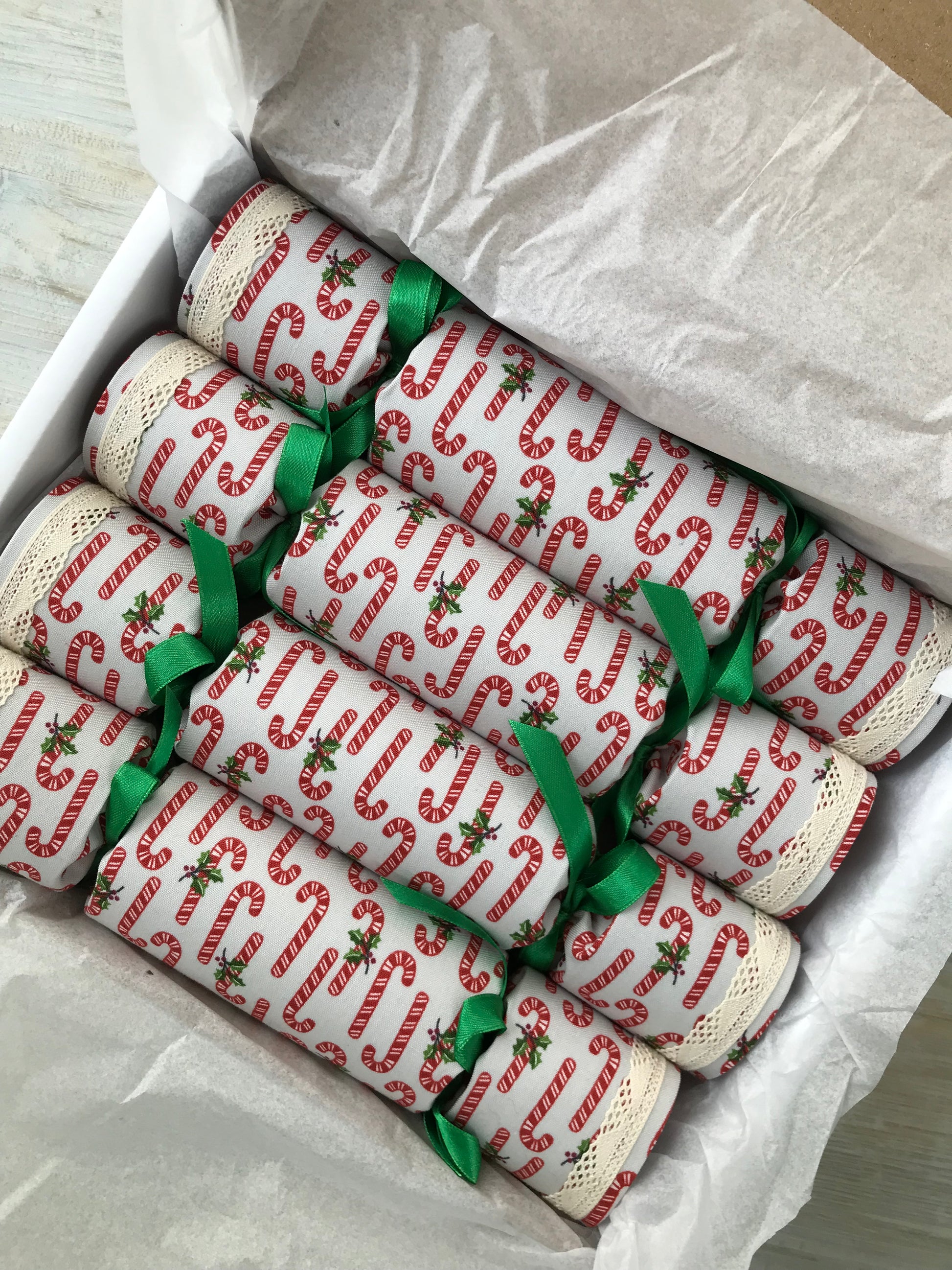 These crackers have been handmade by The Jemima Company from cotton fabric, and are stiffened with buckram. The crackers are made from a beautiful candy cane print cotton fabric, have cotton lace at each end, and are tied with green satin ribbon.
