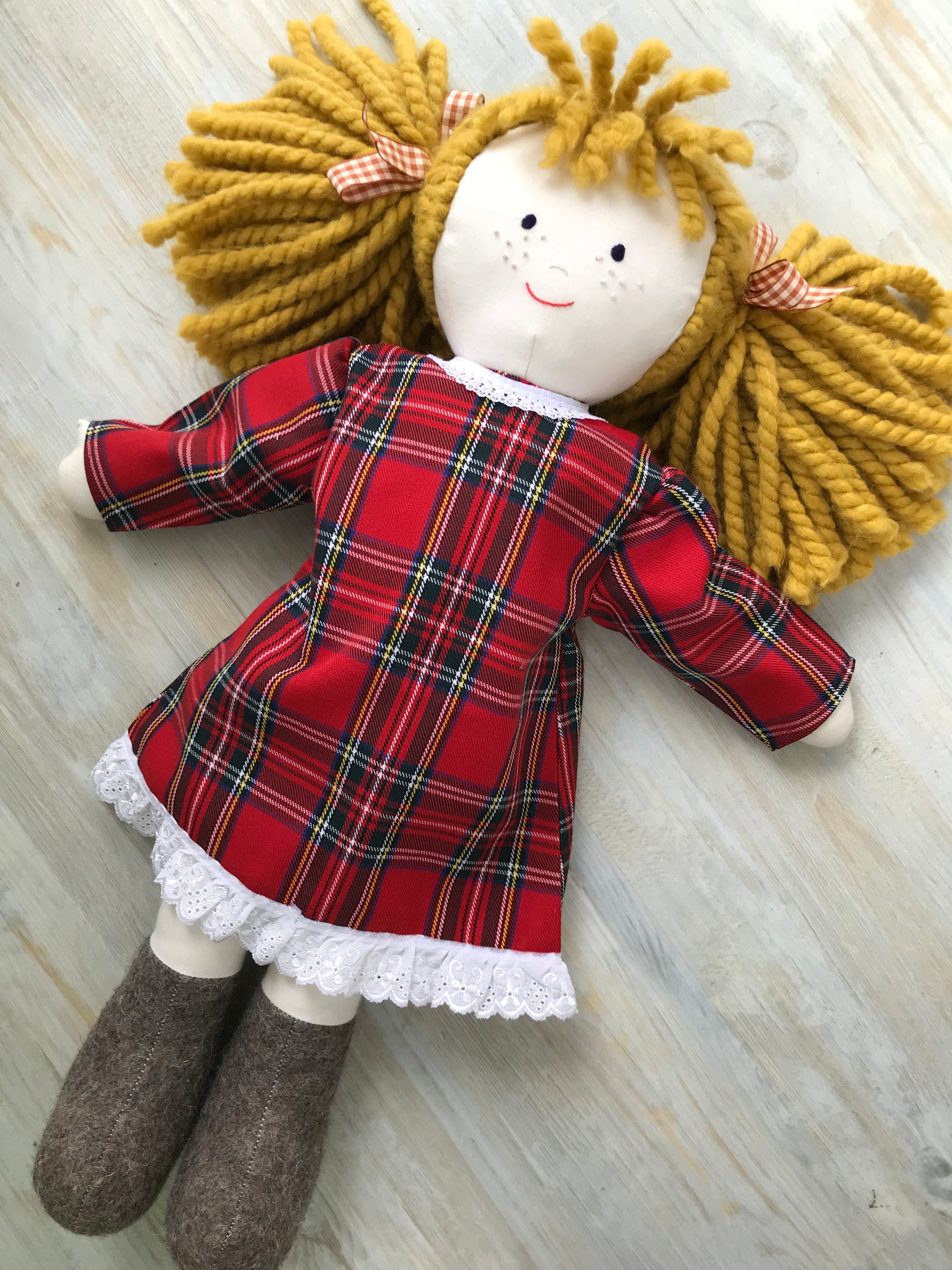 A beautiful tartan dress, made to fit The Jemima Company dolls but which may well fit your own doll, teddy or toy. Have a look at our photographs to see full measurements of the dress.