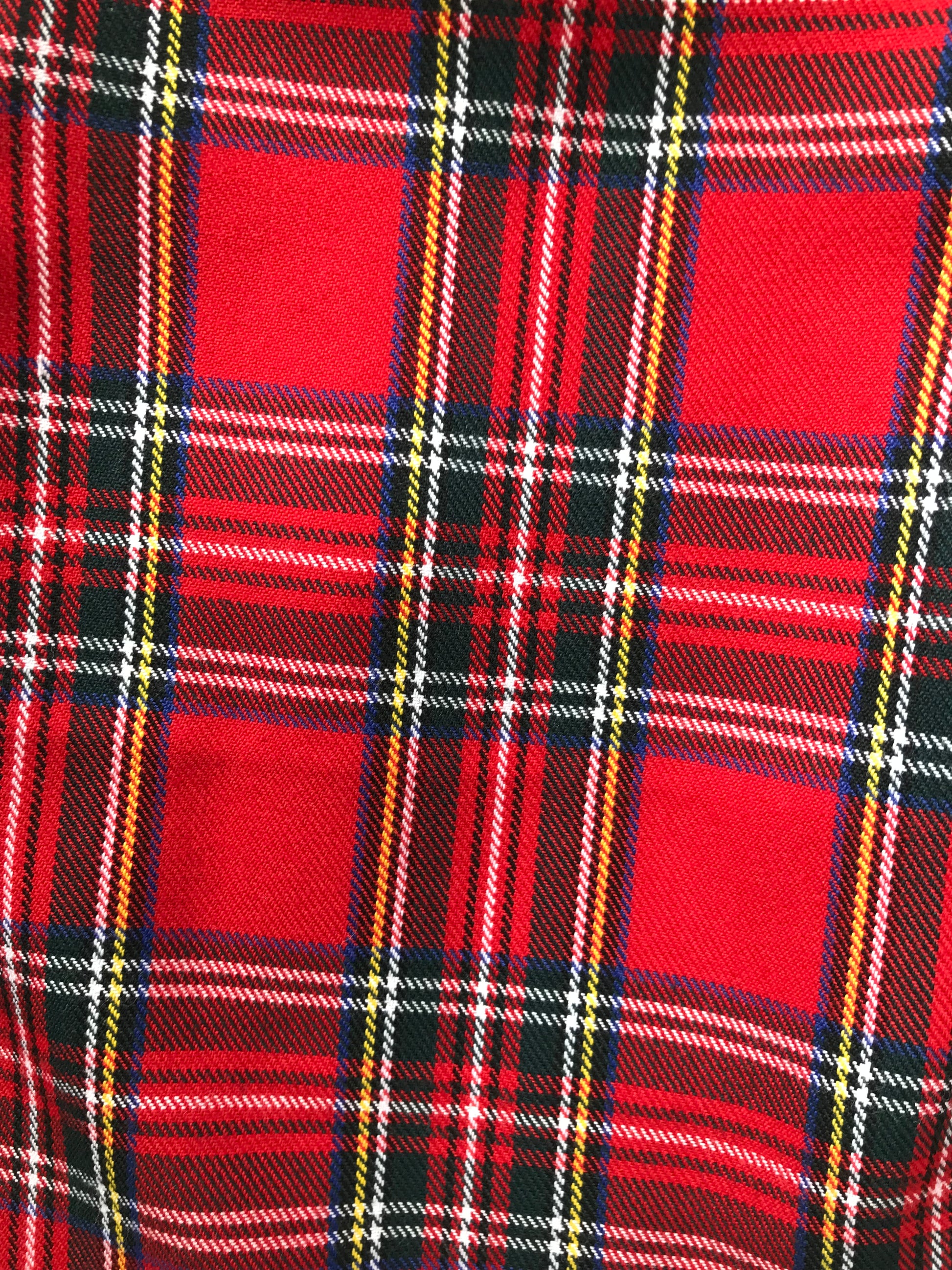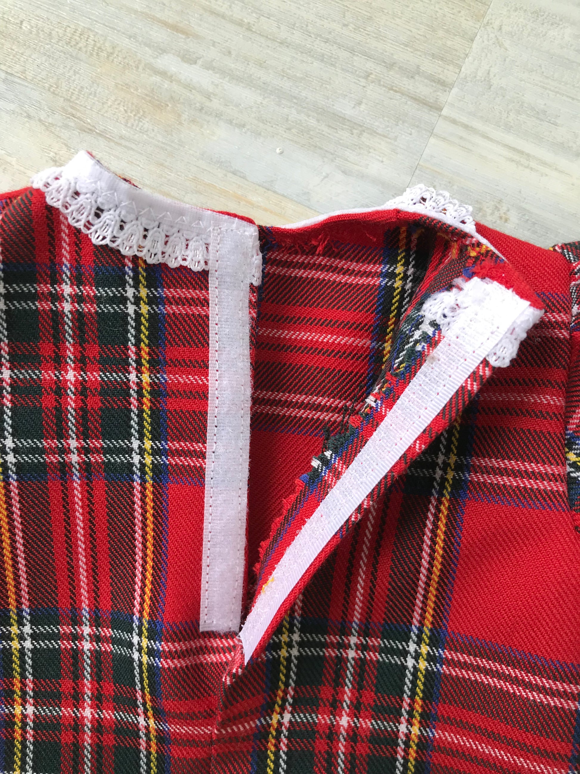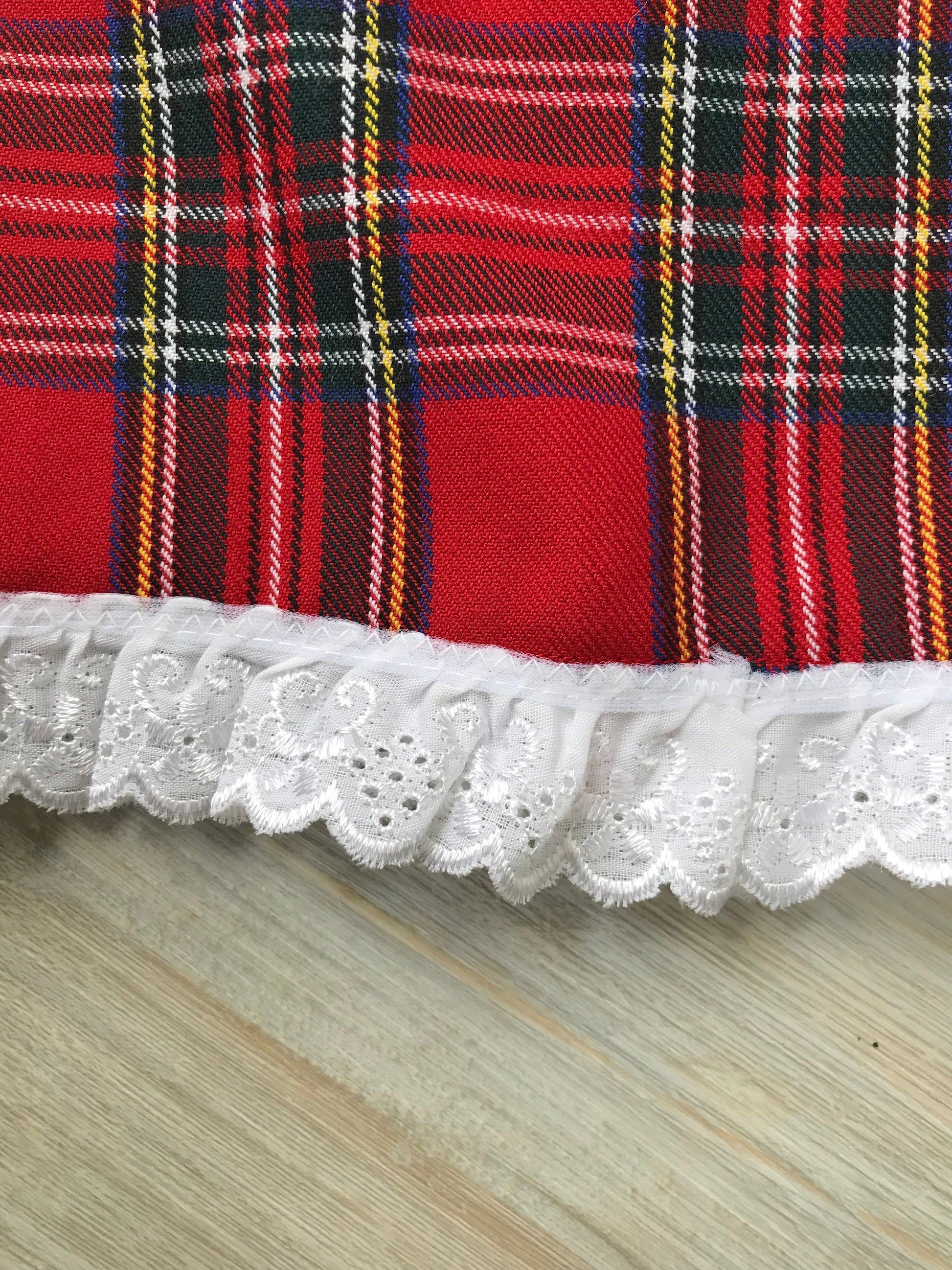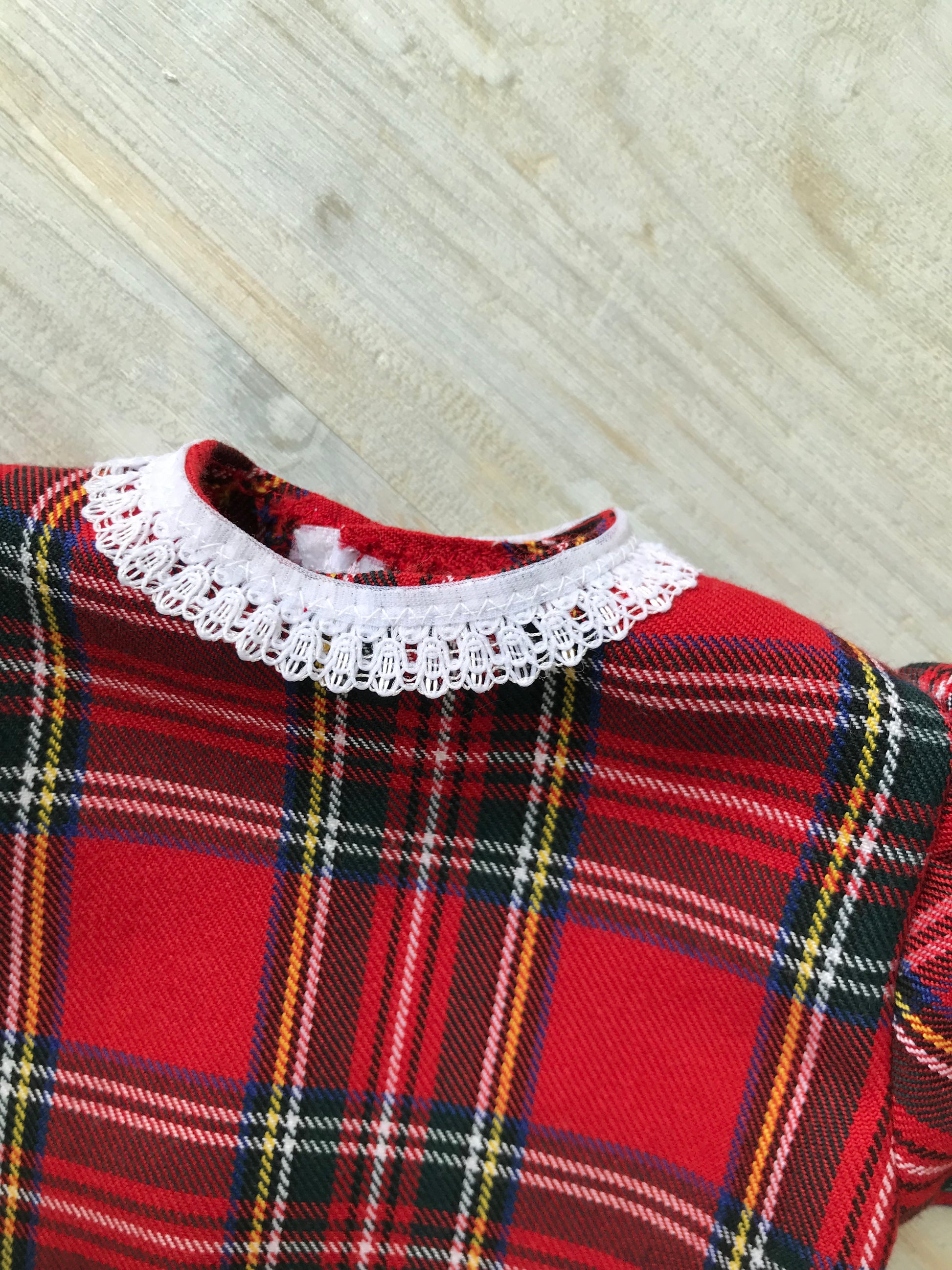 This beautiful dress has been handmade by The Jemima Company, from a Shepherd's Hut in a Scottish garden. The dress is made from Royal Stewart-style tartan, has long sleeves, a lace collar and a Broderie Anglaise trim around the hem. The back has a velcro opening.
