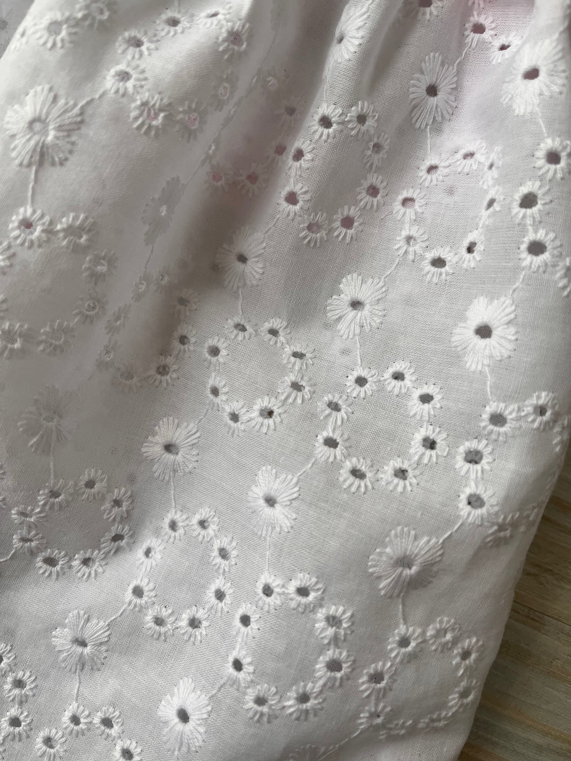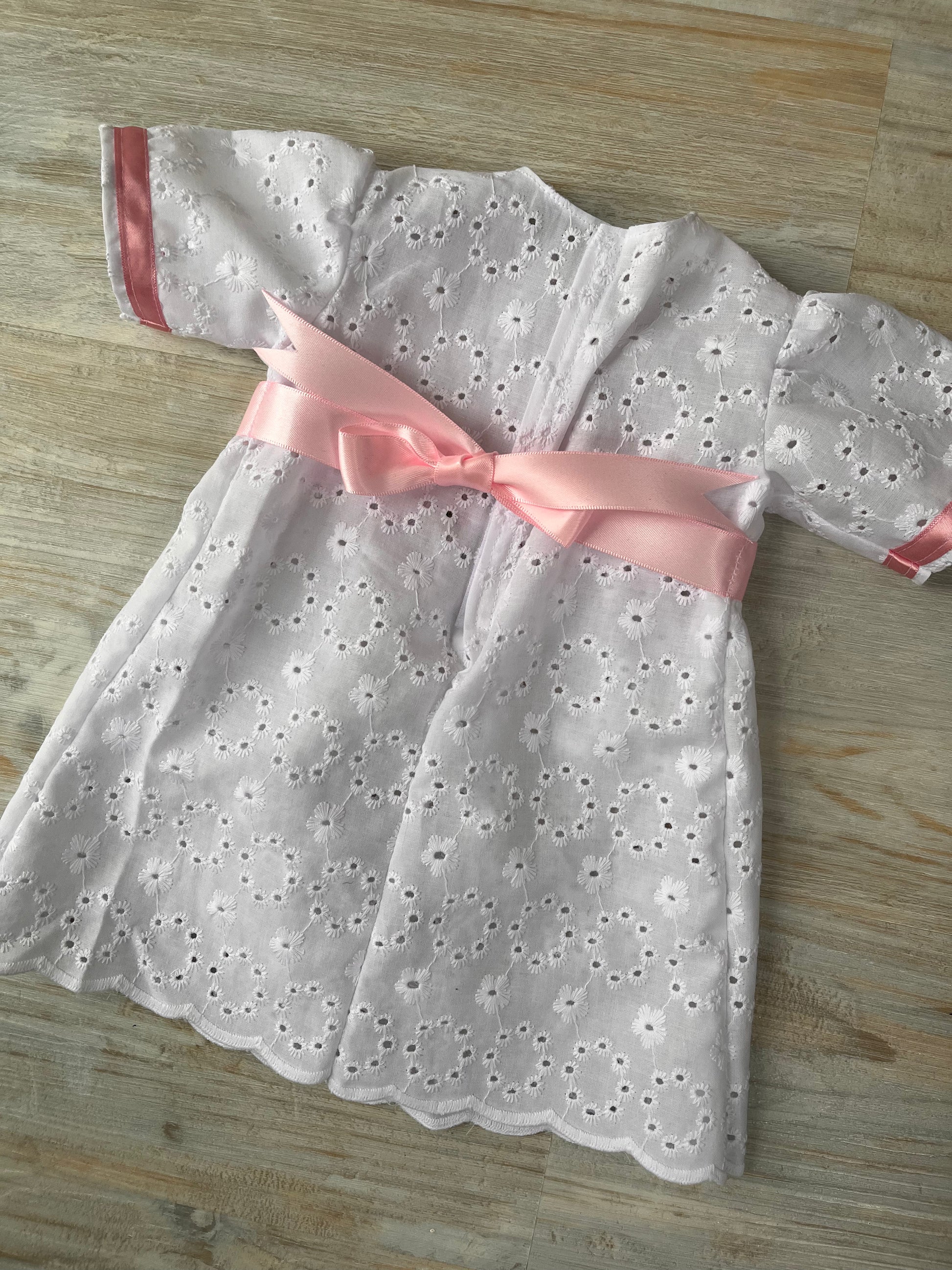 This dress is made from a beautiful Broderie Anglaise cotton fabric and has a lovely scalloped hemline. There is pink ribbon on the sleeves, an embroidered flower trim down the front of the bodice, and a pink ribbon sash. A perfect dress for any doll! There is a velcro opening at the back of the dress and the dress can be hand- or machine-washed.